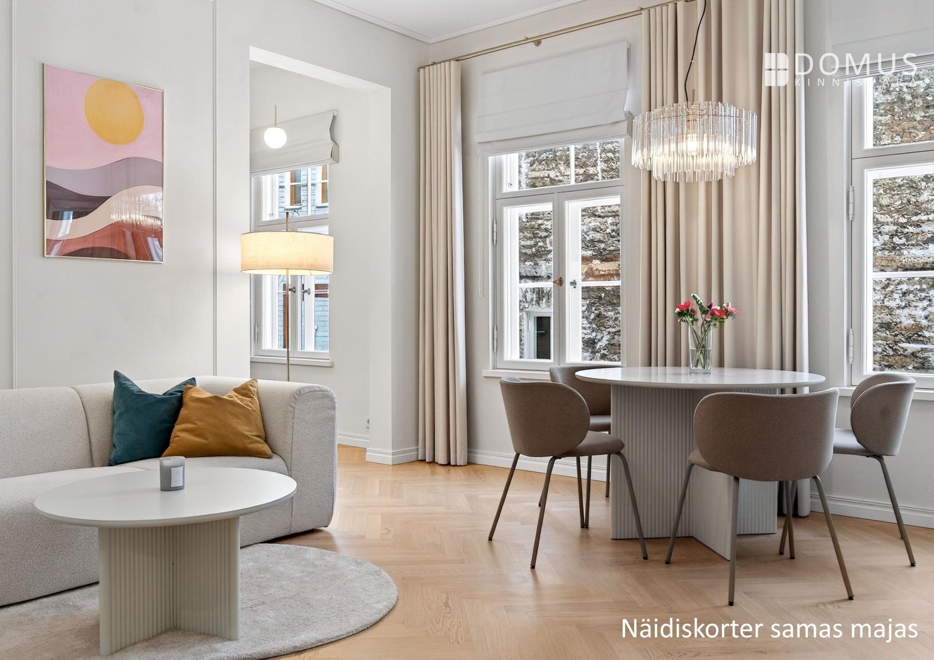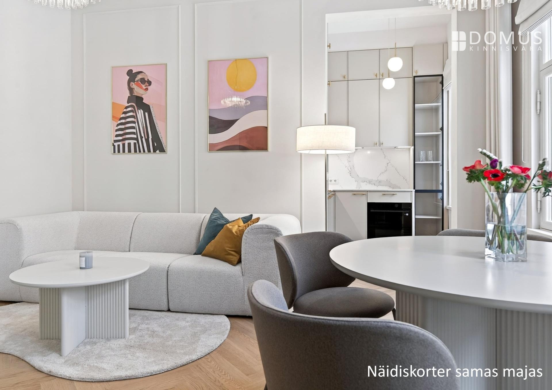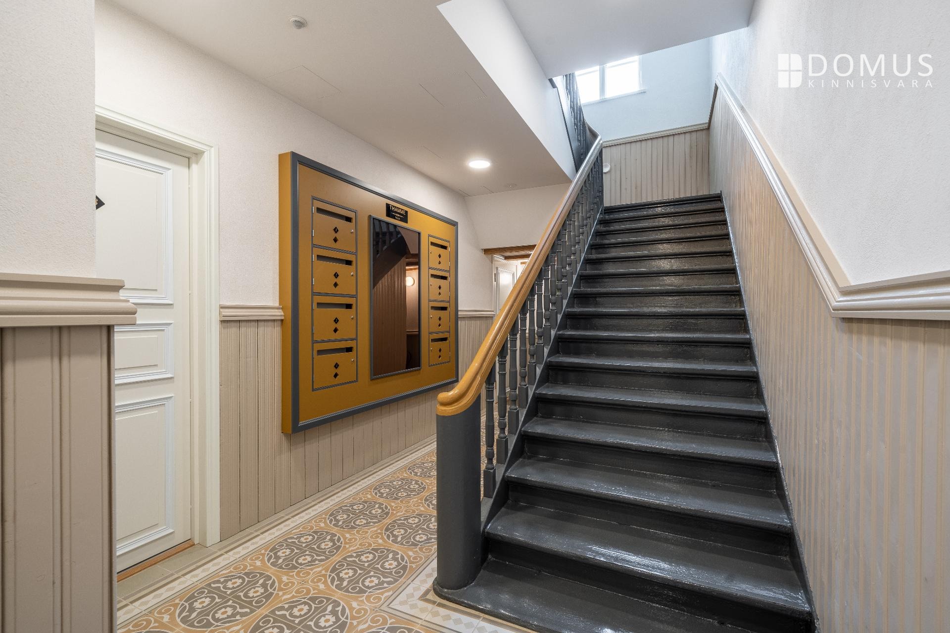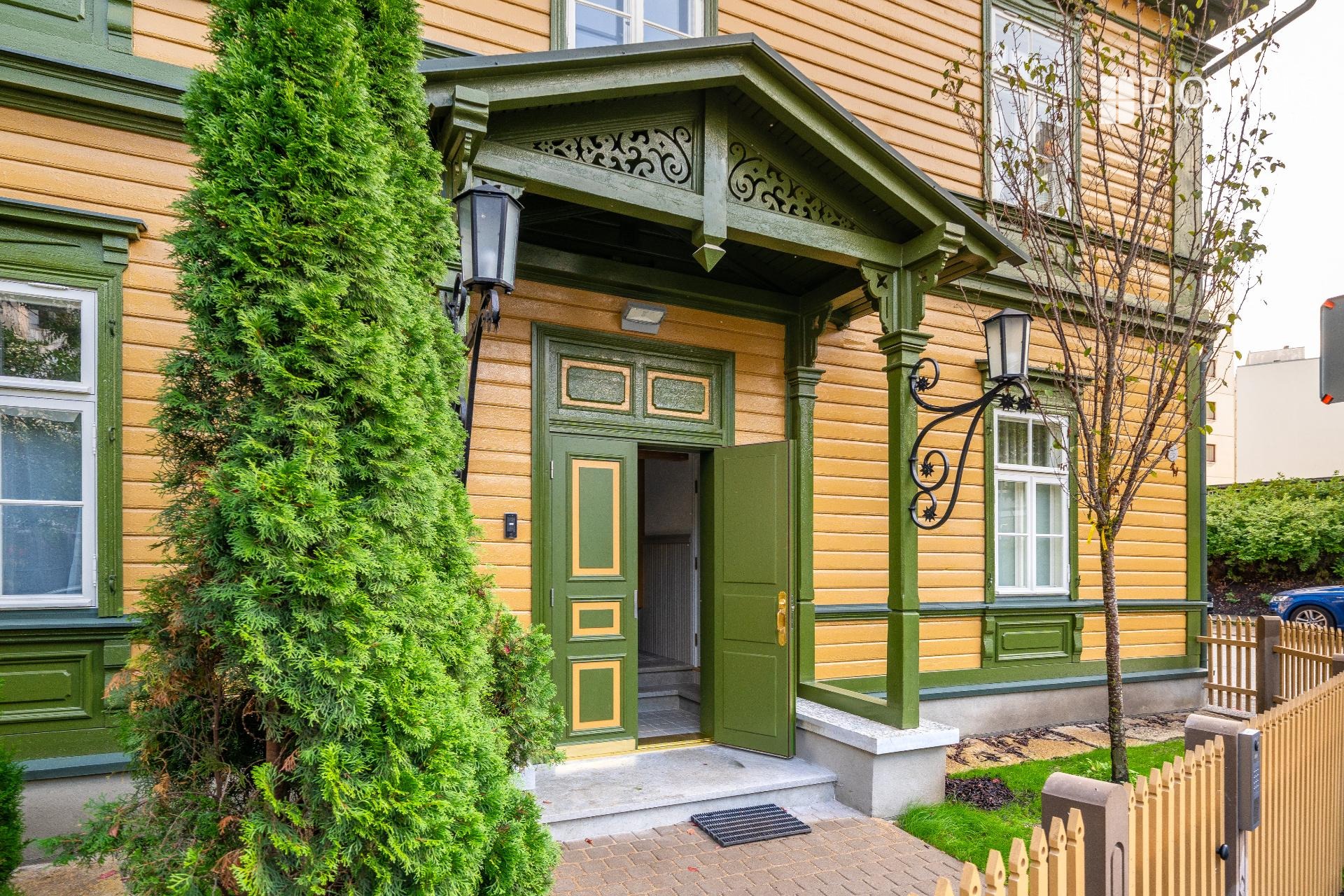 Muinsuskaitsealusele majale väärikalt rõhutasime selle ajastut kvaliteetsete materjalidega tänapäevases võtmes. Puitparkett kalasabamustris, puitlaudis esikuseintel ja elutoa laes, ehisdetailidega keraamilised plaadid vannitoas. Korteri seinu katab samuti looduslik materjal - lubikrohv, mis jätab kergelt struktuurse lõpptulemuse ja on omaette vaatamist väärt.
