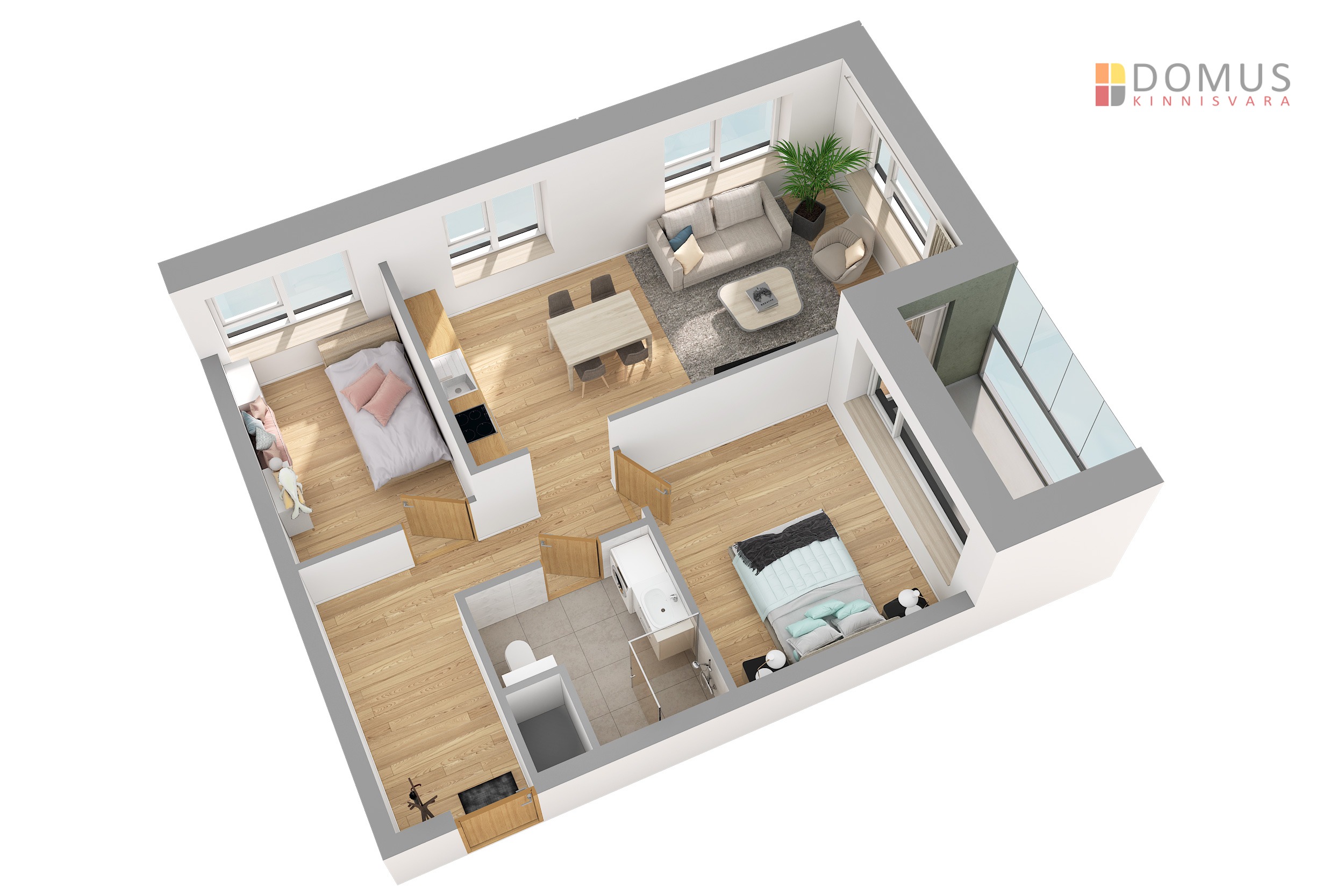 3-toalline korter on 58,9 m², millele lisandub rõdu 4,7 m². Rõdu on kinnine klaasidega. Korteri juurde kuulub panipaik 2,5 m².