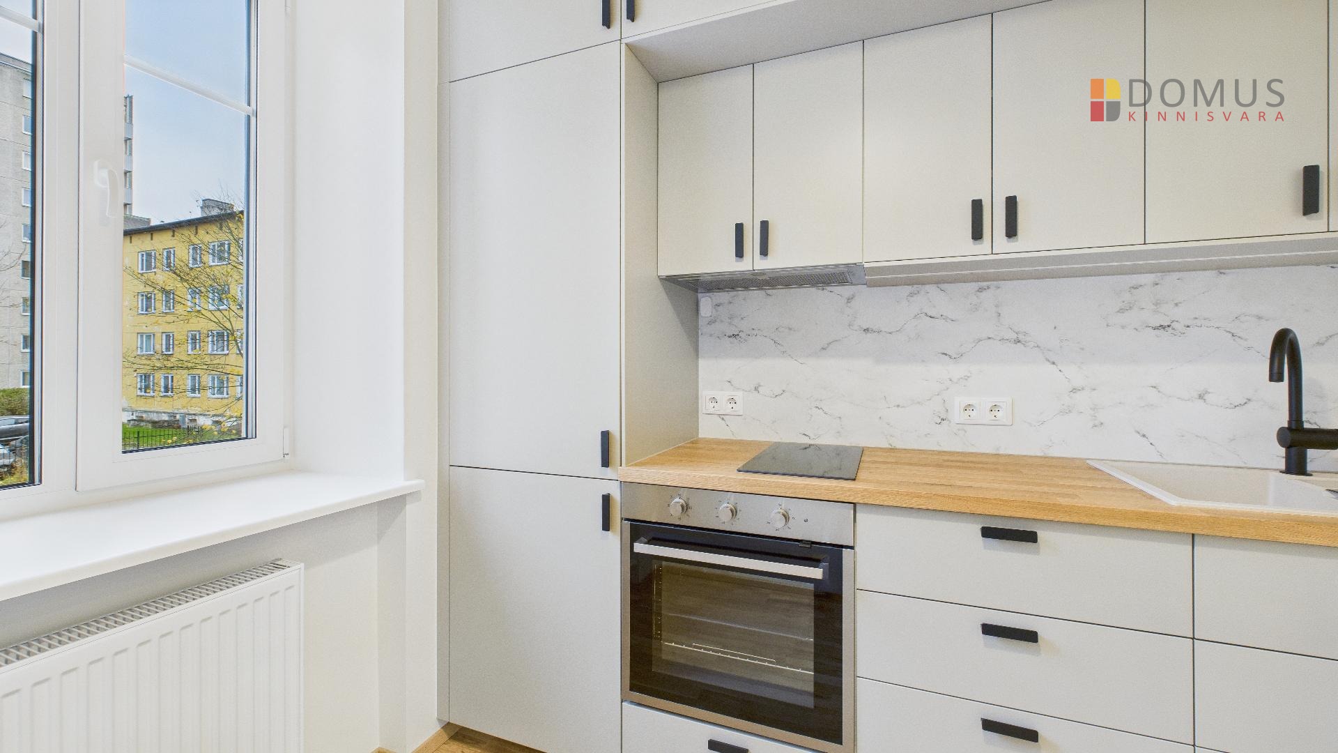 Köögimööbel koos tehnikaga on värskelt paigaldatud ja kasutusvalmis.