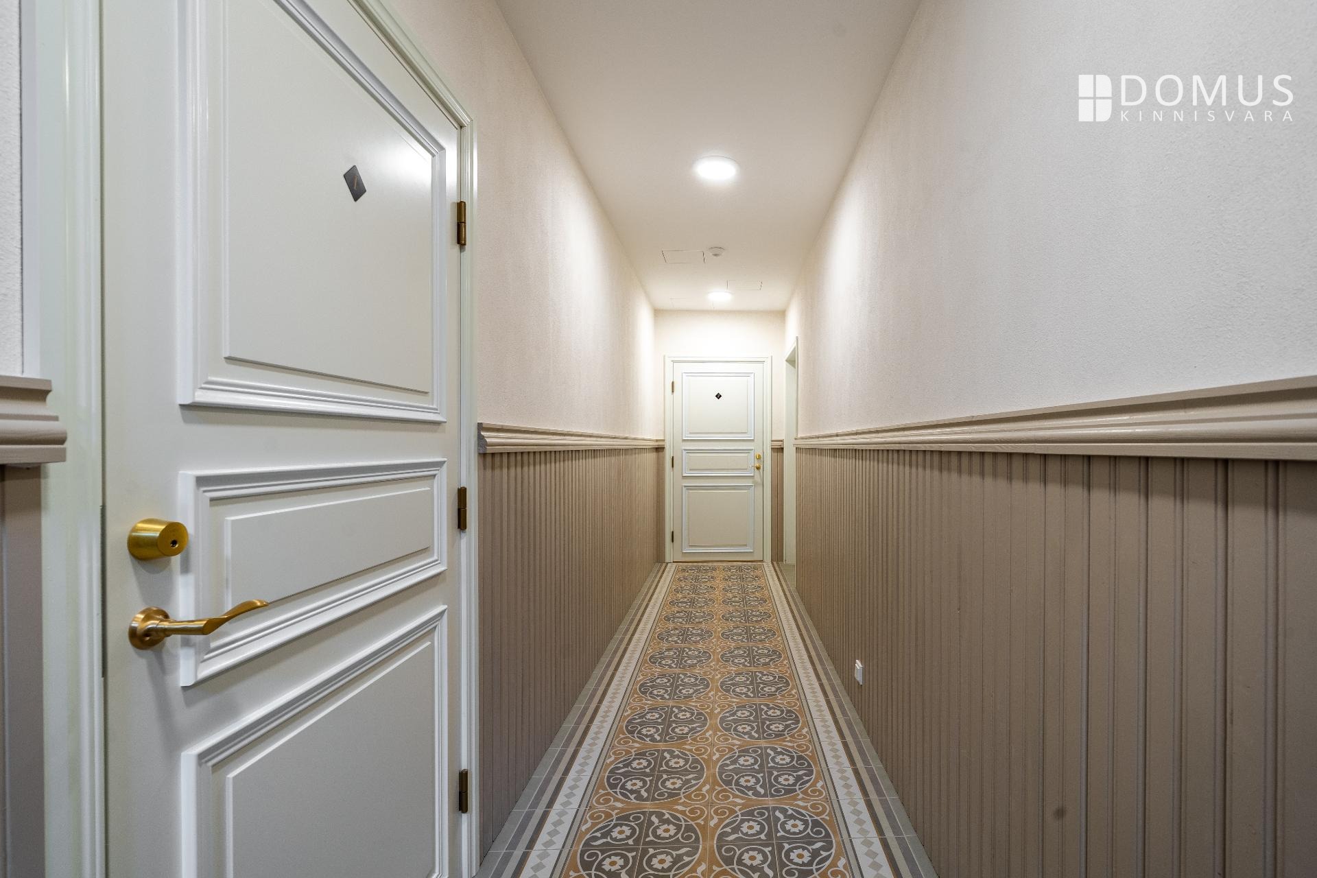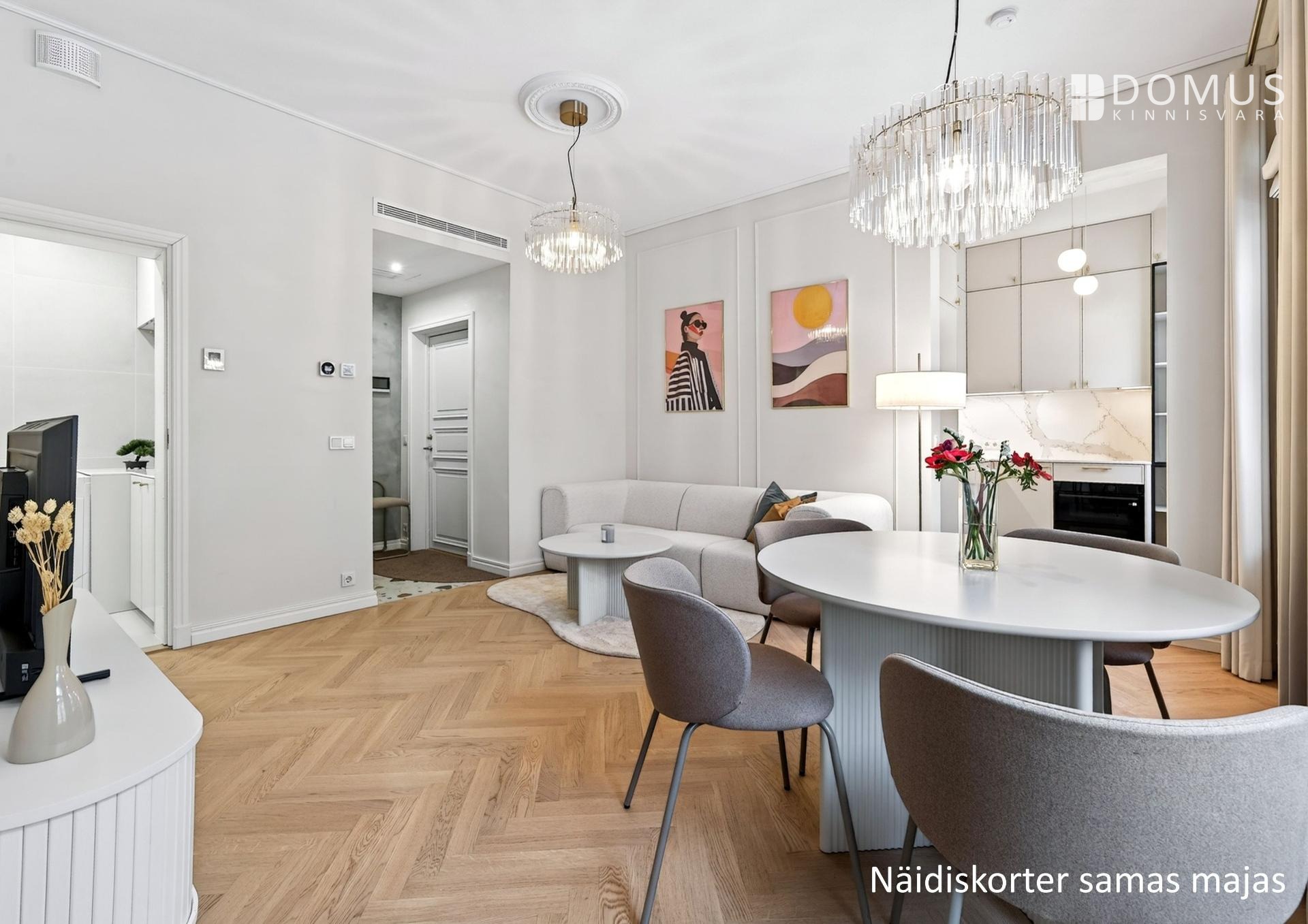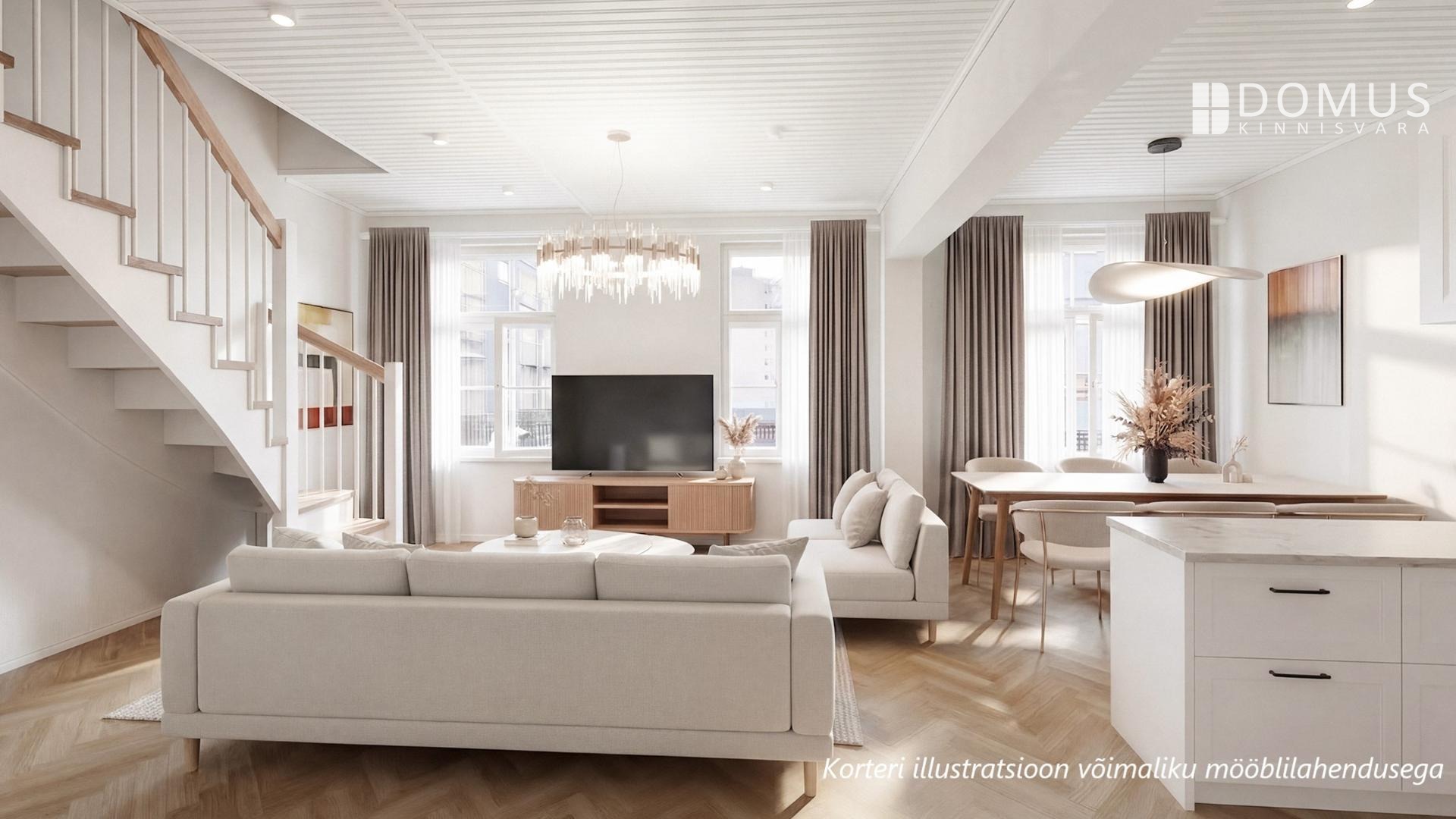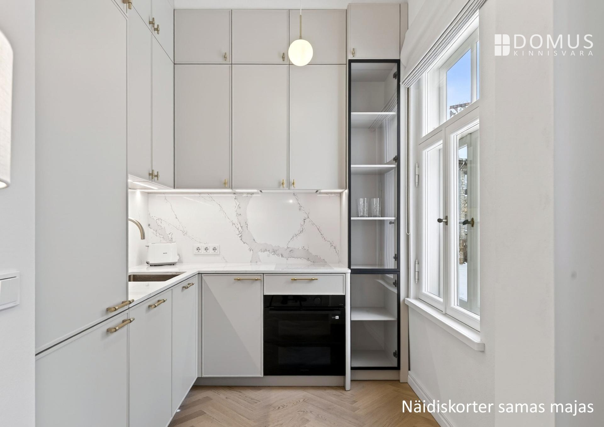 Muinsuskaitsealusele majale väärikalt rõhutasime selle ajastut kvaliteetsete materjalidega tänapäevases võtmes. Puitparkett kalasabamustris, puitlaudis esikuseintel ja elutoa laes, ehisdetailidega keraamilised plaadid vannitoas. Korteri seinu katab samuti looduslik materjal - lubikrohv, mis jätab kergelt struktuurse lõpptulemuse ja on omaette vaatamist väärt.
