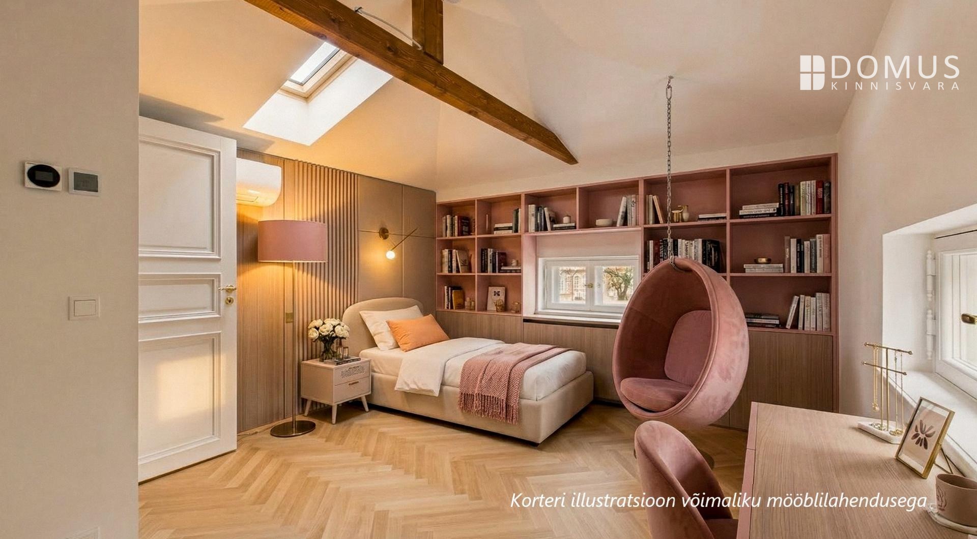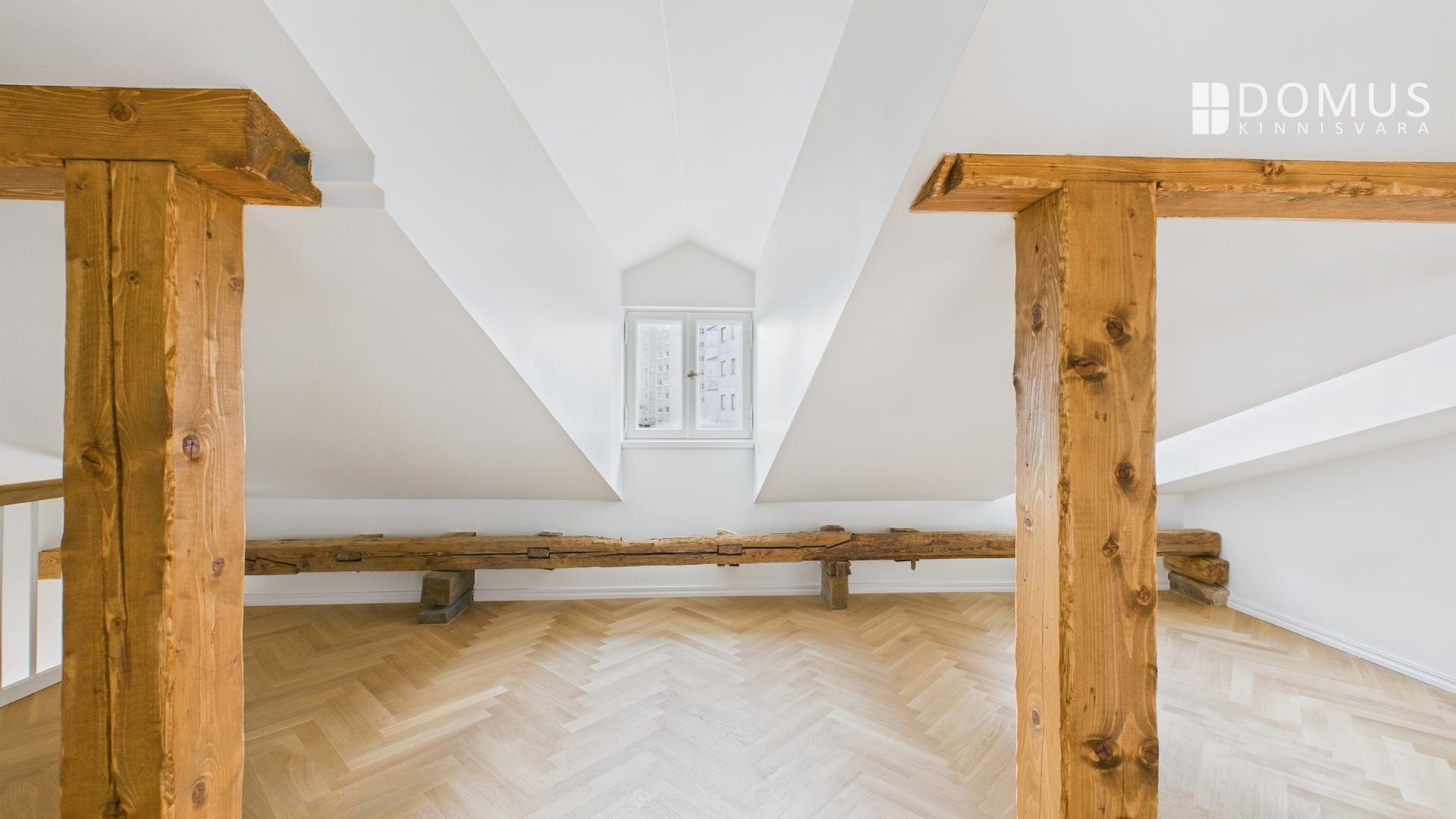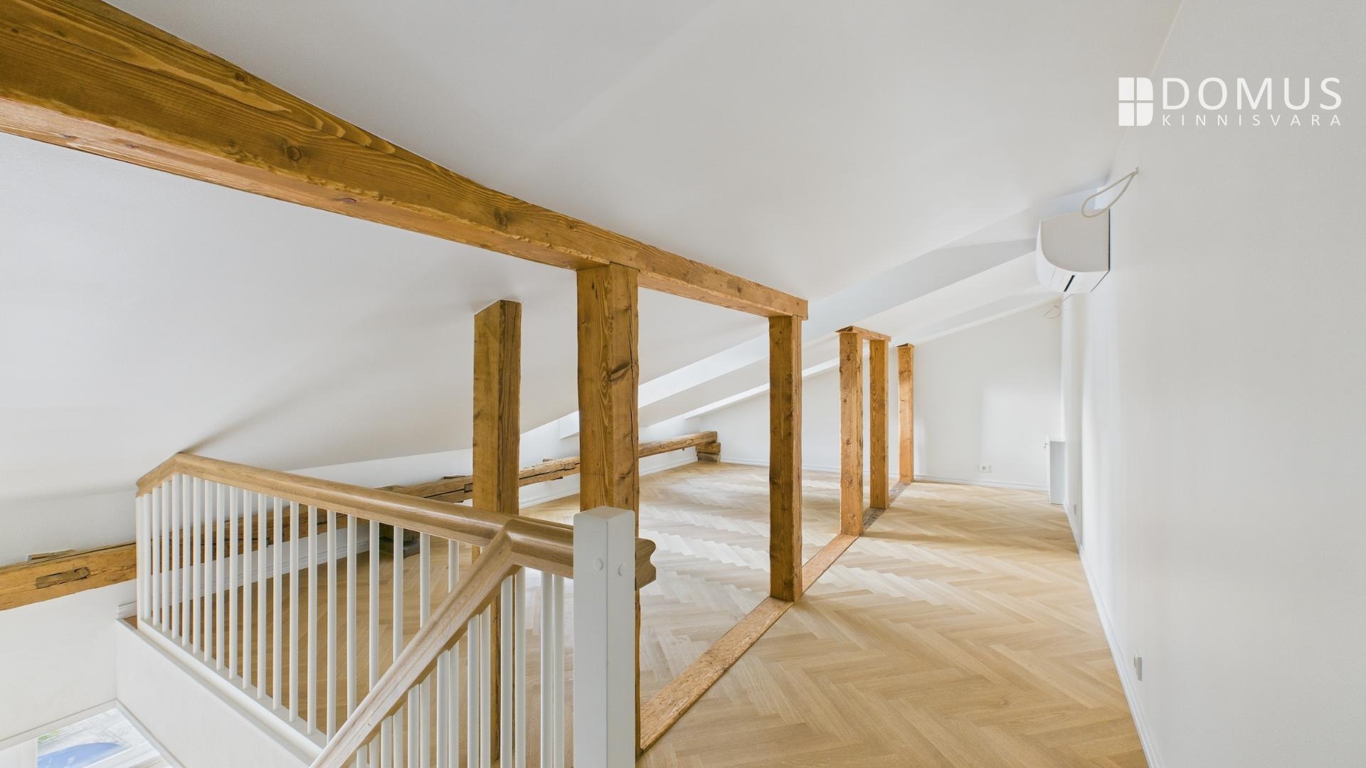 Elutoast viib trepp üles, kus hetkel on eraldatud üks, maja tornis asuv magamistuba. Vajadusel on aga võimalik eraldada ka teine, kahe väiksema vintskapi aknaga tuba, mis sobib hästi lastetoaks, kabinetiks, garderoobiks.