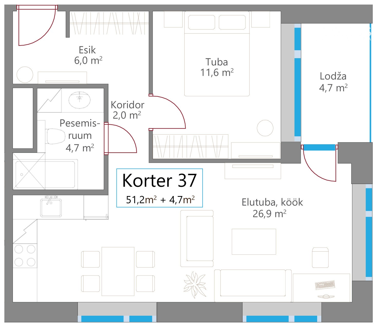 – Suurus: 51,2 m² + 4,7 m² klaasitud rõdu