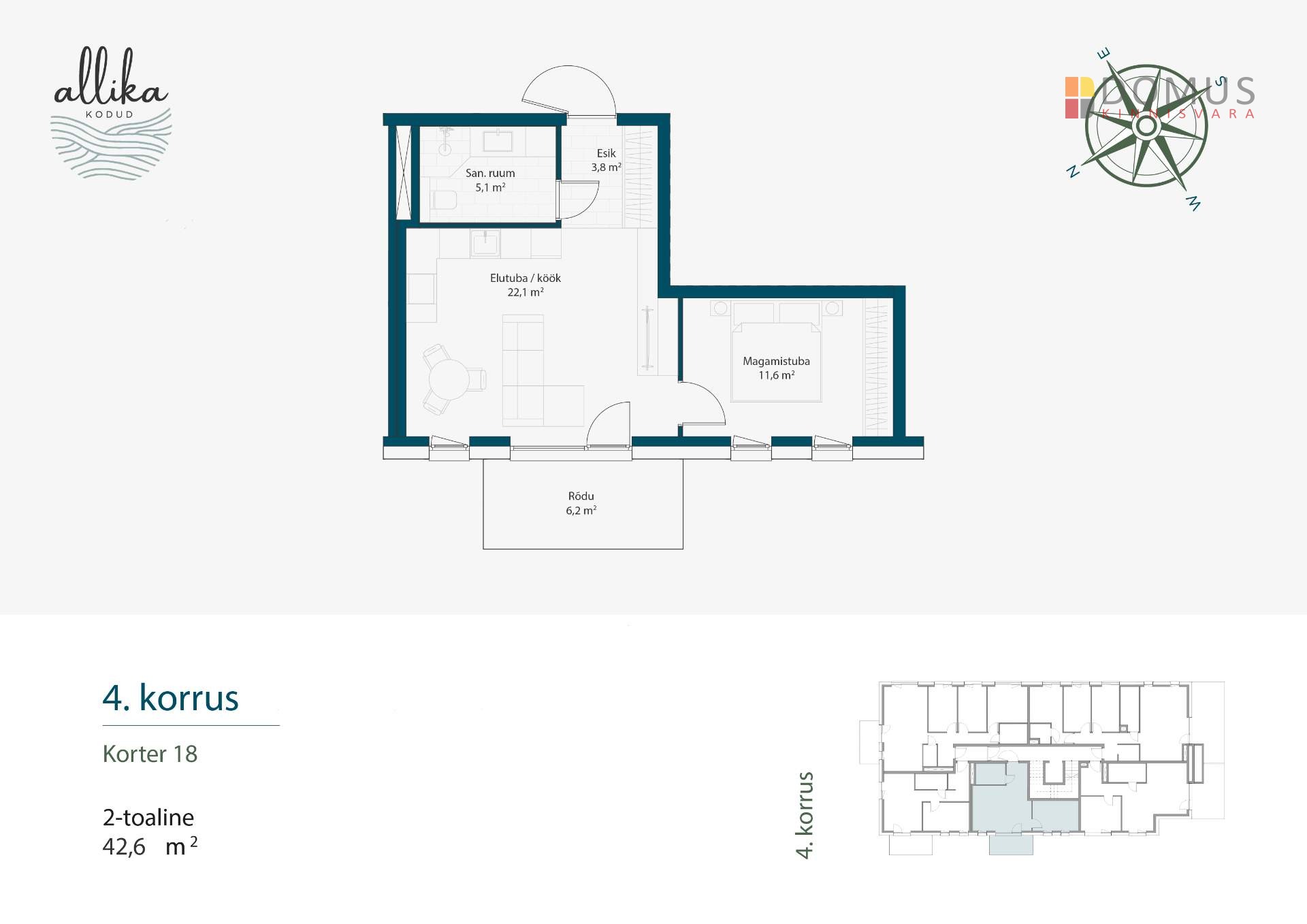 Neljandal korrusel asuv 2-toaline 42,6 m² läbimõeldud planeeringu ja 6,2 m² suuruse terrassiga, mis pakub rohkelt avarust ja võimalusi aja nautimiseks. Korteris on vesipõrandaküte.