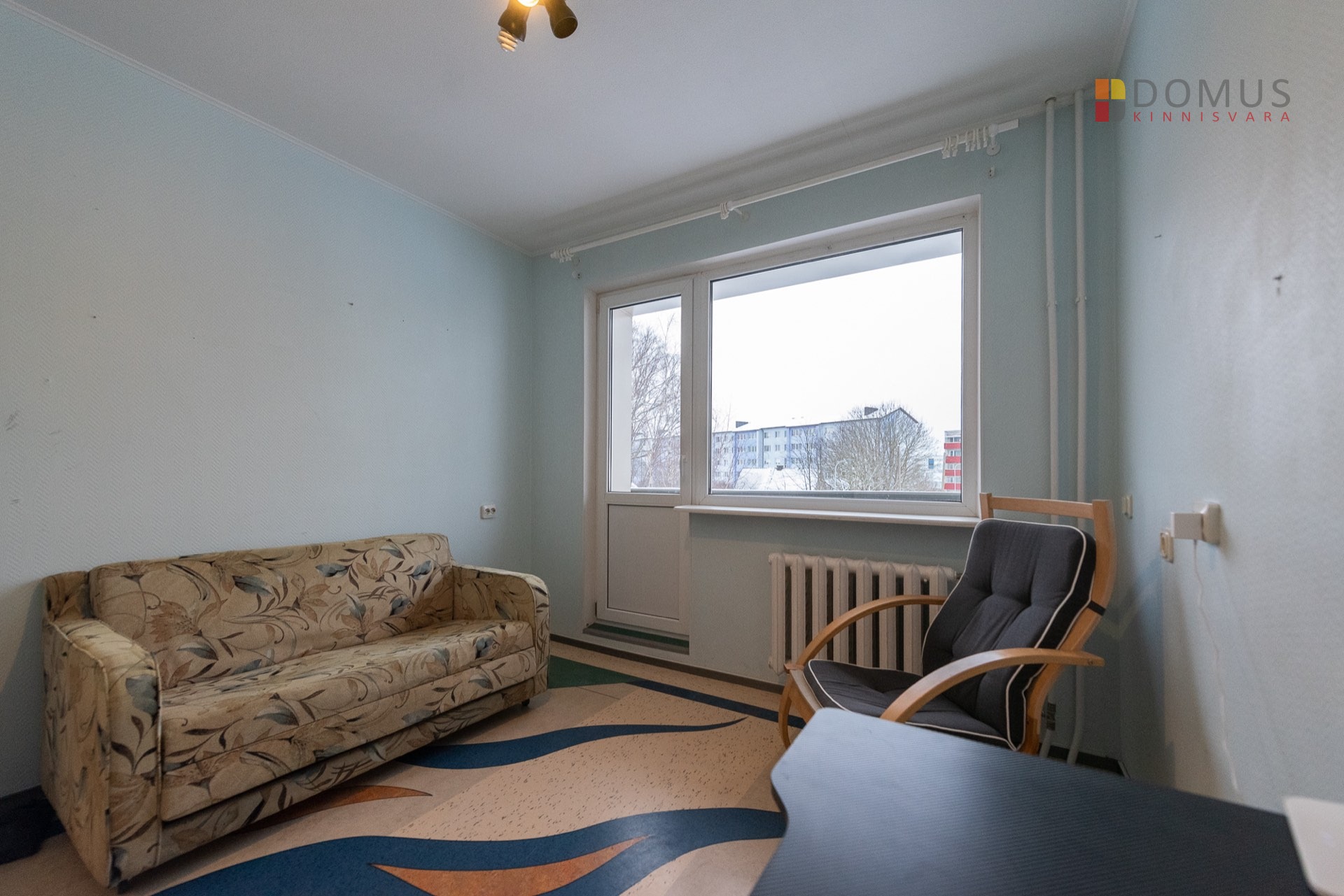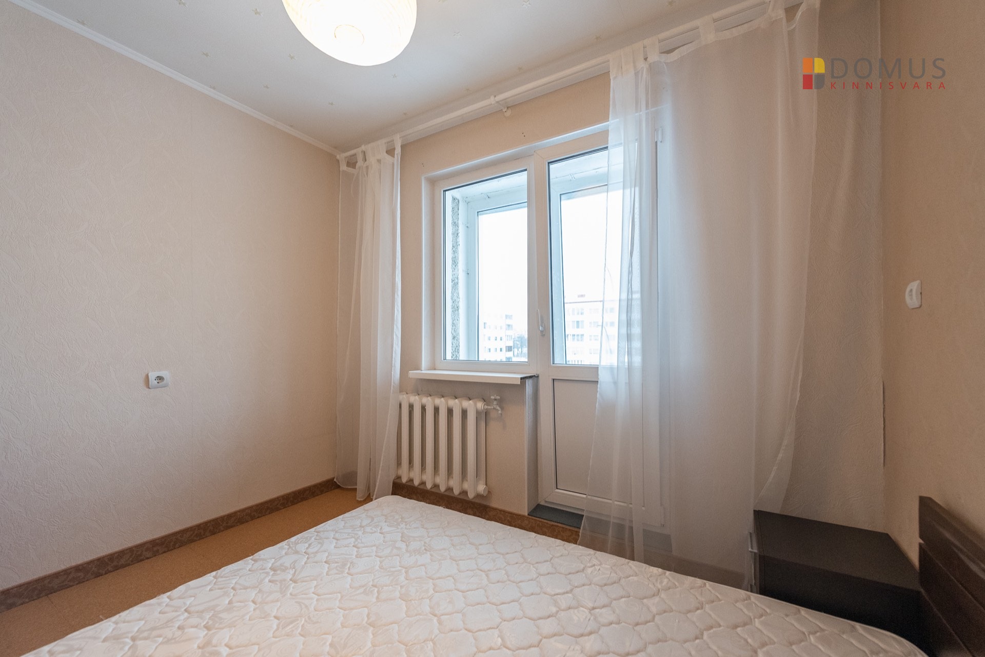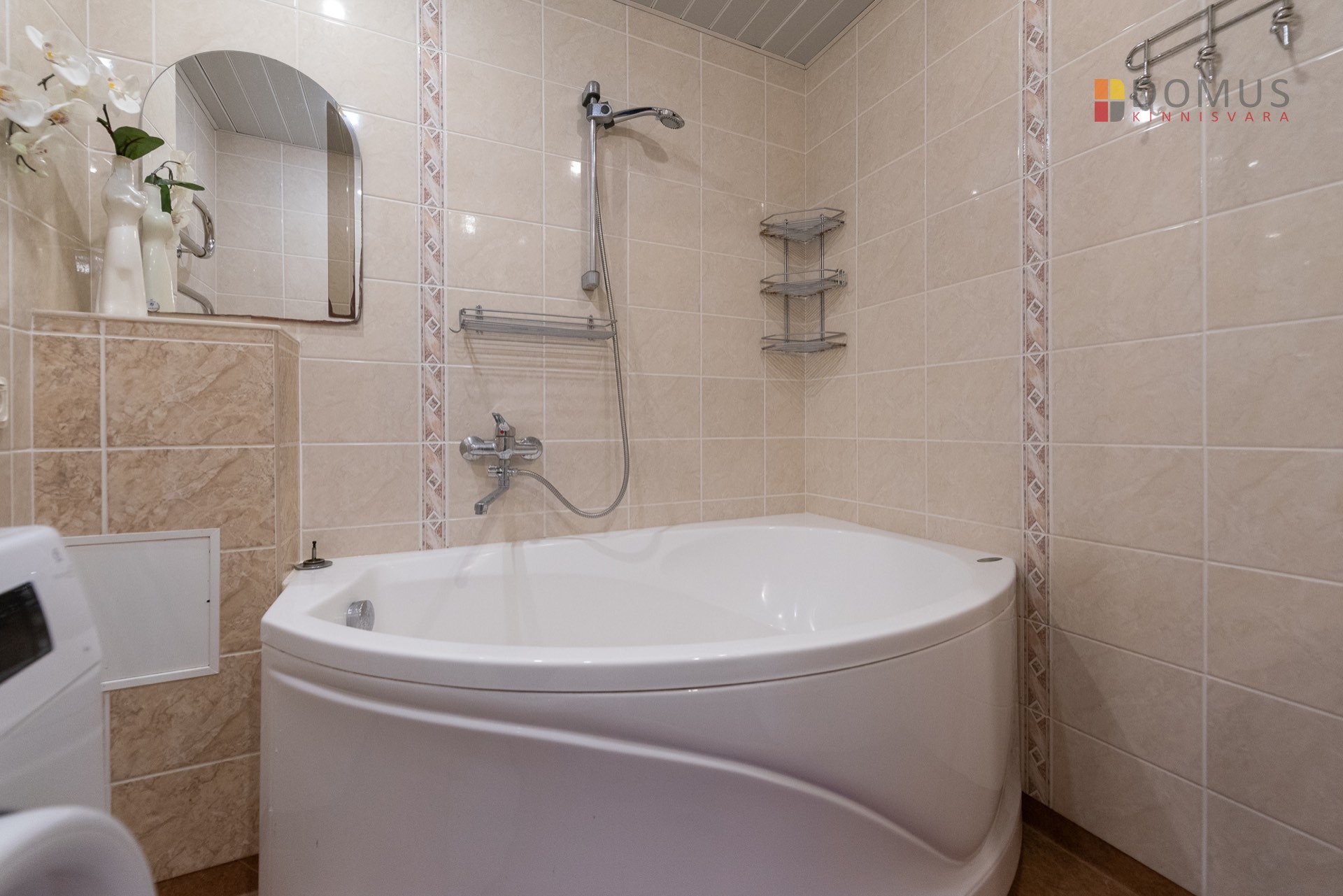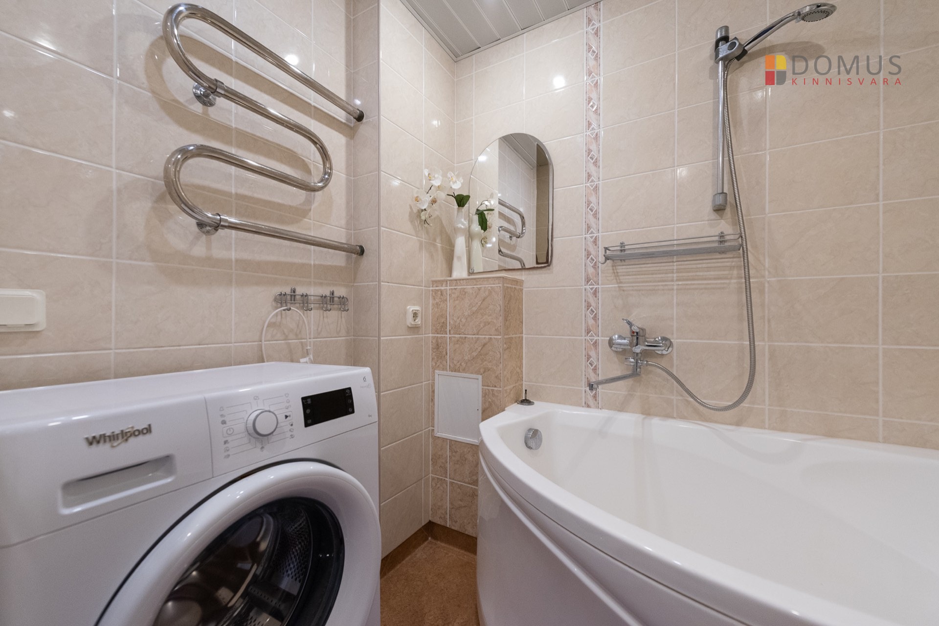 Teise magamistoa rõdu on avatud. WC ja vannitoa seinad ning põrand on plaaditud ning need on eraldi ruumid. Vannitoas on plastpinnaga Balteco vann ja Whirlpool pesumasin. Kõik korteri aknad on vahetatud ja paigaldatud on 2X klaaspaketiga plastraamidega aknad. Eluruumide seinu katab värvitud seinakatte materjal. Laed on valget värvi ja põrandaid katab kas vaip või CO2-neutraalne põrandakate marmoleum. Köök-elutoas on Beko sügavkülma osaga külmik, üsna uus nõudepesumasin Beko, keraamiline pliit Schott, õhupuhasti, ahi Beko, klaaspinnaga laud ja neli tooli, diivan, seinariiulid ja TV kapp.
