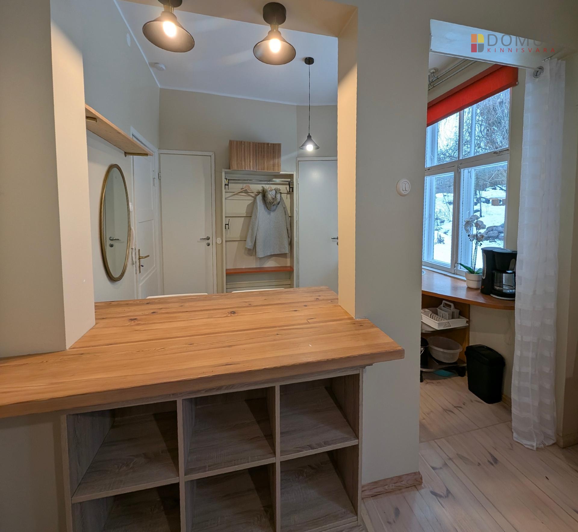 The apartment is located in a historic building, with windows facing the back of the house. It is in good condition, and all the furniture and appliances shown in the pictures are for the tenant's use. The renovated studio apartment is divided into a kitchen and a living area. The building is equipped with Telia fiber optic cable, newly installed central heating, and new radiators.