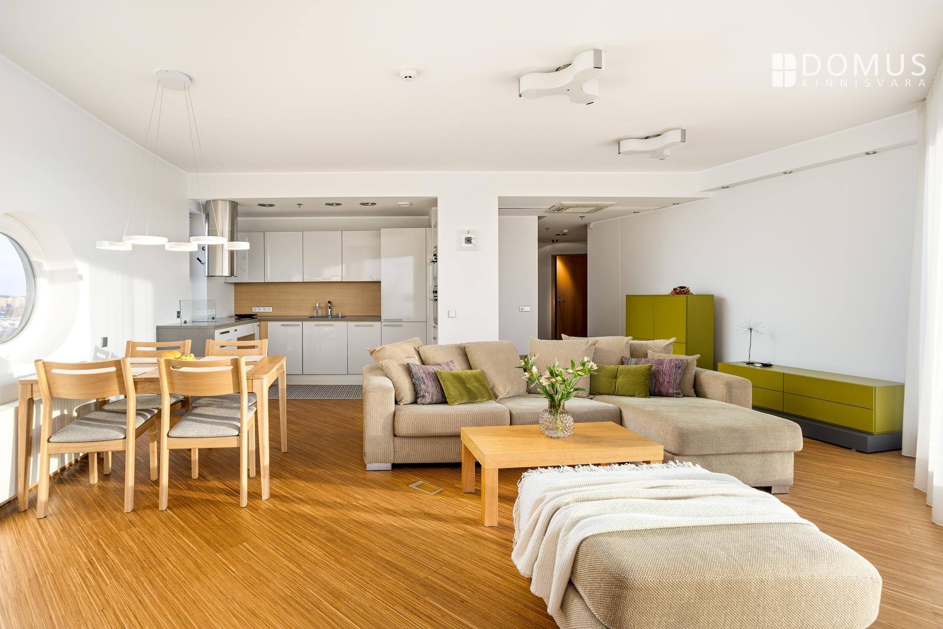 Elutuba koos köögiga on kompaktselt sisutatud, uuendatud on köögitehnika ning tammepuidust laud ja toolid. Ruumi panoraamaknad on varustatud kvaliteetsete ruloode ja kardinatega. Erilist rõhku on pandud liigendatud valgustusele, millega "mängides" saab luua erinevaid kombinatsioone just endale sobivaks lahenduseks.
