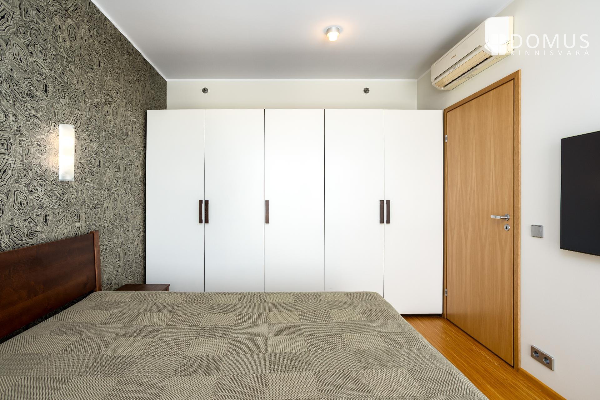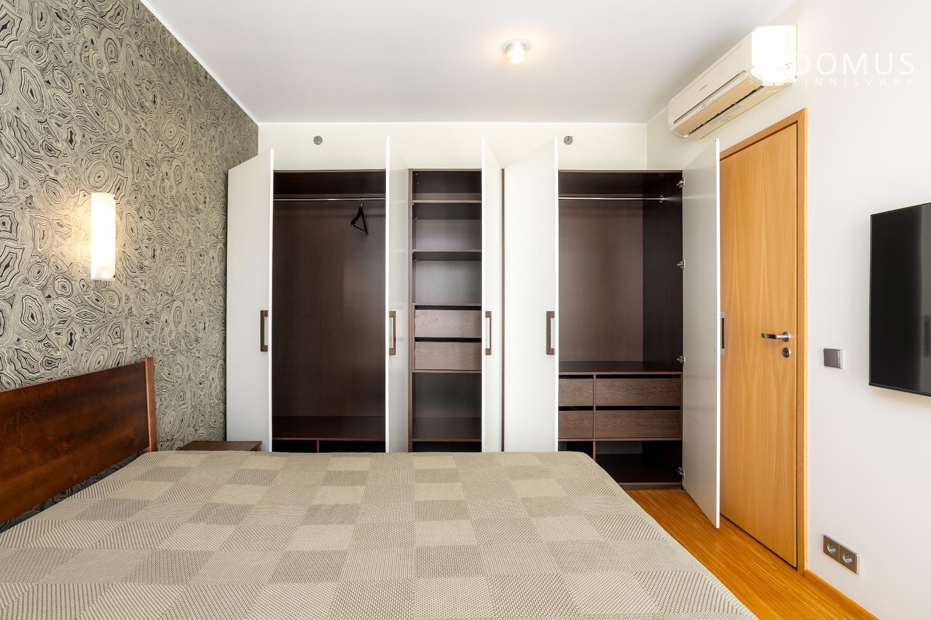Korteri magamistoas on loodud rahulikes rohelistes toonides puhkeoaas, mida toetab ruumi pimendava iseloomuga kardin ning terve seina ulatuses mahukas garderoobikappide sektsioon.