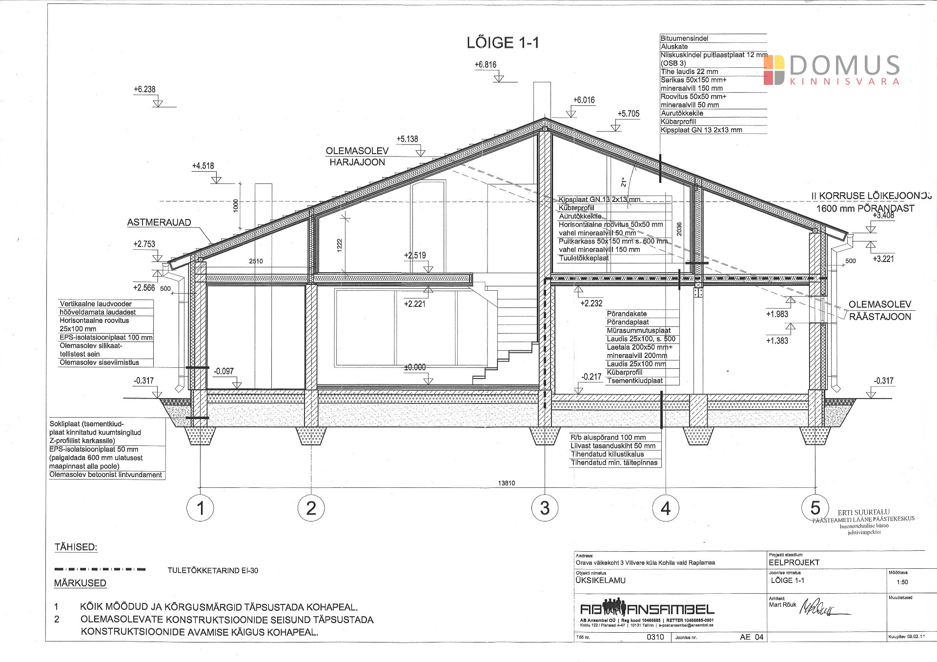 Elamu on lintvundamendil, välisseinte konstruktsioon on silikaattellis ja puitsõrestik, laiendatud hooneosas on kasutatud väikeplokke. Hoone renoveerimisega alustati 2001.a., töid on tehtud jooksvalt, kuid ehitus on jäänud pooleli. Renoveerimise käigus hoonet laiendati - tõsteti katust ja garaaži peale ehitati täiendav eluruumide pind. Elamu välisfassaad on soojustatud (EPS 100 mm) ja kaetud hööveldamata puitvoodriga, katusekate vahetatud (bituumensindel). Katusealune lagi soojustatud, laiendatud osa on ehituslikult nn musta karbi kujul.
