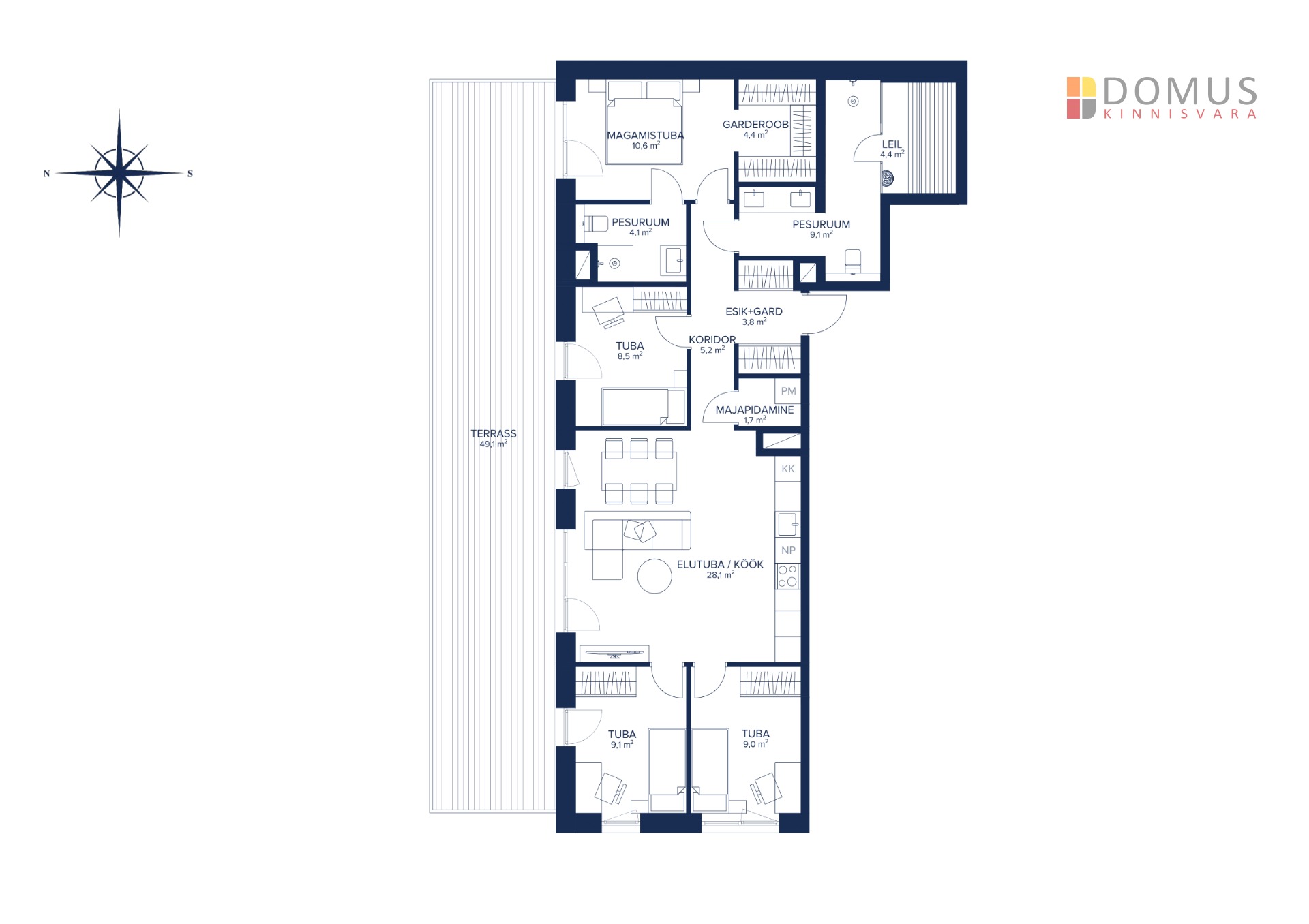 Korteris on mahukas esik kahe garderoobikapiga (3,8 m²), koridor (5,2 m²), avatud köögiga elutuba (28,1 m²), kust pääseb avarale, 49,1 m² suurusele terrassile.