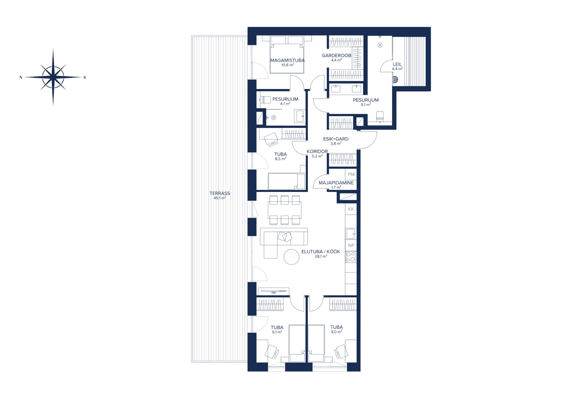 Korteris on mahukas esik kahe garderoobikapiga (3,8 m²), koridor (5,2 m²), avatud köögiga elutuba (28,1 m²), kust pääseb avarale, 49,1 m² suurusele terrassile.