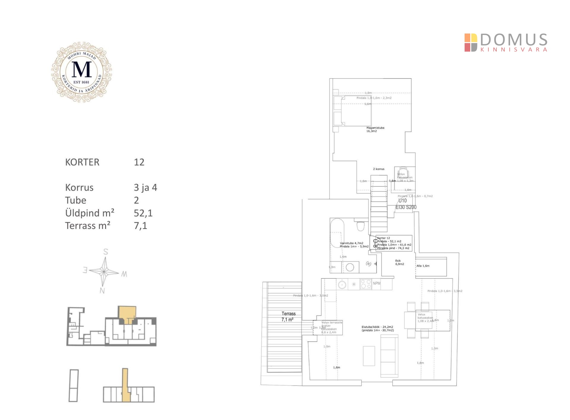 Müüdav korter on 2-toaline, 61,6 m² on mõõdetuna 1 m kõrguselt, 52,1 m² on pind 1,6 m kõrguselt ja põrandapinda on lausa 74,3 m².