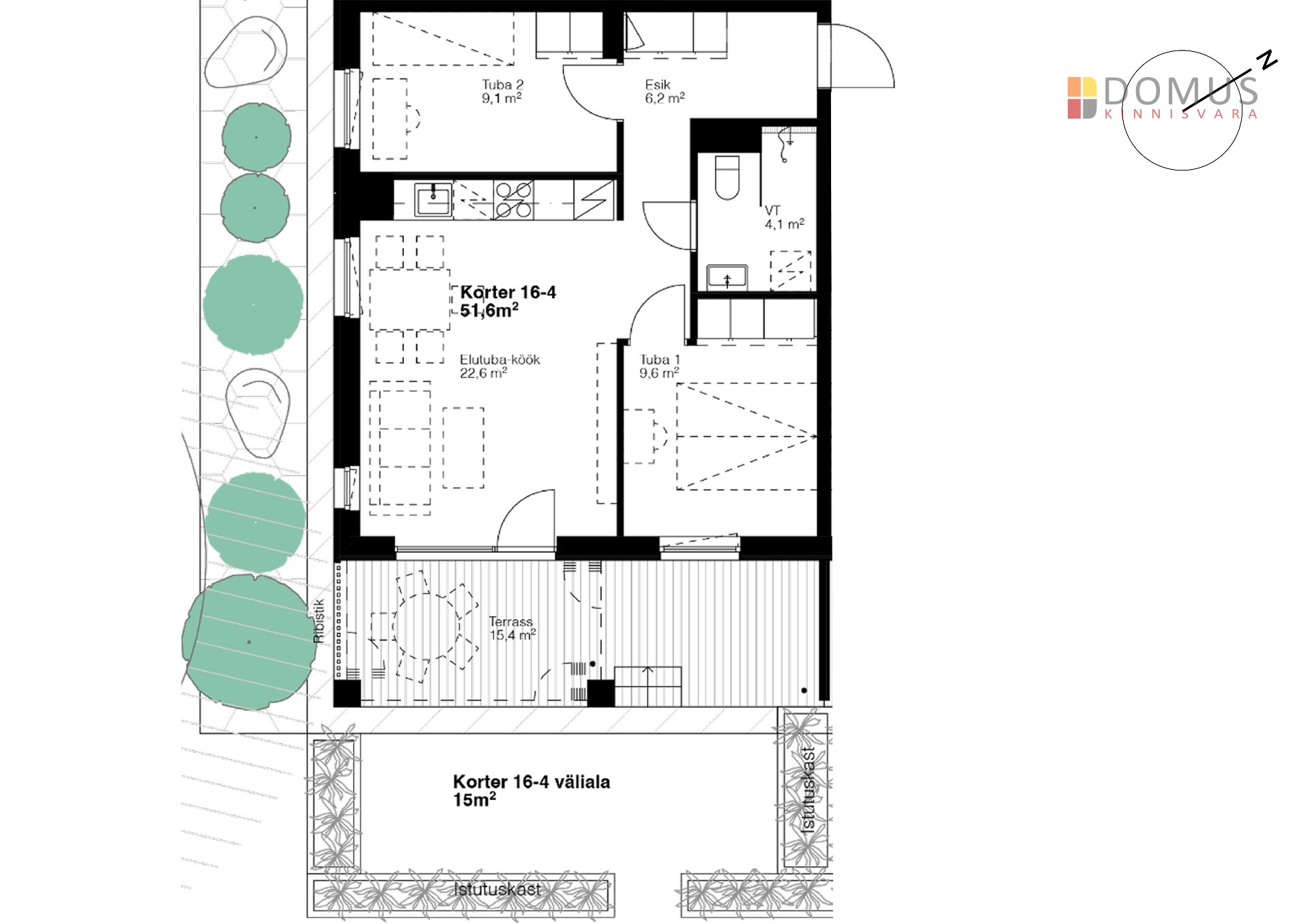 Raadiraja 16 maja 3-toaline korter nr 4 asub esimesel korrusel. Kodu koosneb esikust, avatud köögiga elutoast, kahest magamistoast ja WC/duširuumist. Avar 15,4 m² terrass on justkui sinu isiklik lisatuba vabas õhus. Siia mahub vabalt rohelusest pakatav botaanikaaed, suvine võrkkiik või väike hommikukohvi nurgake, kus päeva rahulikult alustada. Soovi korral saab terrassi klaasida, et nautida loodust igal aastaajal. Terrassilt asub hoone nurga peal, kus on sul ka isiklik hooviala. Betoonist lillekastidega hooviala pakub privaatsust ning ridaelamu tunnet, ja siit saab juba alustada jalutuskäiku kvartalis. Sellele korterile on valitud naturaalsetes toonides "Liivakivi" siseviimistluspakett.