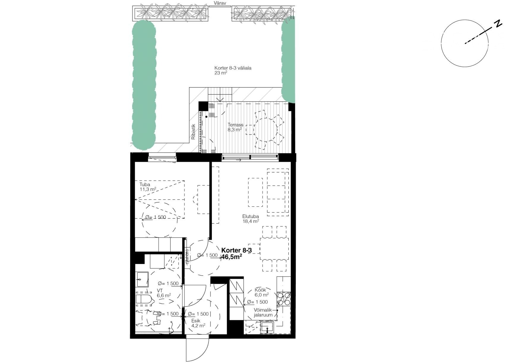 Raadiraja 8 maja 2-toaline korter nr 3 asub mugaval esimesel korrusel. Kodu koosneb esikust, avatud köögiga elutoast, magamistoast ja WC/duširuumist. Avar 12,1 m² terrass on justkui sinu isiklik lisatuba vabas õhus. Terrassi ees on lisaks veel tervelt 23 m² isiklikku muruala, mida on selles majas vaid neljal korteril kokku, ja see on viimane selline vaba korter. Siia mahub vabalt rohelusest pakatav botaanikaaed, suvine võrkkiik või väike hommikukohvi nurgake, kus päeva rahulikult alustada. Soovi korral saab terrassi klaasida, et nautida loodust igal aastaajal.