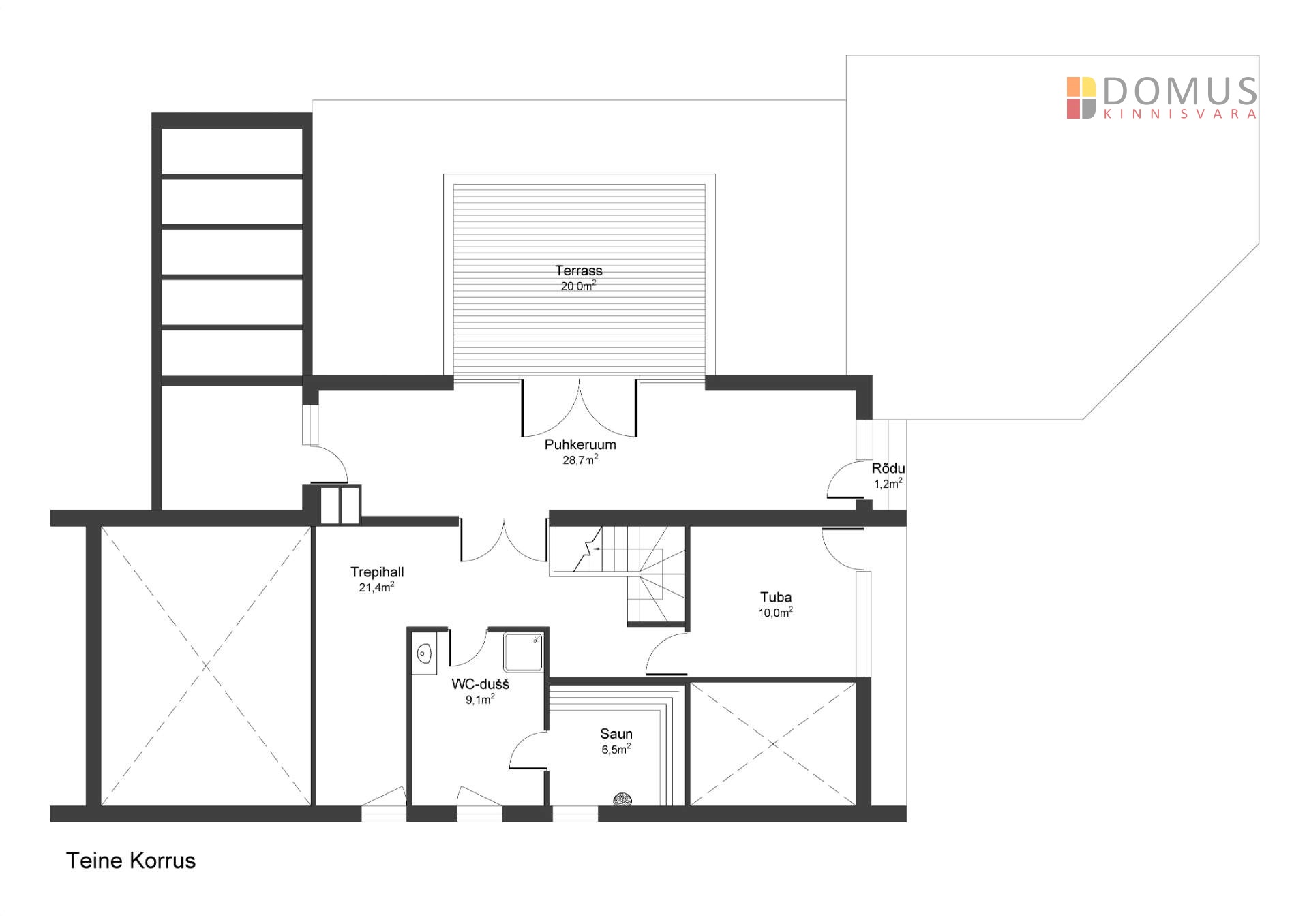 Teise korruse pindala kokku 96,9 m² koos rõdu ja avatud pinnaga.