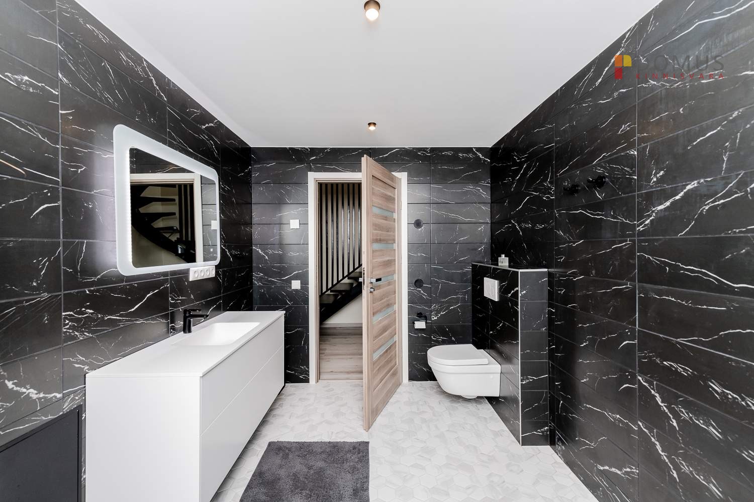 Maja esimesel korrusel on suur esik mahuka garderoobikapiga, avar elutuba (50 m²) avatud köögiga, 2 magamistuba (18,3 ja 16.7m²), kabinet 12,6 m², 2 x wc/ duširuum, ühes neist pesumasin/kuivati ja eraldi asuv tehnoruum. Elutoast pääseb maja taga asuvale lõunapoolsele avarale terrassile, kus mõnus grillida ja sõprade ja perega aega veeta.