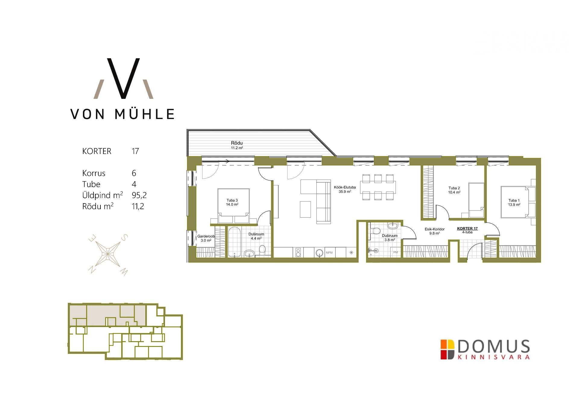 Eksklusiivne korter asub maja 6. korrusel ja on tõeliselt avarate vaadetega. Ruumilahenduses on avatud köögiga elutuba, kolm magamistuba, kaks vannituba ning rõdu.