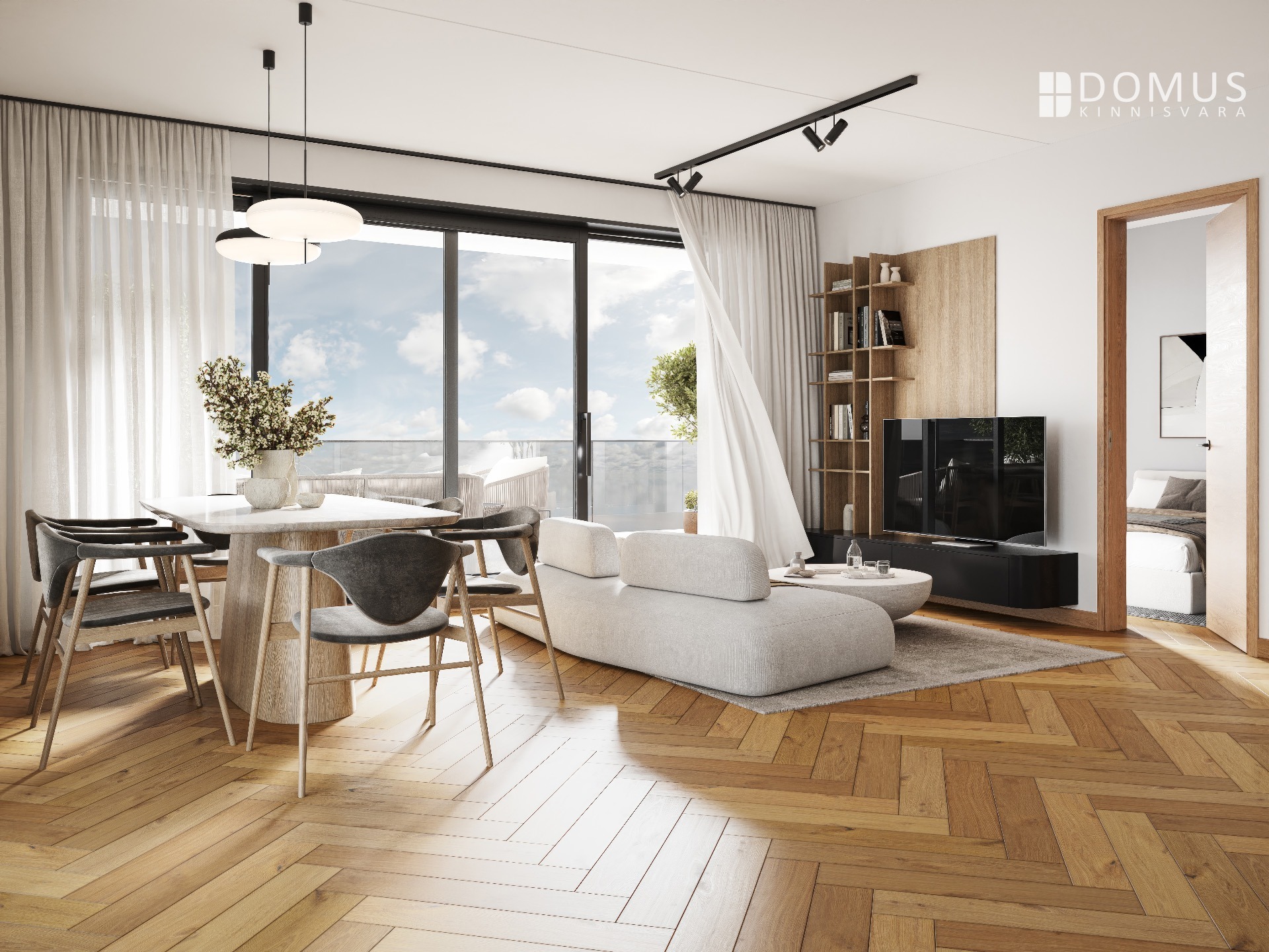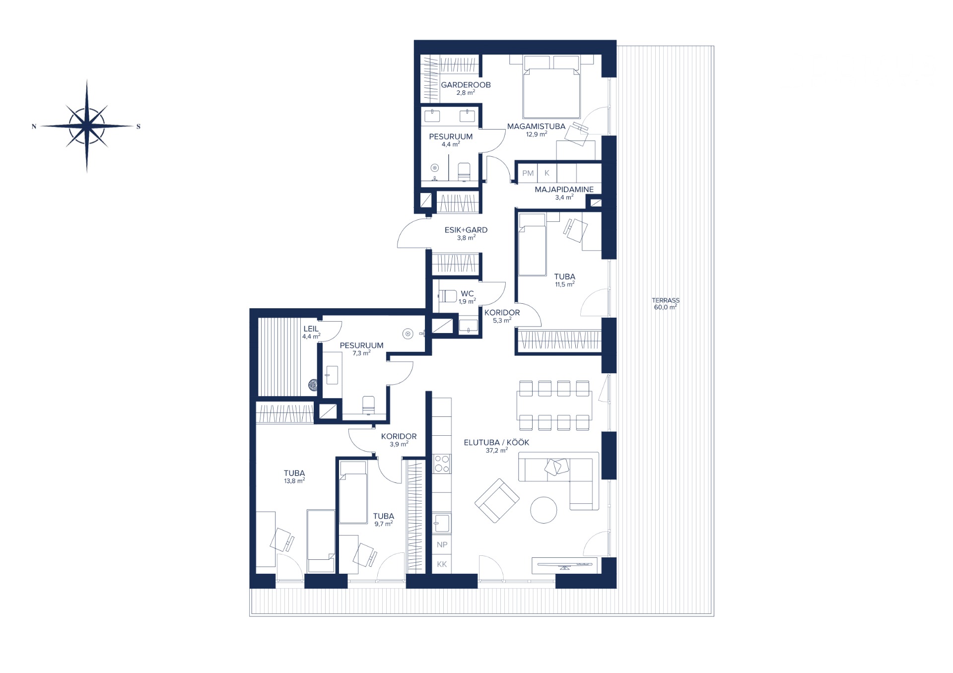 Korteri südameks on avar elutuba-köök (37,2 m²), millelt pääseb otse muljetavaldavale 60 m² terrassile – ideaalne ruum vaba aja veetmiseks, grillimiseks või rohenäpule. Kodul on neli eraldi asetsevat magamistuba: