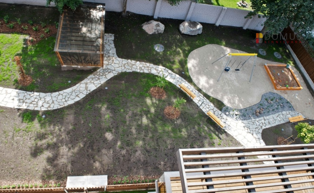Aiaga piirnev hoovialal on ohtralt rohelust ja väikelastega peredele rõõmu pakkuv mänguväljak.
