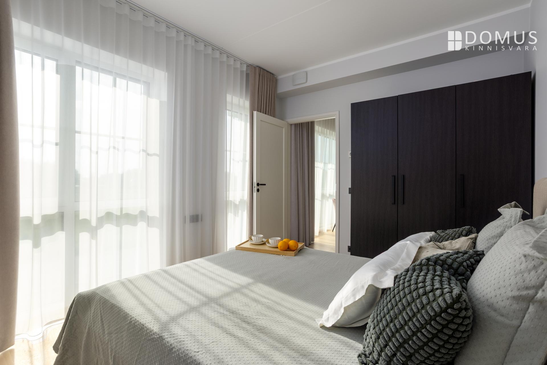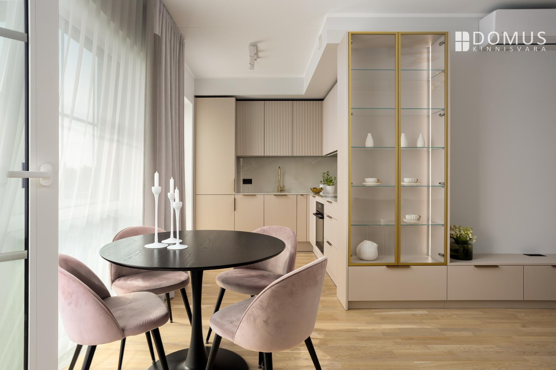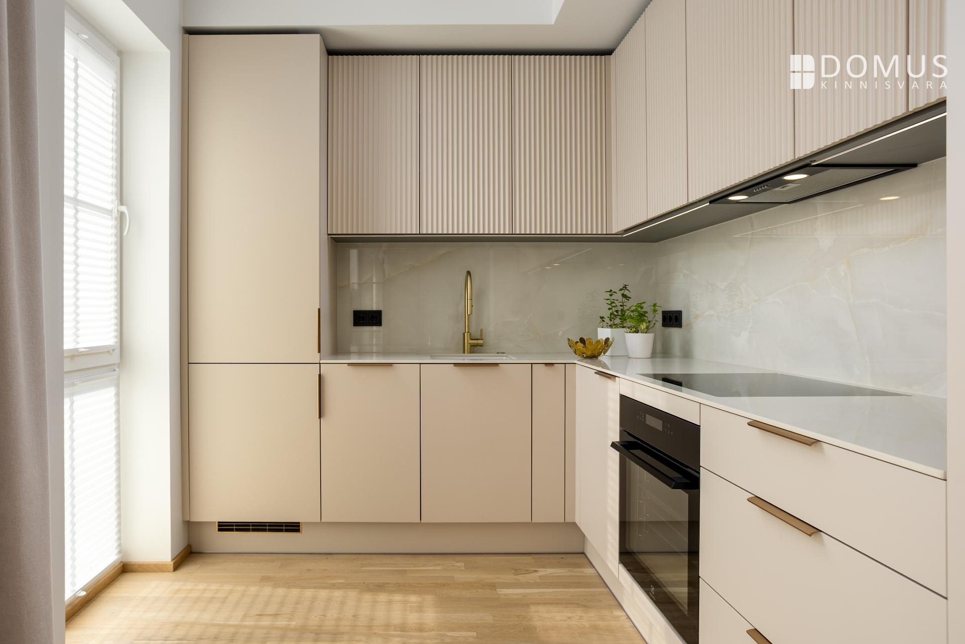 Kvaliteetne köök on sisustatud kõige vajalikuga, tasapind on kivist. Tehnika: nõudepesumasin, pürolüüsiga praeahi, induktsioonpliit, külmik, õhupuhasti.