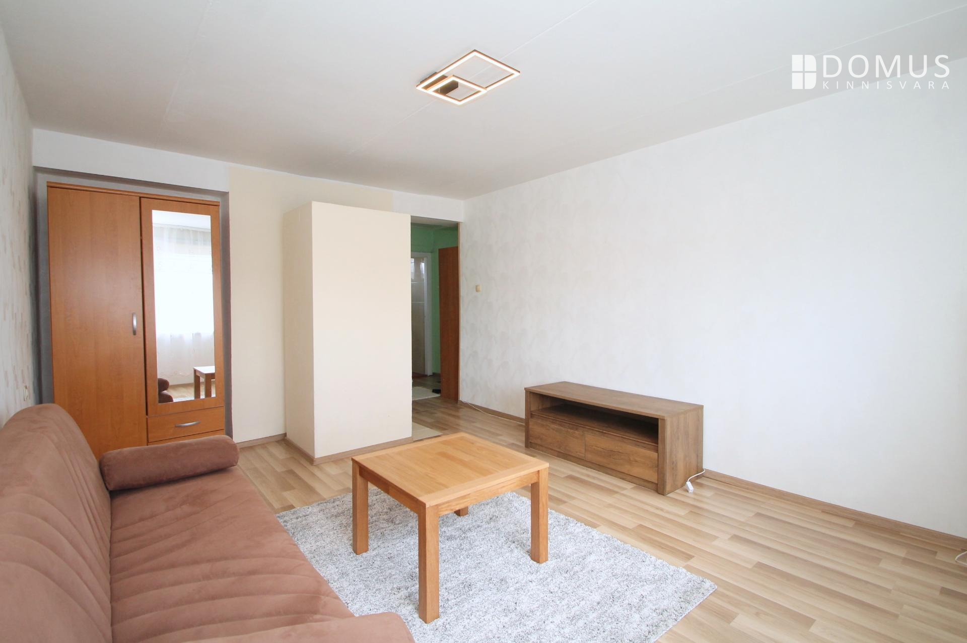 Korter on möbleeritud, kõik piltidel olev mööbel jääb korterisse: lahtivõetav diivan, laud, riidekapp ja telerilaud elutoas;