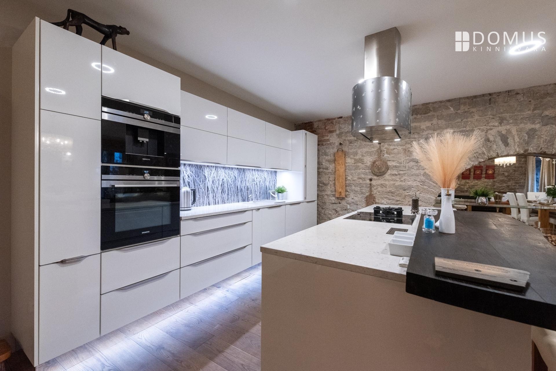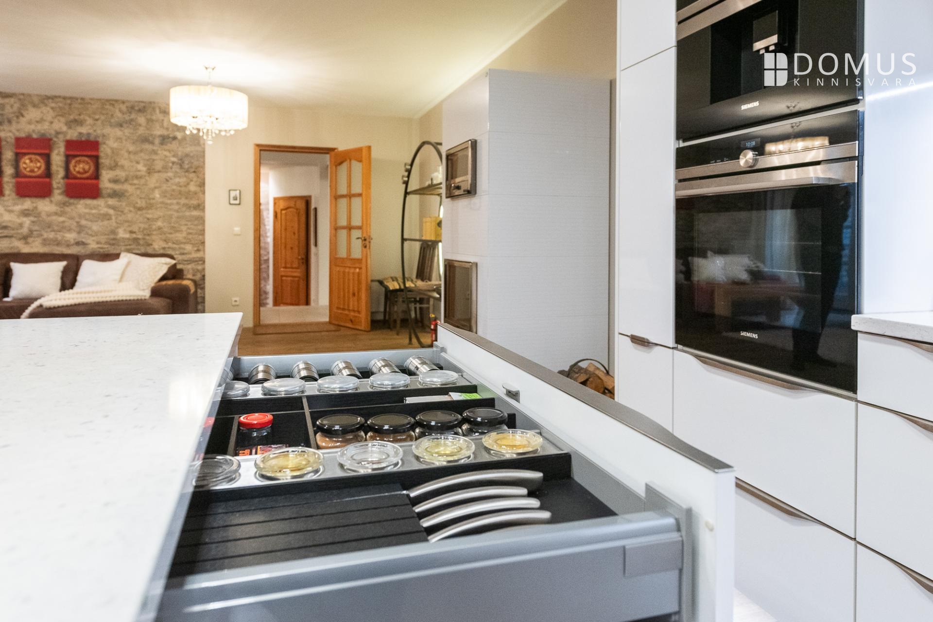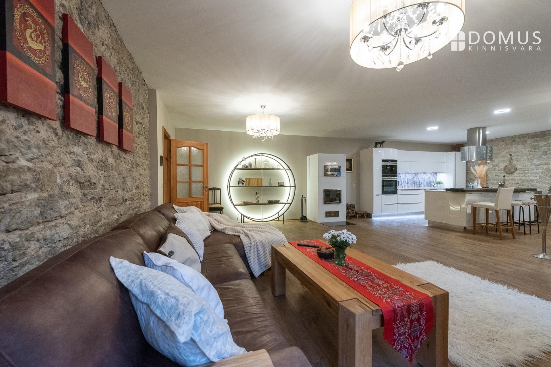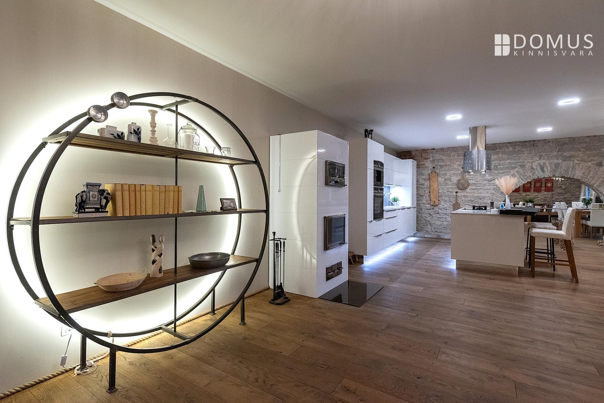 Sisenedes tervitab sind avar ja suursugune esik, mis loob kohe koduse ja luksusliku tunde. Avatud köök-elutuba-söögituba on loodud sõprade ja pere võõrustamiseks, kus keset ruumi asuv saareke kutsub valmistama parimaid roogasid. Köögitehnika on kõrgel tasemel – integreeritud kohvimasin, kuumaõhu-auruahi, gaasivokk ja erilise südamega mustast tammest laevavrakist lett lisavad igale toiduelamusele luksuslikku kvaliteeti. Elutoas asuv kamin-ahi loob sooja ja hubase õhkkonna ning rõdu aknad avanevad sisehoovi, tuues ruumi valguse ja õhku.