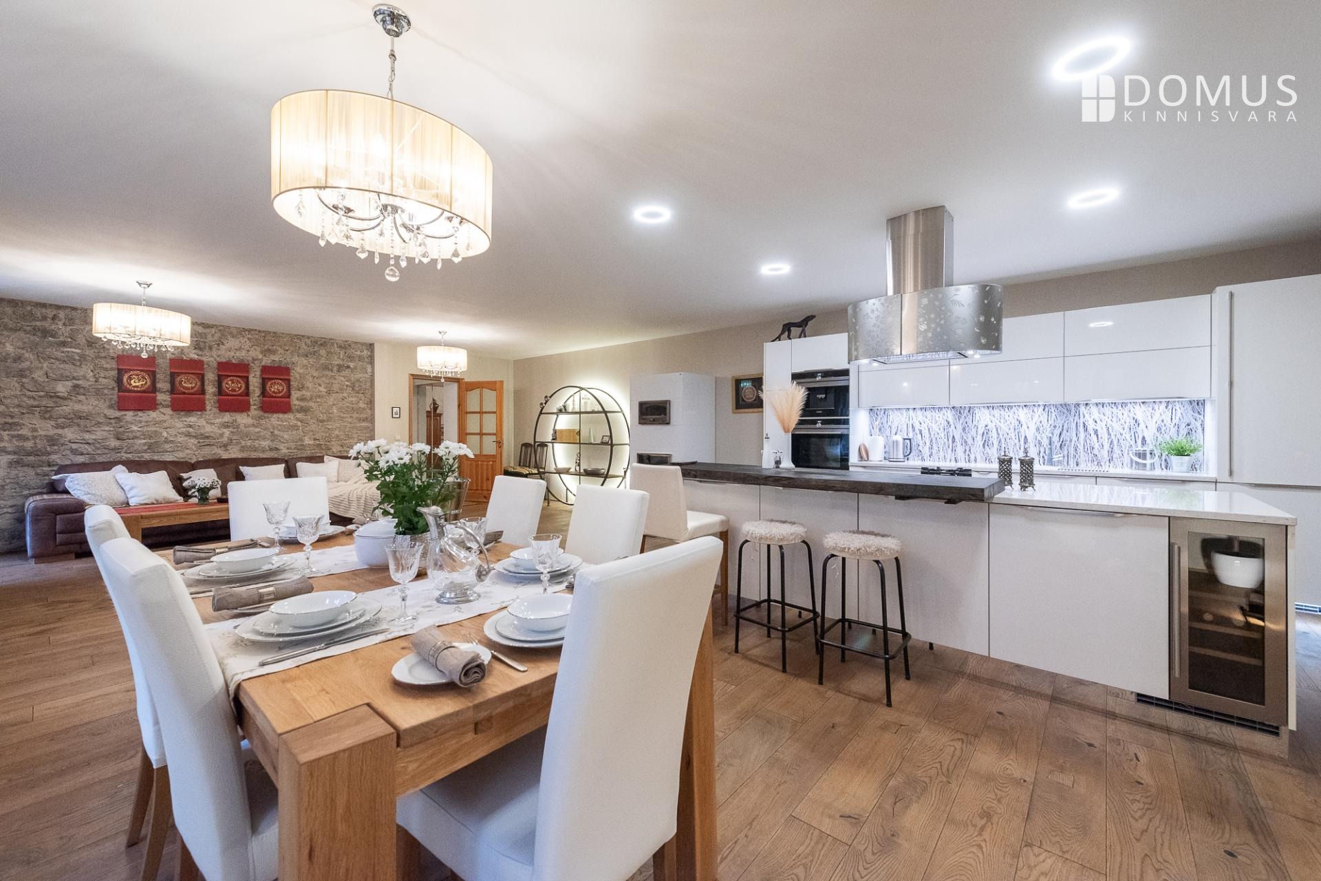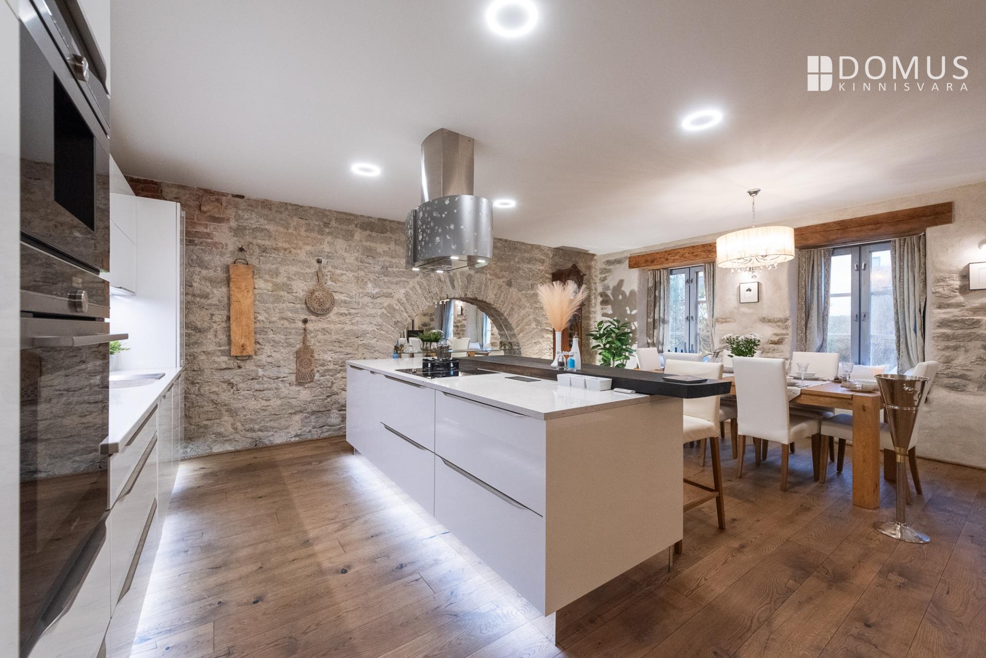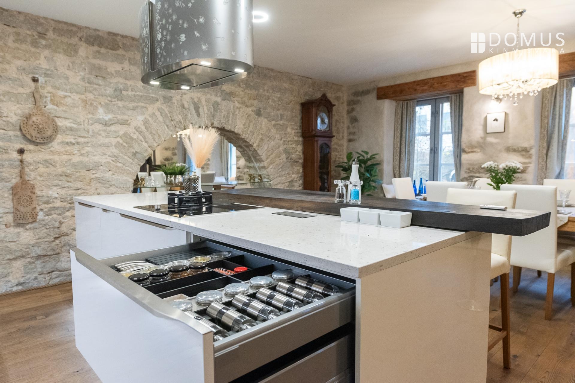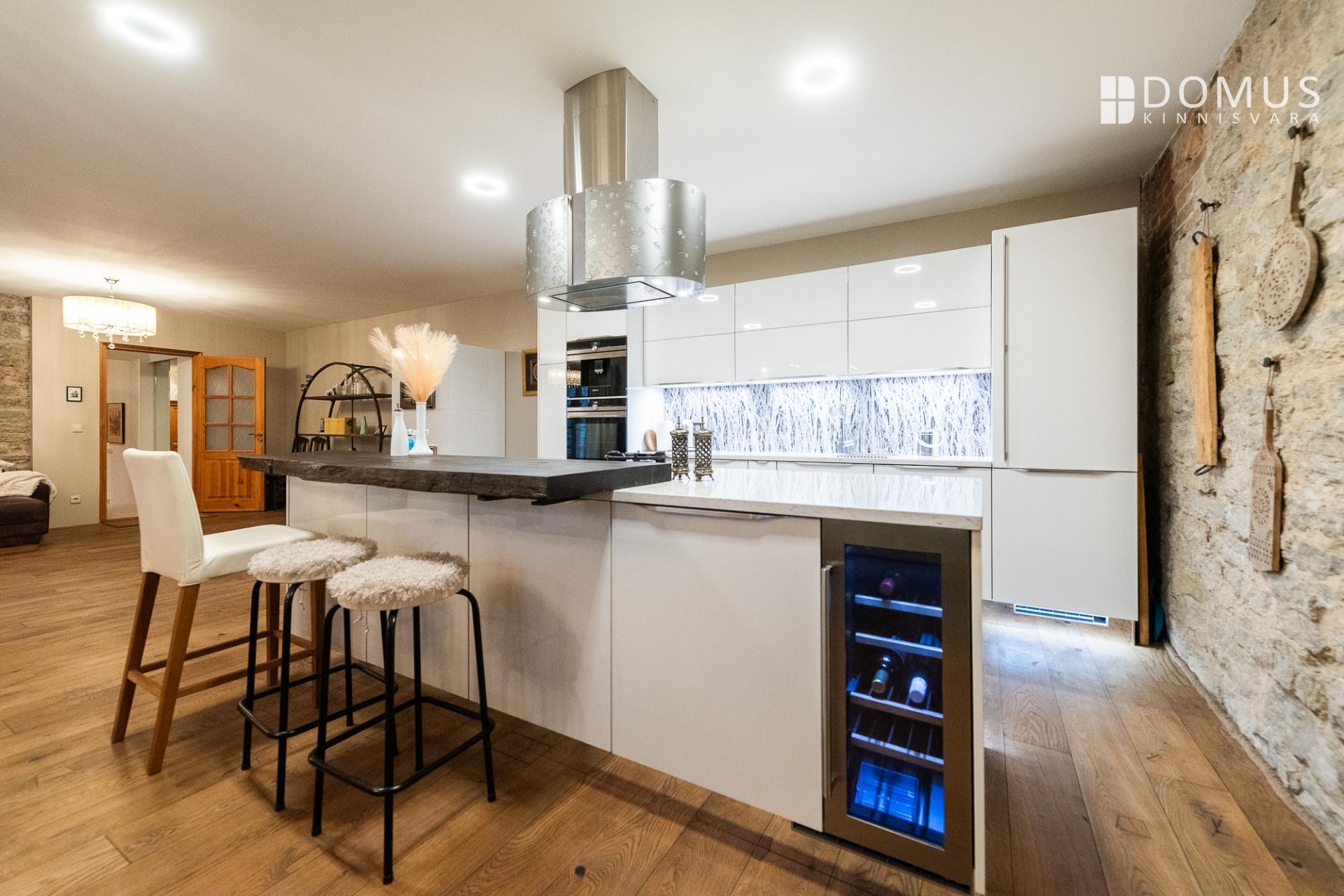 Sisenedes tervitab sind avar ja suursugune esik, mis loob kohe koduse ja luksusliku tunde. Avatud köök-elutuba-söögituba on loodud sõprade ja pere võõrustamiseks, kus keset ruumi asuv saareke kutsub valmistama parimaid roogasid. Köögitehnika on kõrgel tasemel – integreeritud kohvimasin, kuumaõhu-auruahi, gaasivokk ja erilise südamega mustast tammest laevavrakist lett lisavad igale toiduelamusele luksuslikku kvaliteeti. Elutoas asuv kamin-ahi loob sooja ja hubase õhkkonna ning rõdu aknad avanevad sisehoovi, tuues ruumi valguse ja õhku.