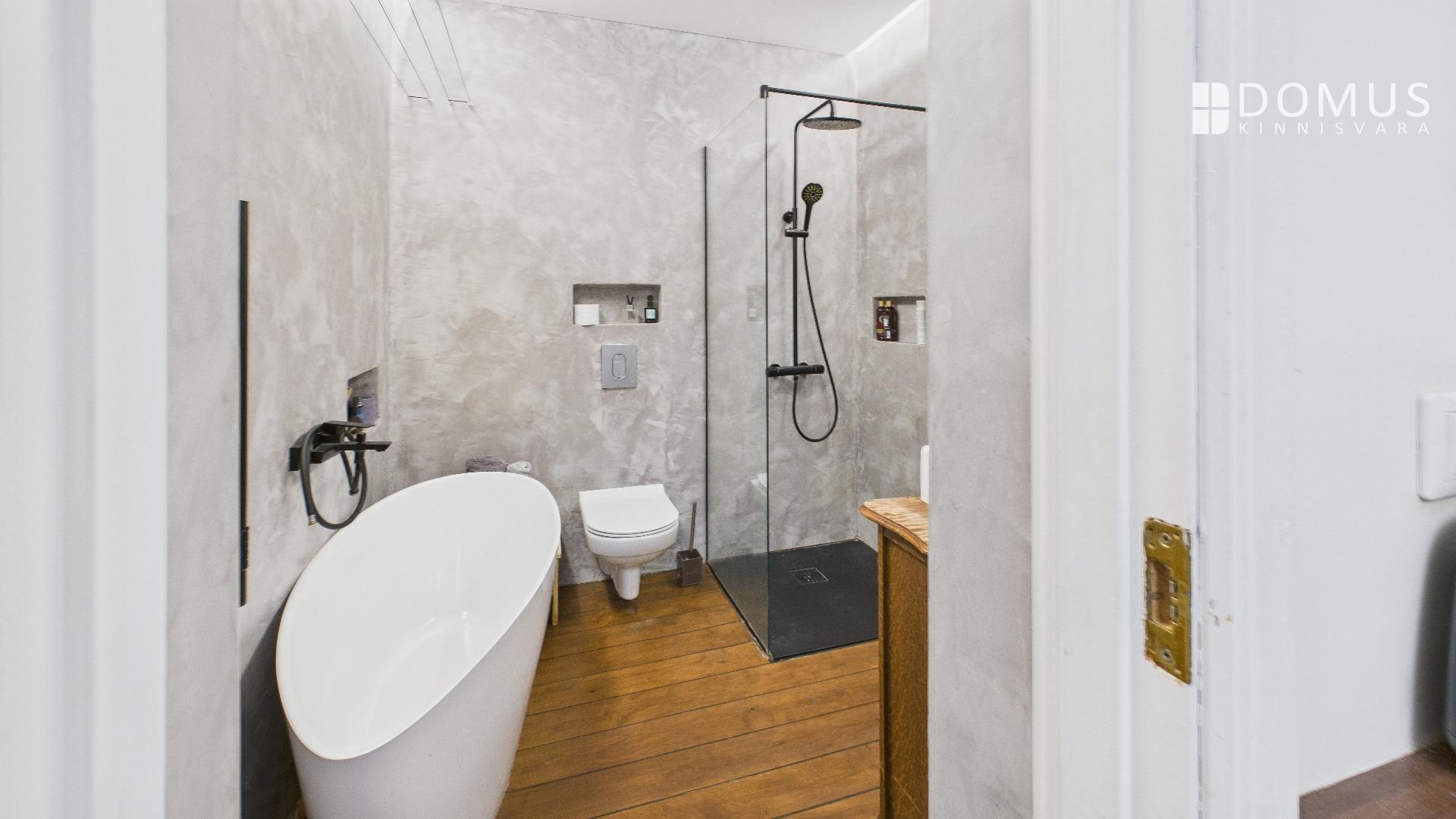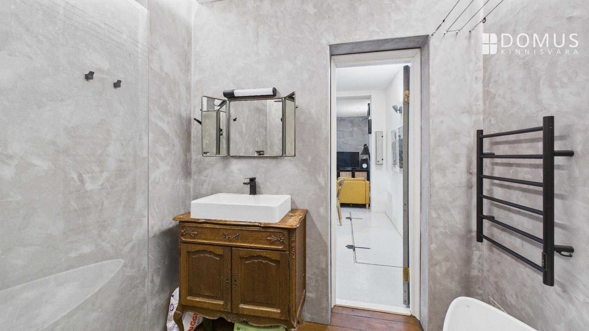 Vannituba on renoveeritud: mikrotsementseinad, immutatud tammepõrand, uus kanalisatsioon, vann, dušš, rätikukuivati. Eraldi on pesumasin. Soovi korral võib korterisse sisse jääda mööbel, lepime eraldi kokku.