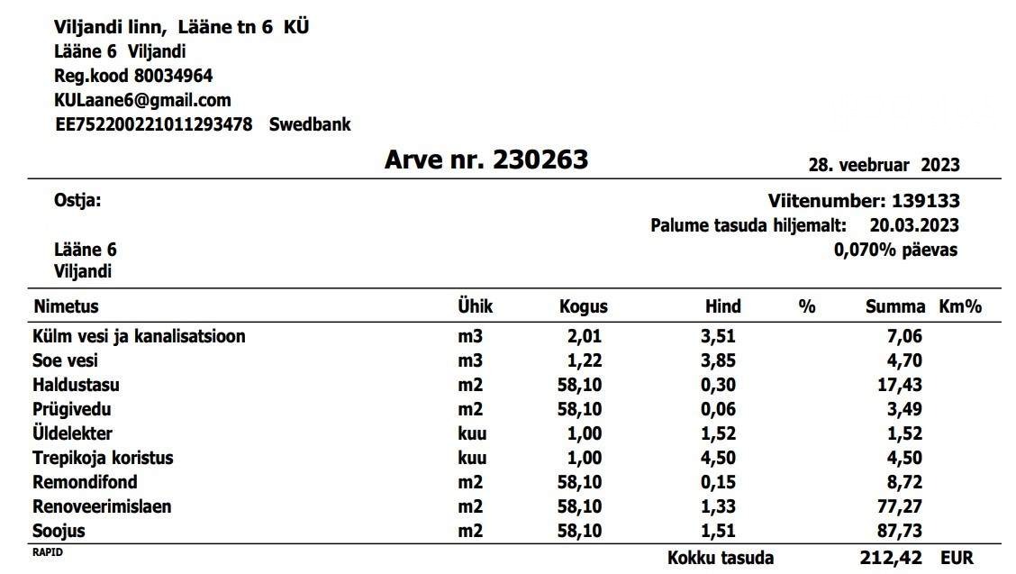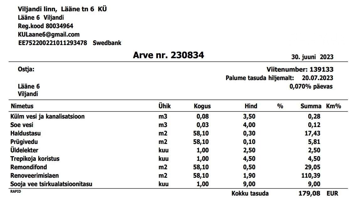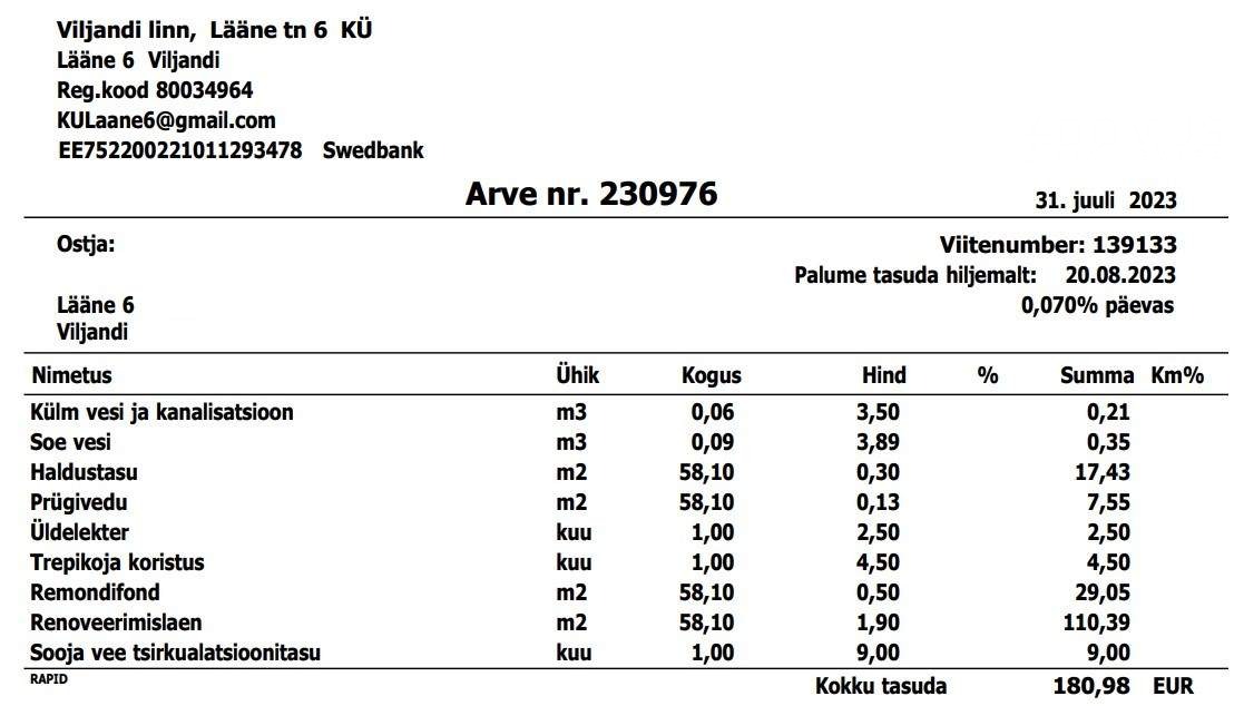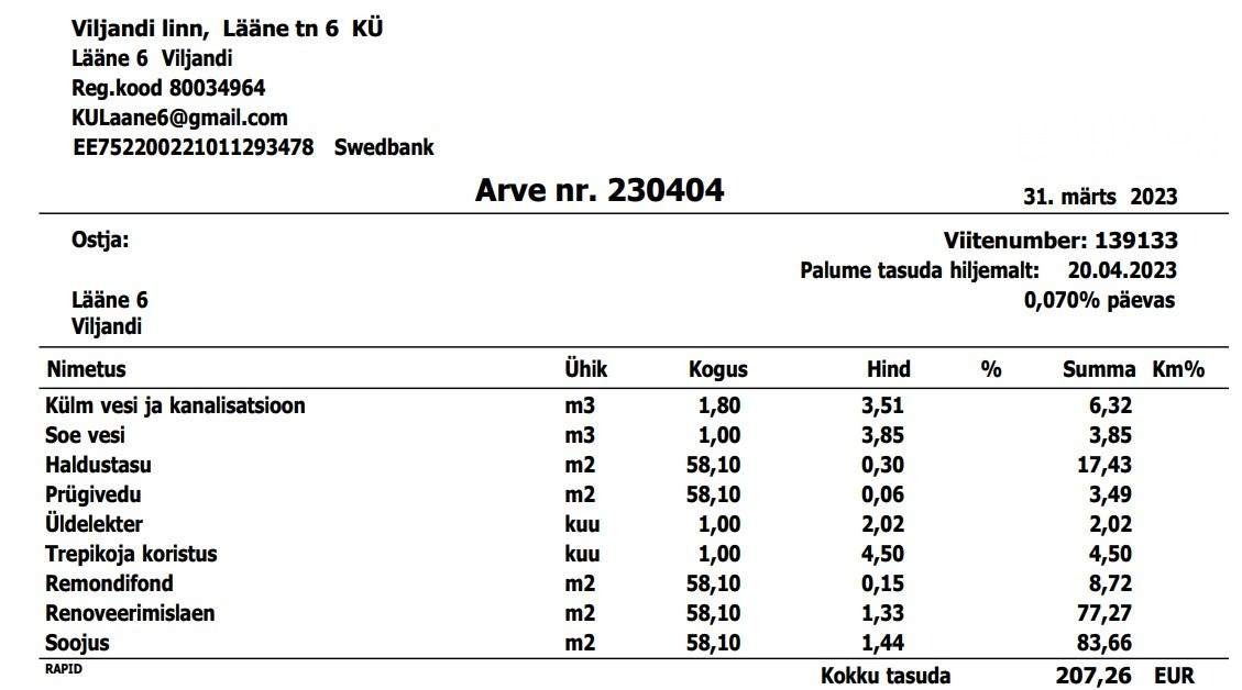 lepingutasu 1 kuu üüri ulatuses 440€ + km