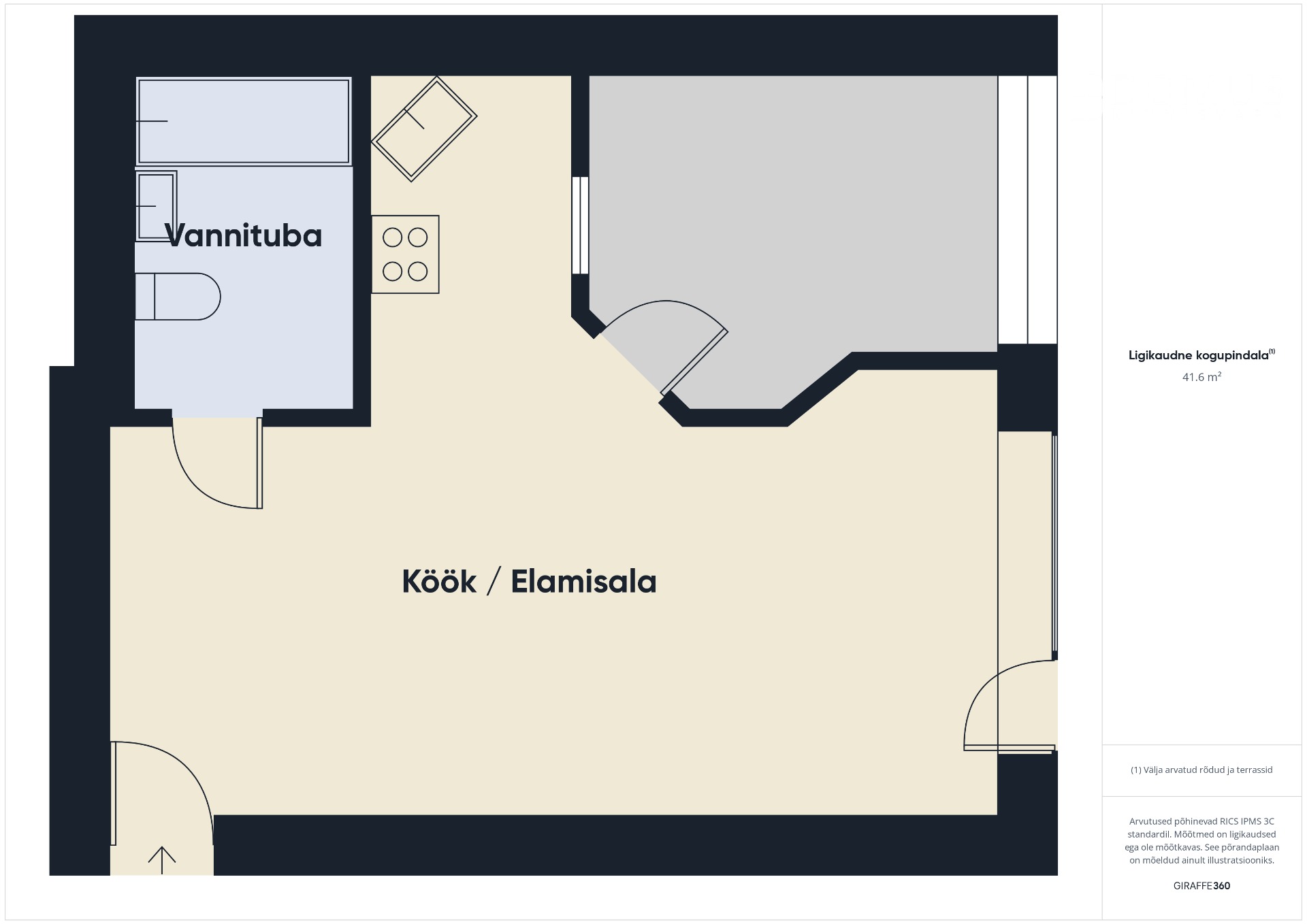 Korteriomandi üldpind on 46,0 m², millest eluruum pinnaga 41,5 m² + panipaik soklikorrusel 4,5 m²