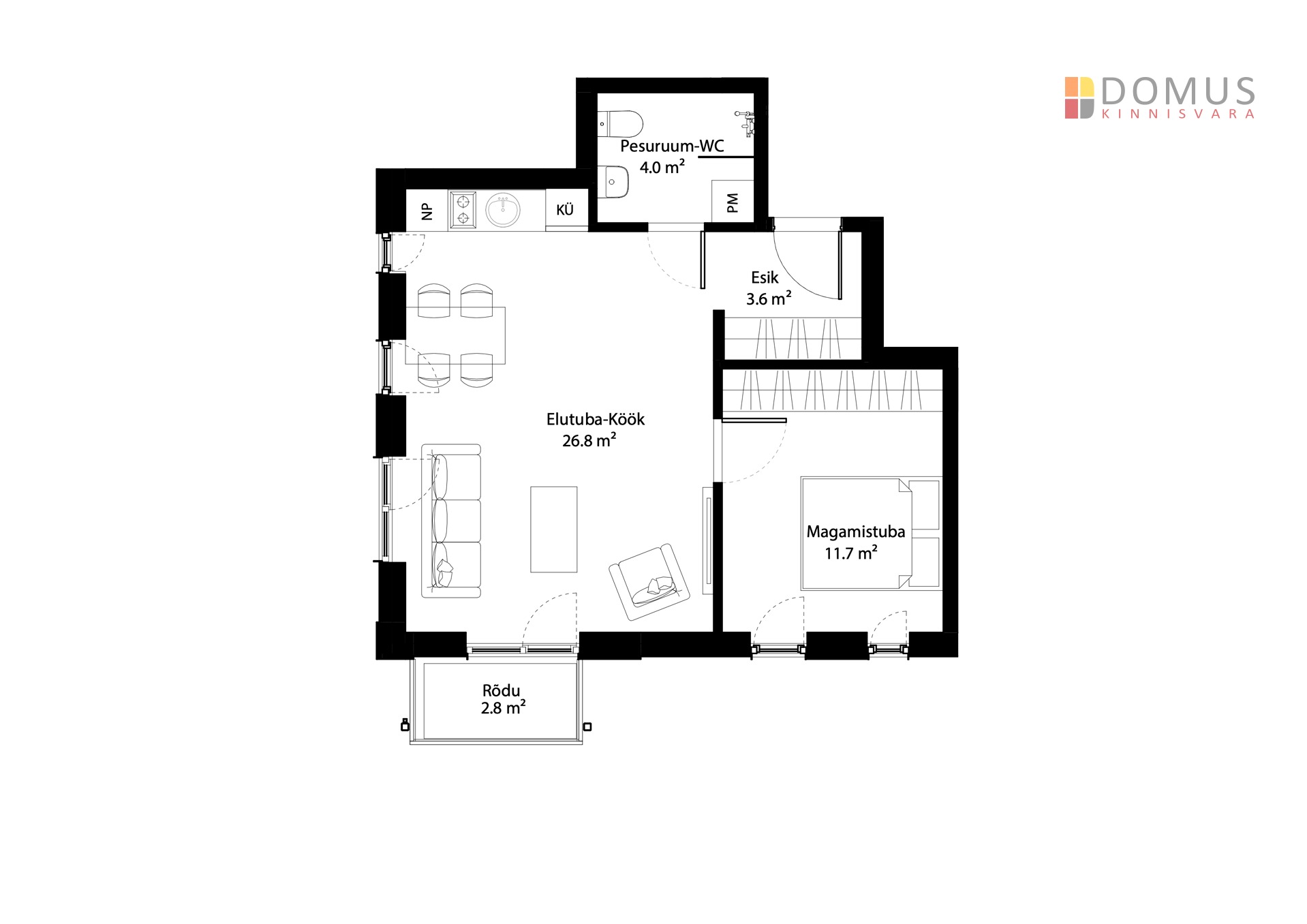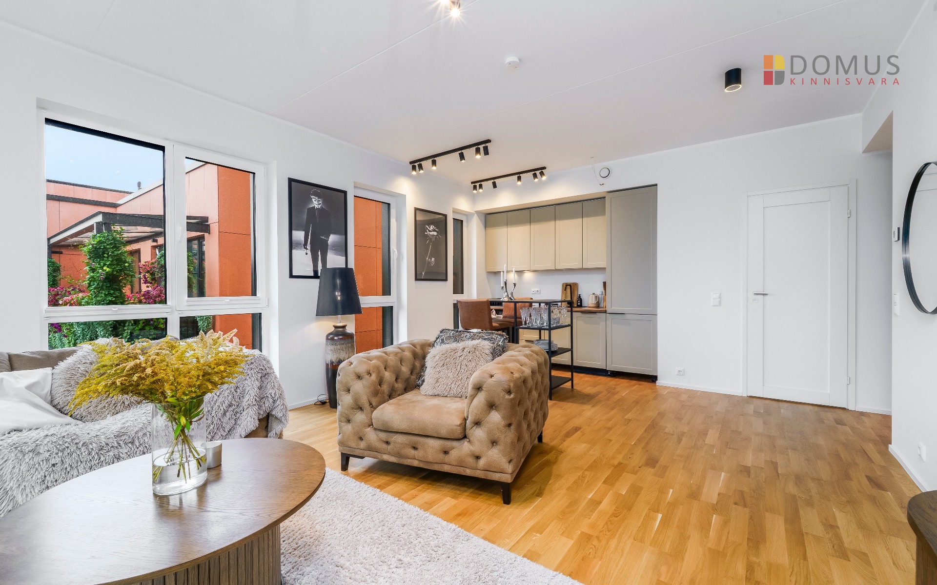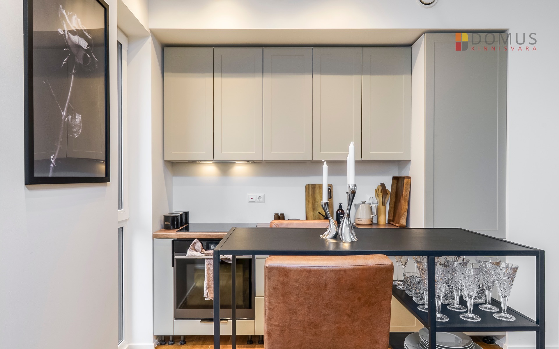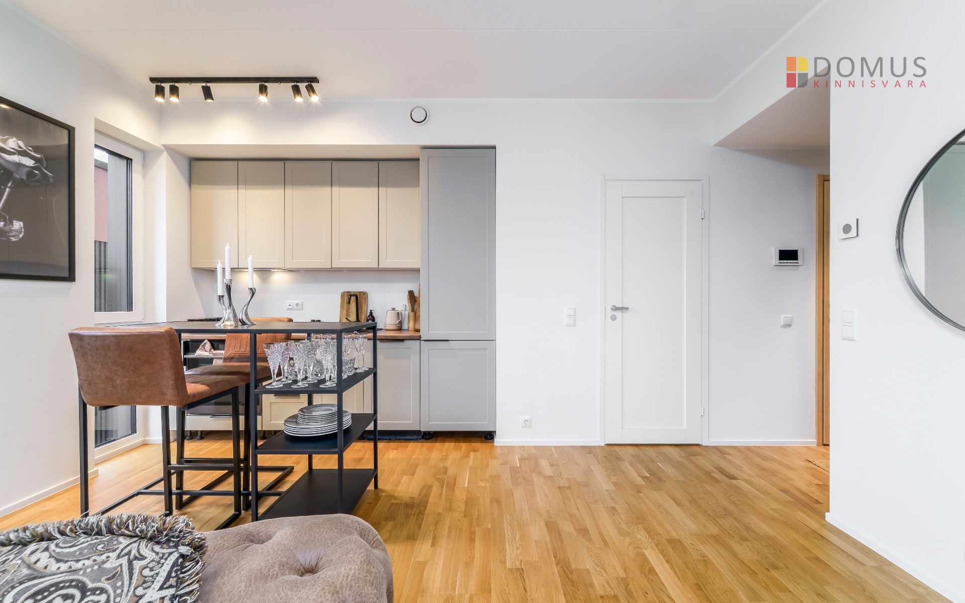 Elutuba-köök 26,8 m² – valgusküllane ja nutikalt lahendatud tuba koos täisfunktsionaalse köögi ja integreeritud tehnikaga.