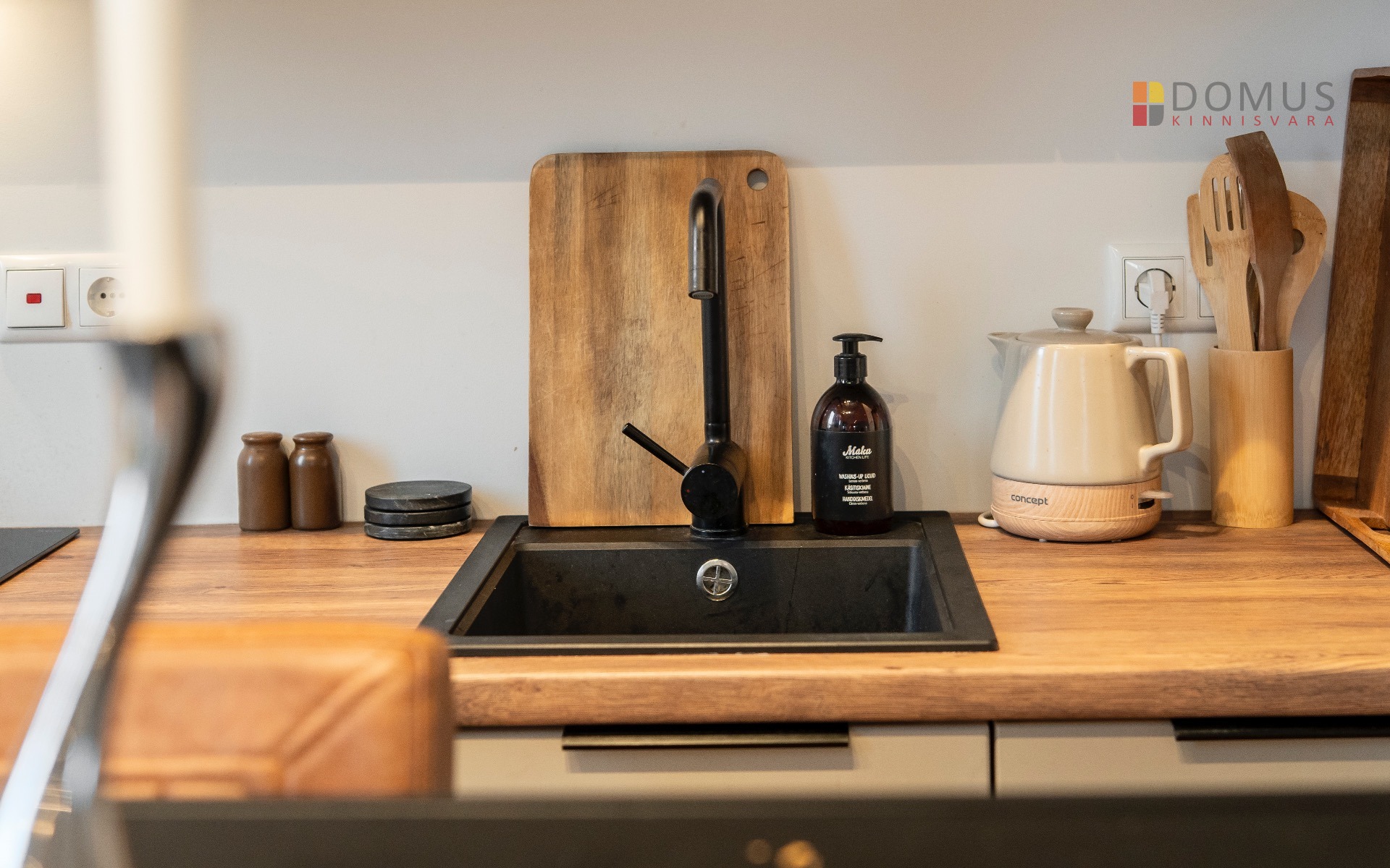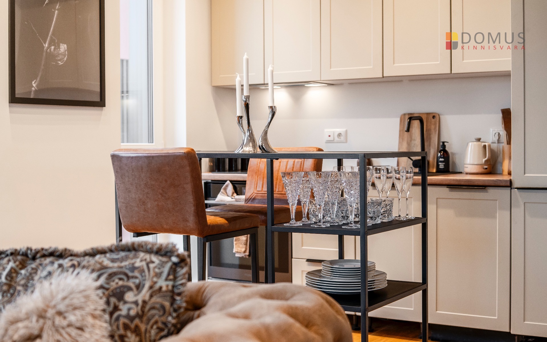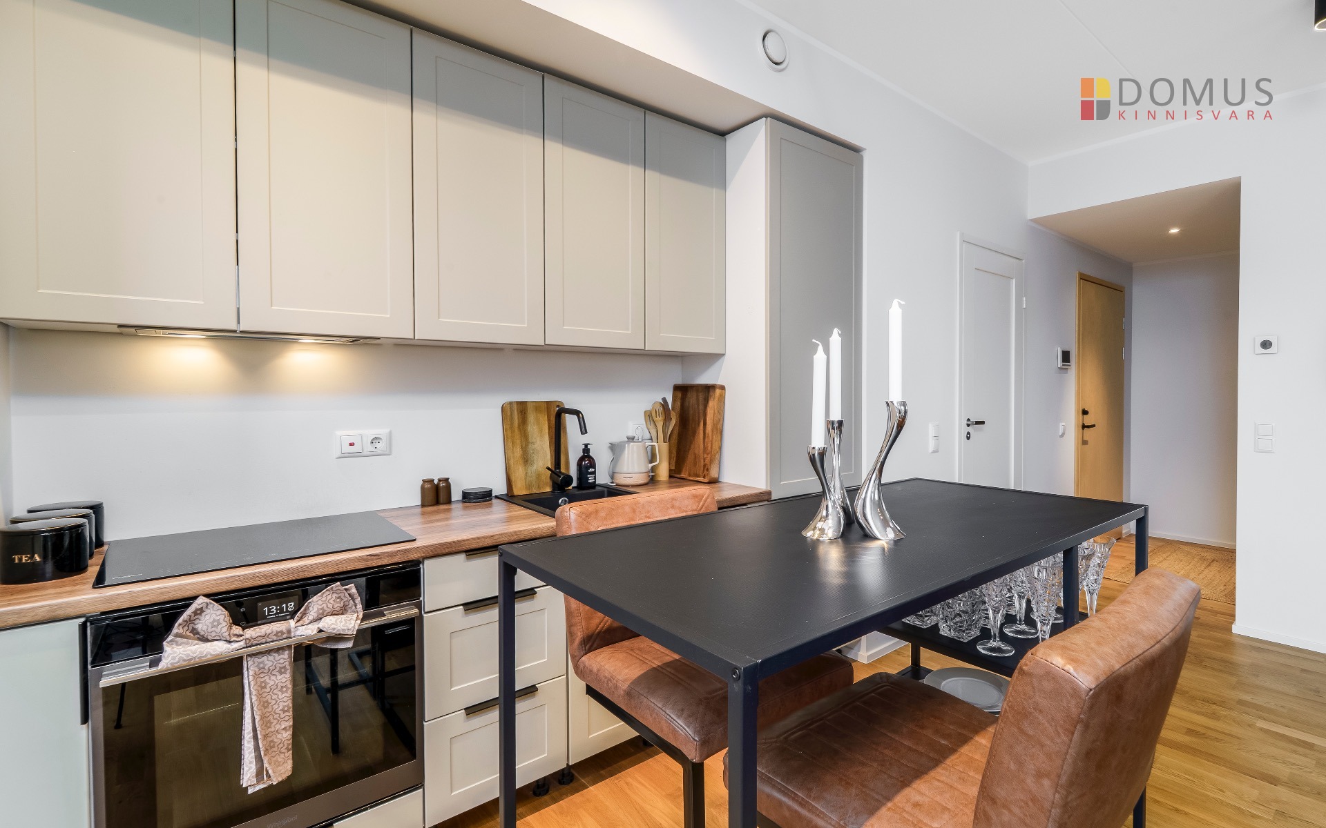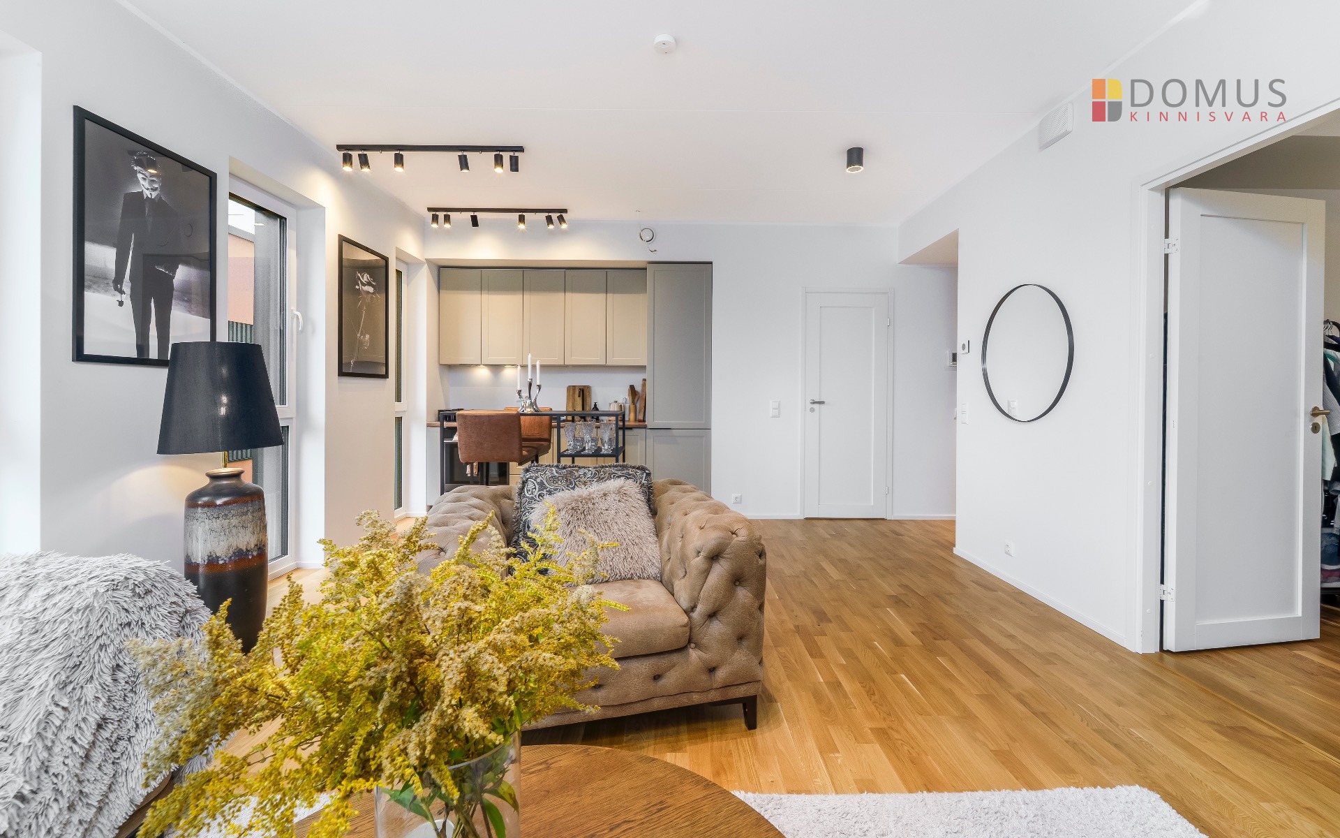 Elutuba-köök 26,8 m² – valgusküllane ja nutikalt lahendatud tuba koos täisfunktsionaalse köögi ja integreeritud tehnikaga.