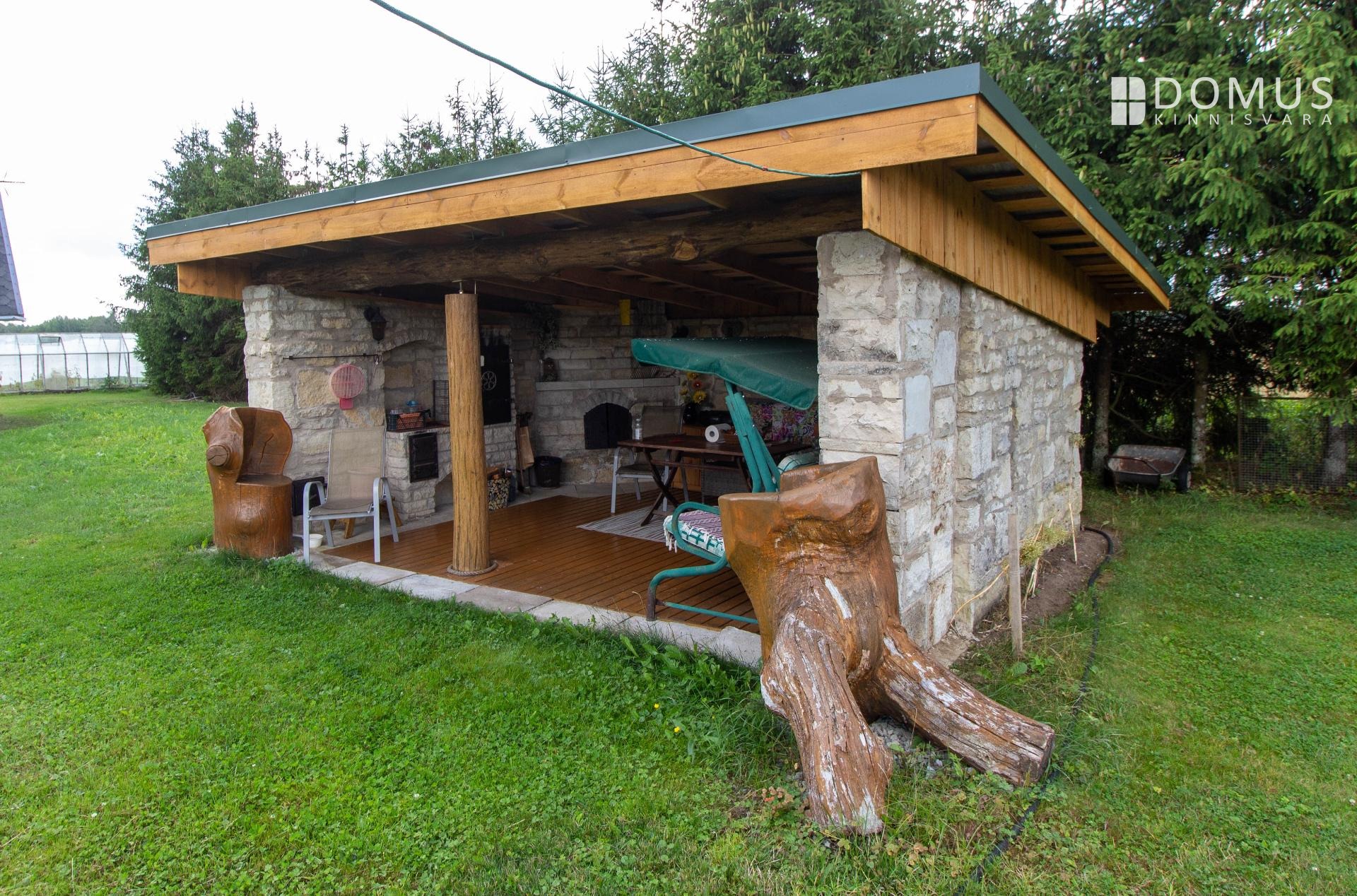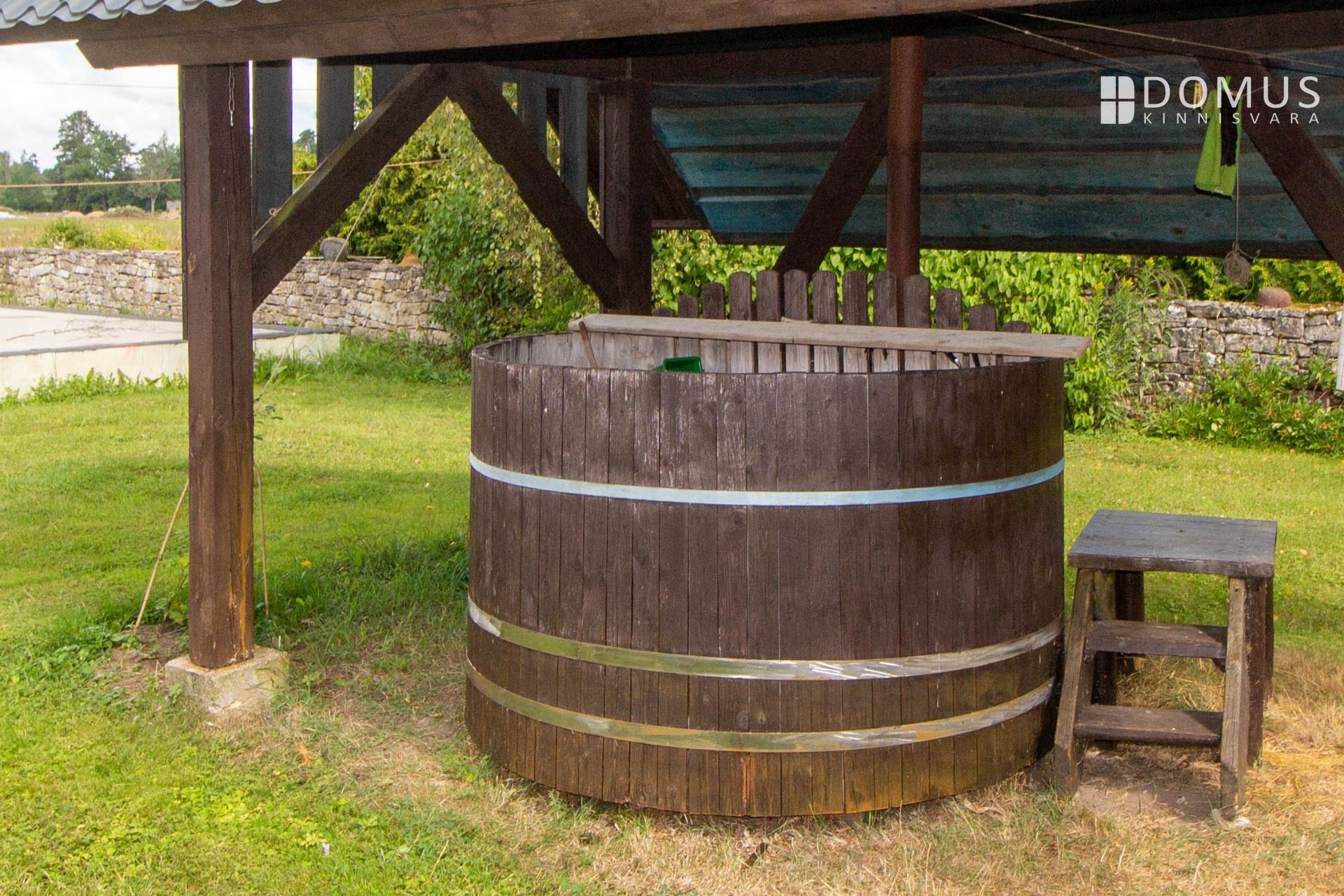 Aga saunamaja, üks tähtsamaid maju maakodus üldse, on täies hiilguses olemas. Uuepoolne palkmaja, paberid ka kõik pangakõlblikuks korda aetud. Majas sees puuküttega saun ja kamin ja kahel korrusel mõnusad küliliviskamise kohad. Sauna ees on kümblustünn ja sauna taga veel üks tähtis maja. Ja paargu! See paekivist suveköök annab teisemehe pärisköögile silmad ette, vaib nagu pealinnas, Volta loftis.