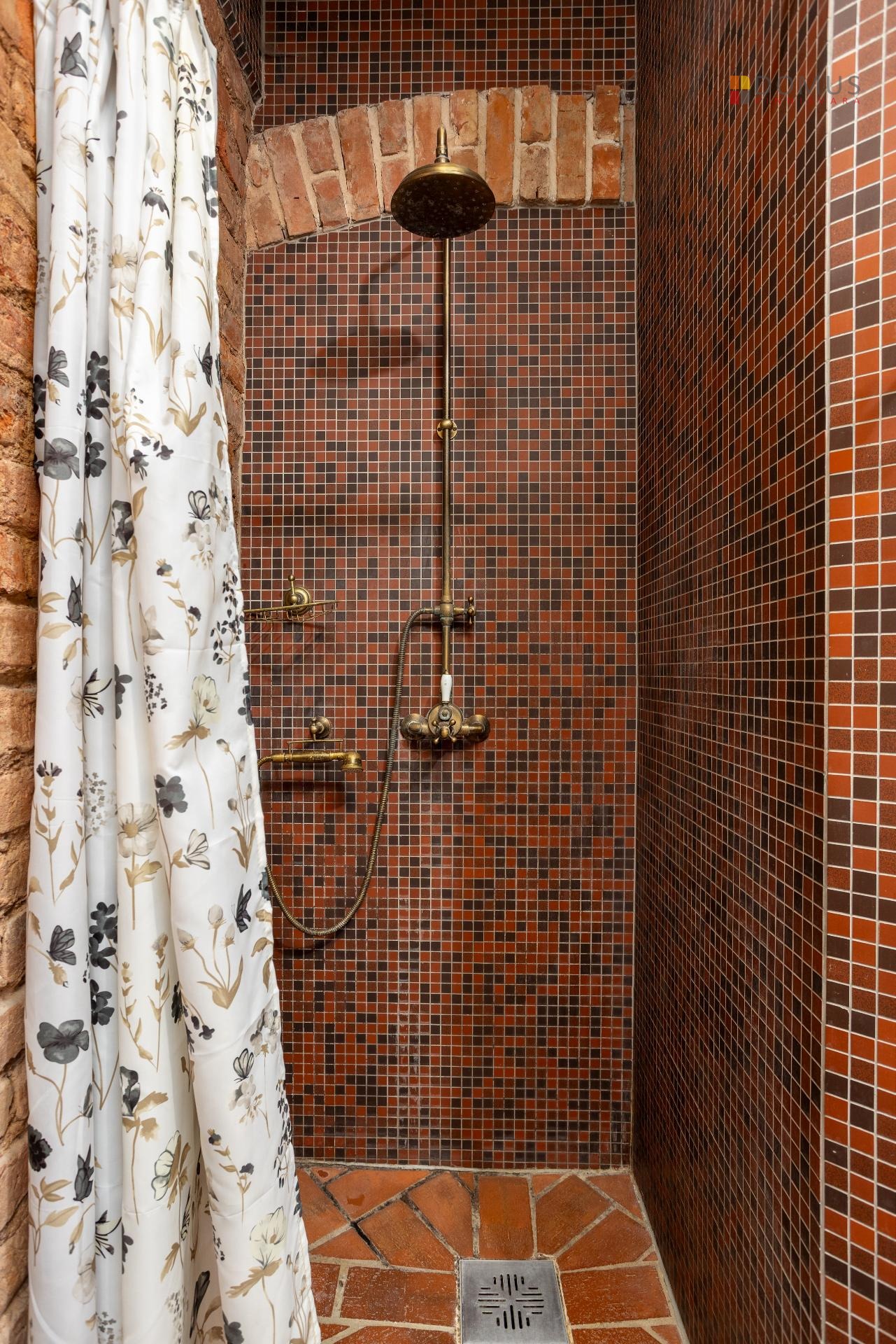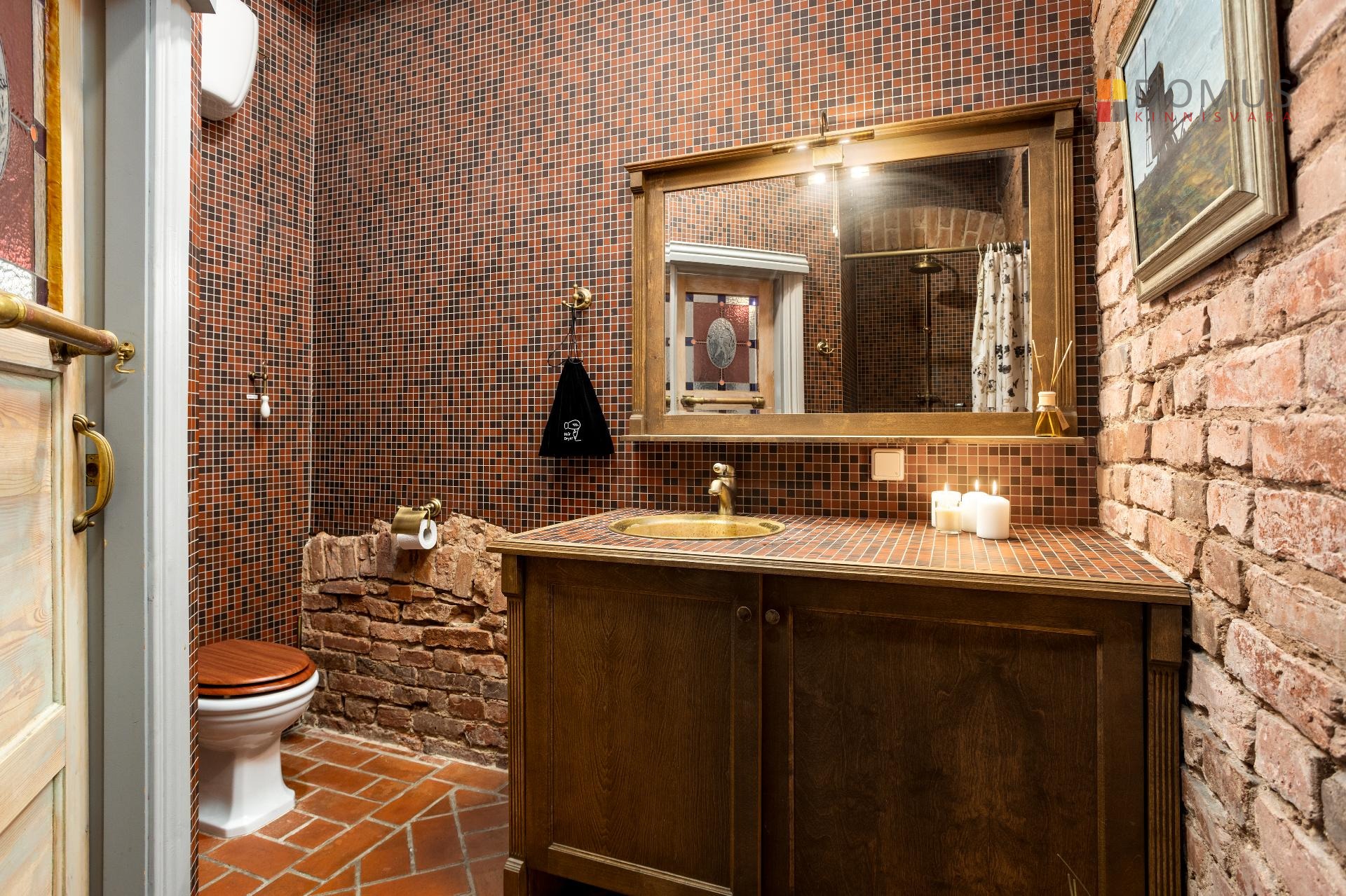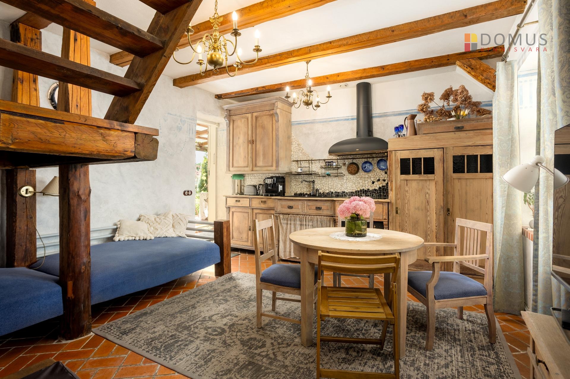 rustikaalses stiilis - põrandad ja aknalauad punasest tellisest, lagedel eksponeeritud puittalad, laes lühtrid, seintel plaatmosaiik ja