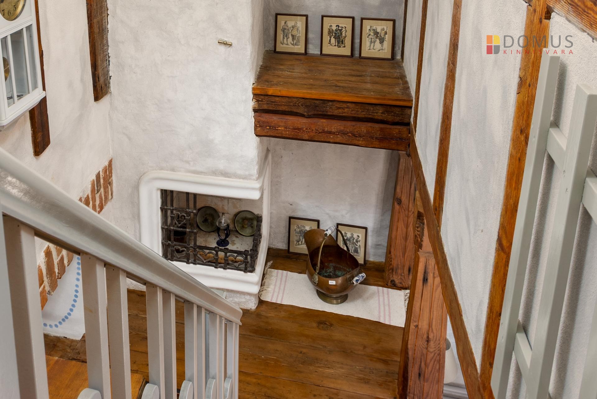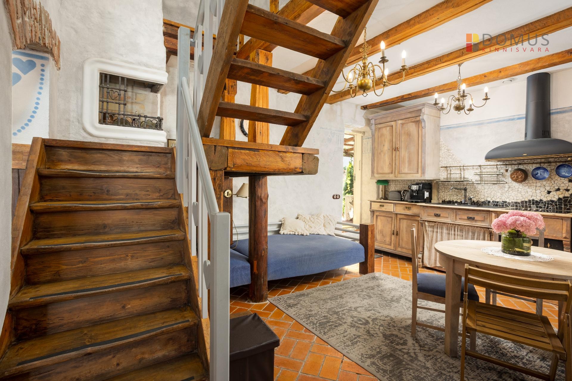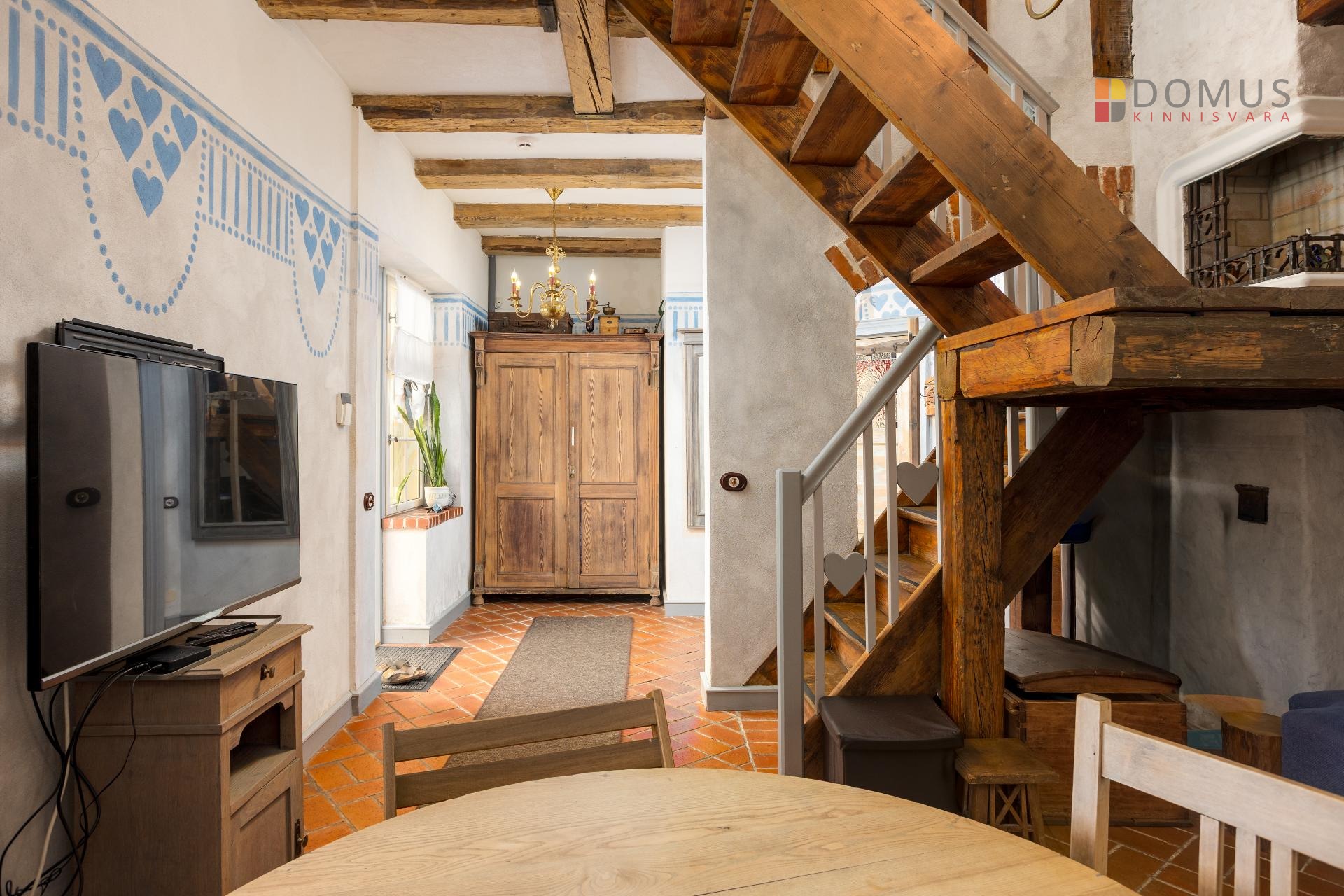 taastatud vanad laudpõrandad, seinad-laed krohvitud ja viimistletud naturaalsete materjalidega, vanad