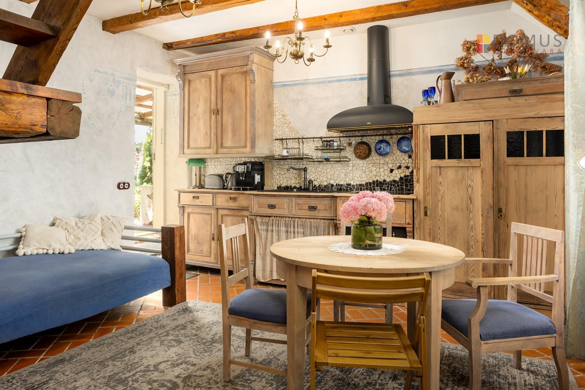 õhupuhasti ja nõudepesumasin. Lisaks antiikne köögilaud, toolid, spetsiaalselt sisseehitatud diivan-