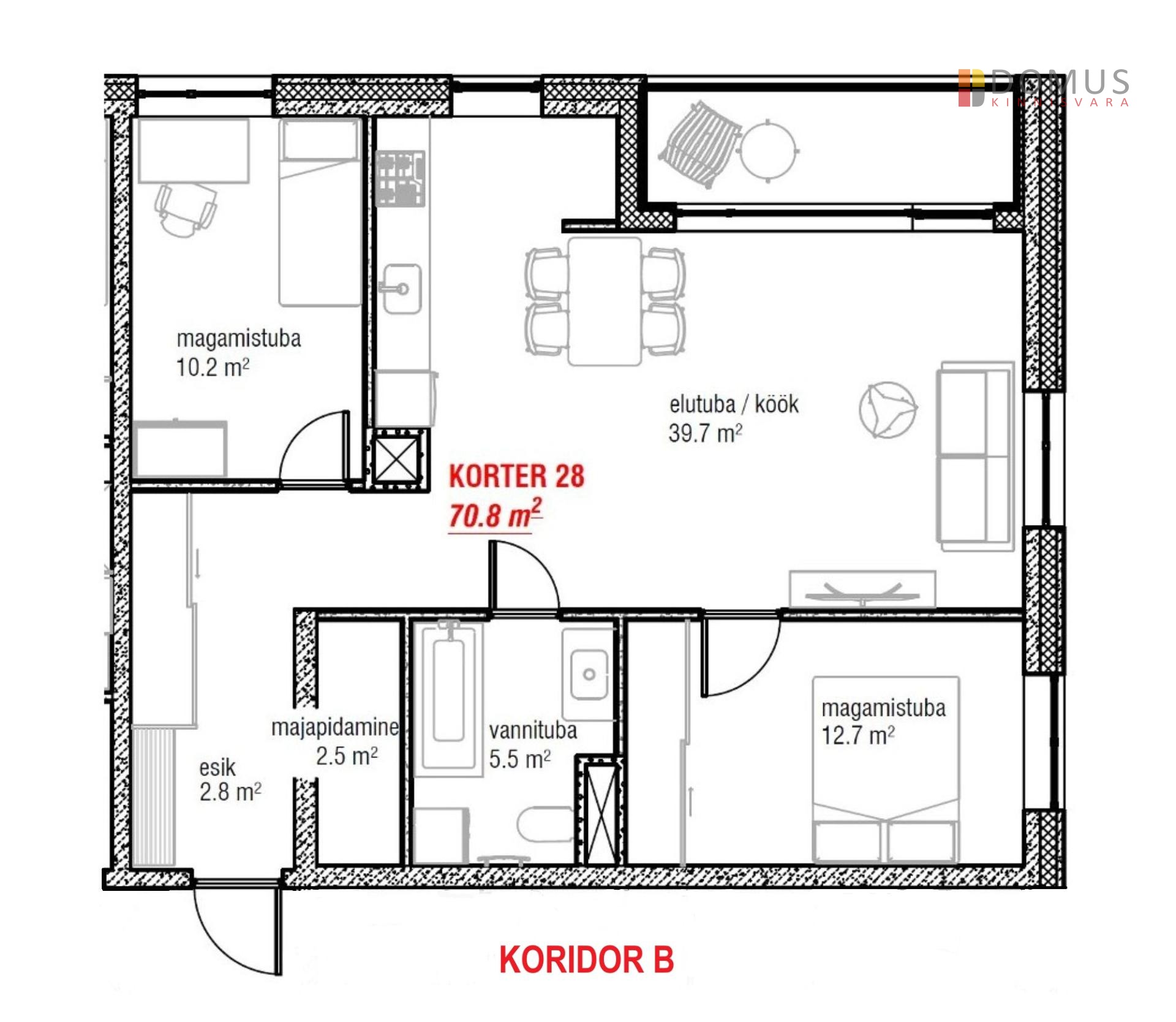 Korteri elamispind on 70,8 m², millele lisandub rõdu (5,2 m²) ja panipaik (2,5 m²).