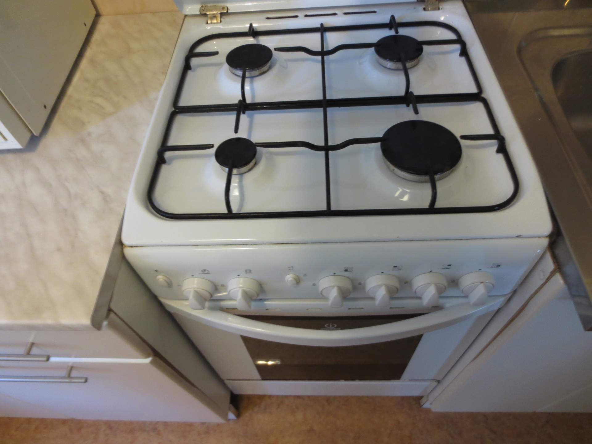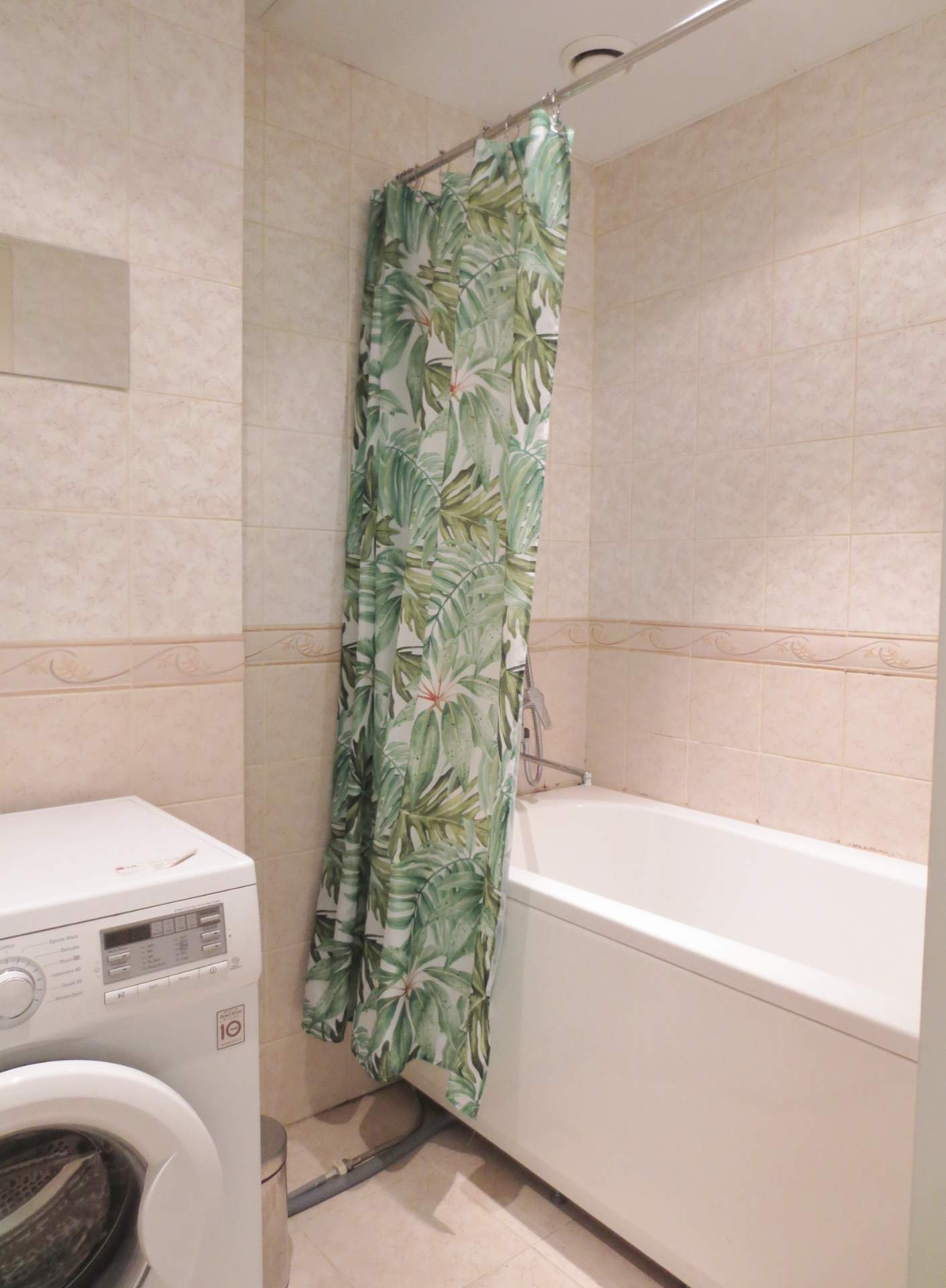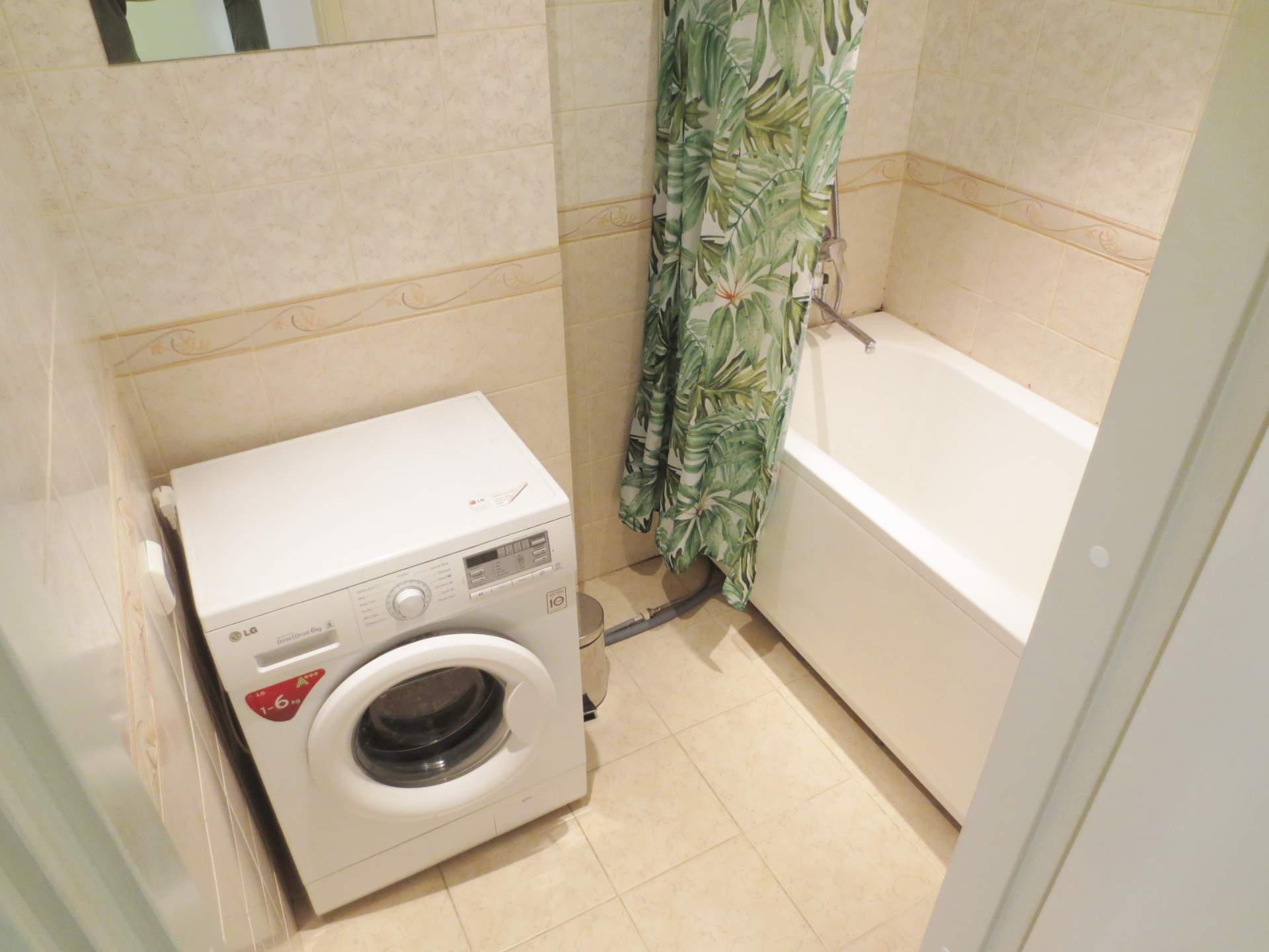 Korteri sisustus: köögimööbel, gaasipliit, külmik, pesumasin, diivan, diivanilaud. Vannitoas on vann.