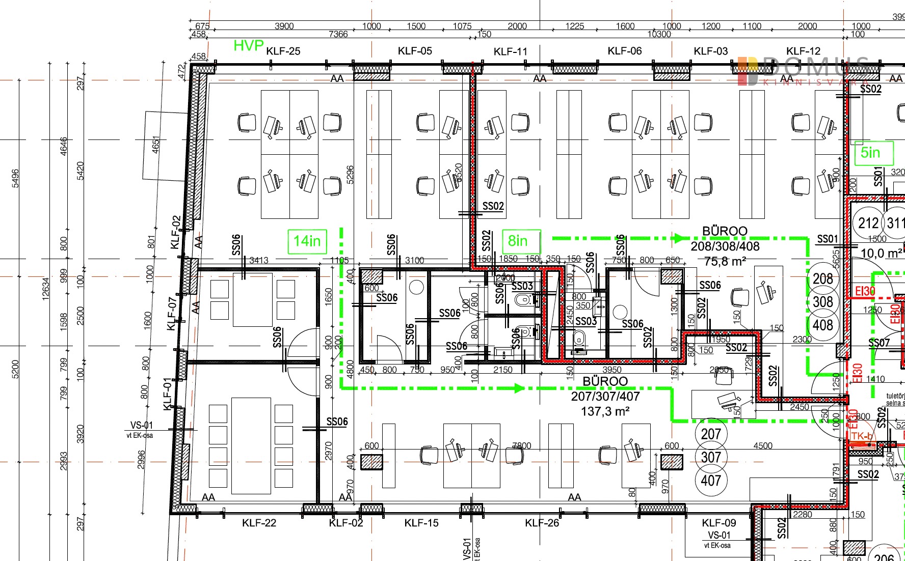 Büroo paikneb maja 2. korrusel ning on suurusega 137,3 m². Ruumilahendus sobib hästi ettevõtetele, kes vajavad eraldi tööruume või teeninduspinda.