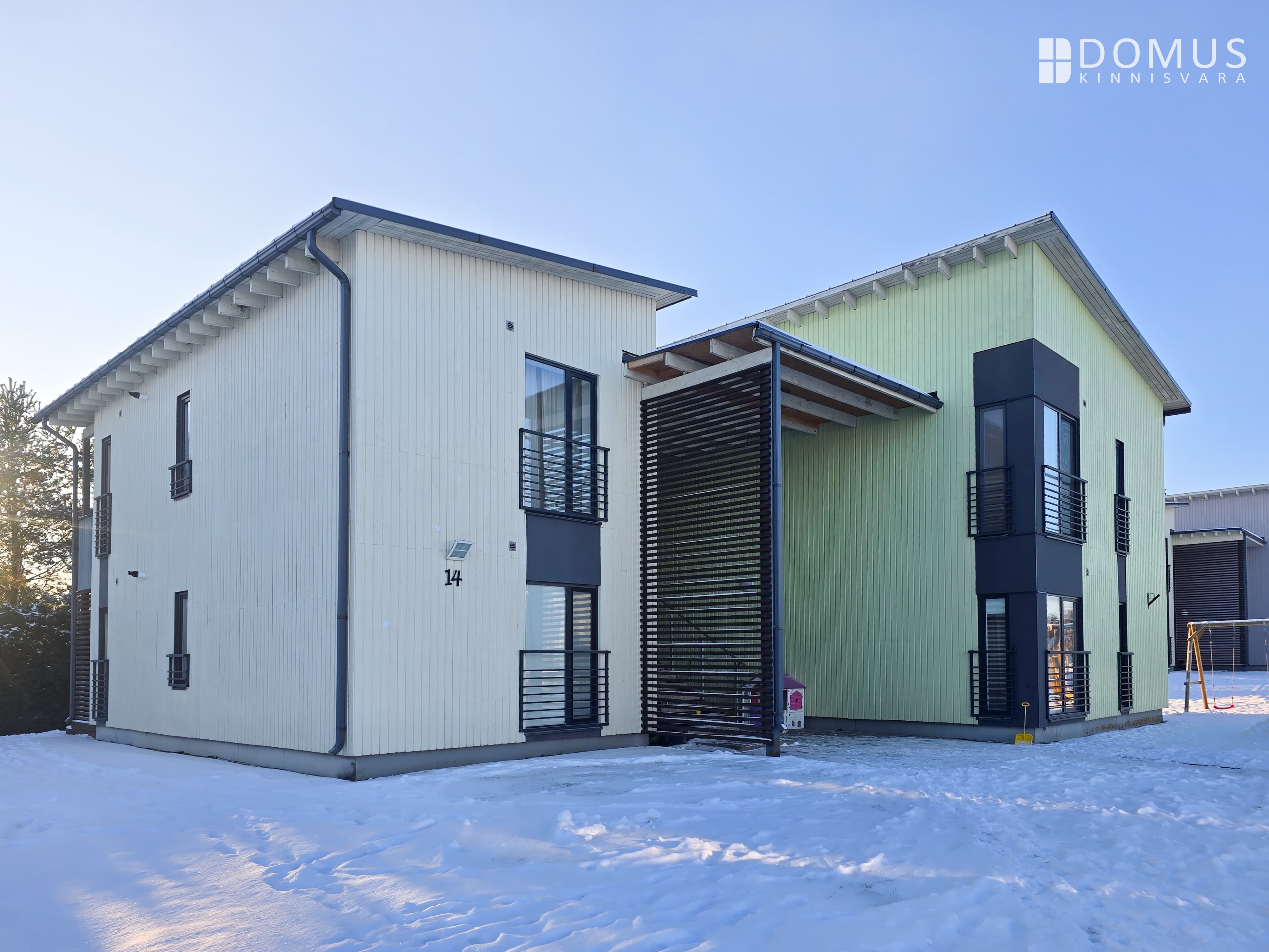 Tartu lähedal Ülenurmes, kompaktses ja rahulikus elamurajoonis, kus omavahel põimuvad eramud ja madalad kortermajad, asub Männikäbi 14. Kahekorruseline ja madala profiiliga kortermaja sobitub loomulikult ümbritsevasse keskkonda ning mõjub pigem koduselt kui linnalikult.