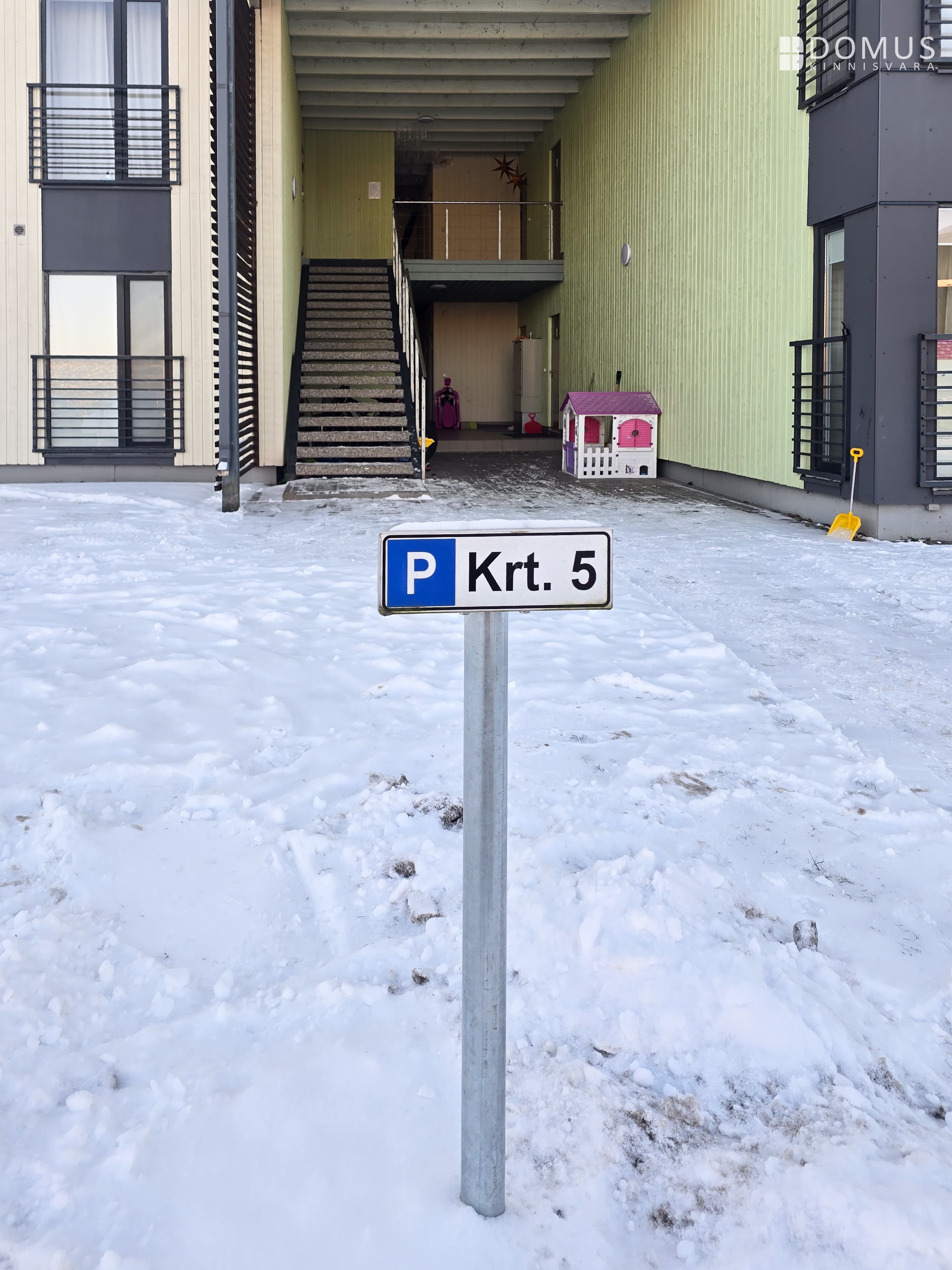 Kindel parkimiskoht maja ees, tähistatud korteri numbriga