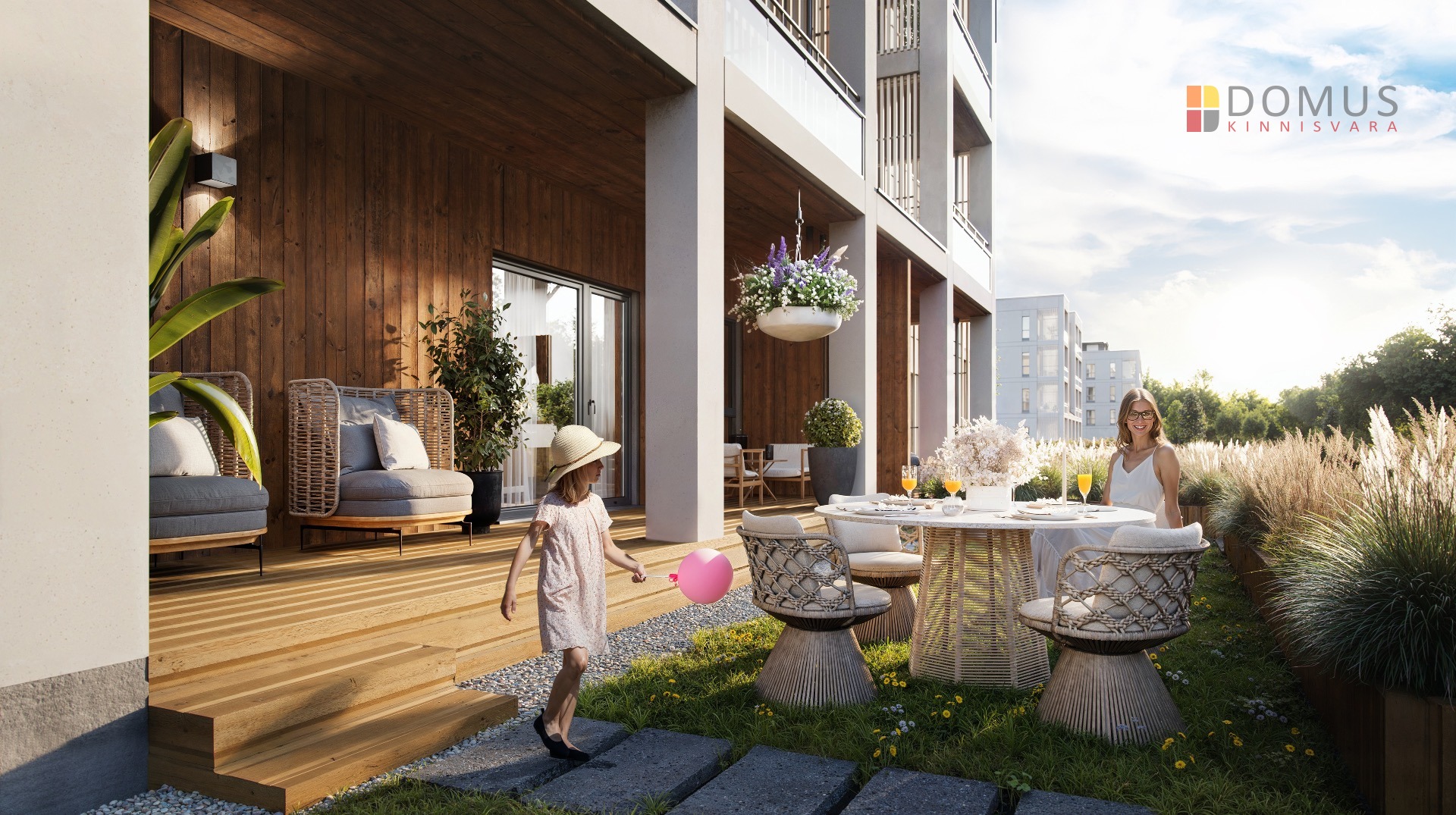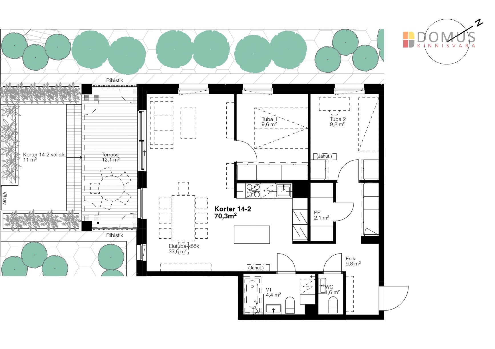 Raadiraja 14 maja 3-toaline korter nr 2 asub esimesel korrusel. Kodu koosneb esikust, avatud köögiga elutoast, kahest magamistoast ja WC/duširuumist. Siin on rohkem avarust tänu 2,9m laekõrgusele. Avar 12,1 m² terrass on justkui sinu isiklik lisatuba vabas õhus. Siia mahub vabalt rohelusest pakatav botaanikaaed, suvine võrkkiik või väike hommikukohvi nurgake, kus päeva rahulikult alustada. Soovi korral saab terrassi klaasida, et nautida loodust igal aastaajal. Terrass on sellel korteril maja otsa peal, kus privaatsust rohkem, sest teisi terrasse siin küljel pole.