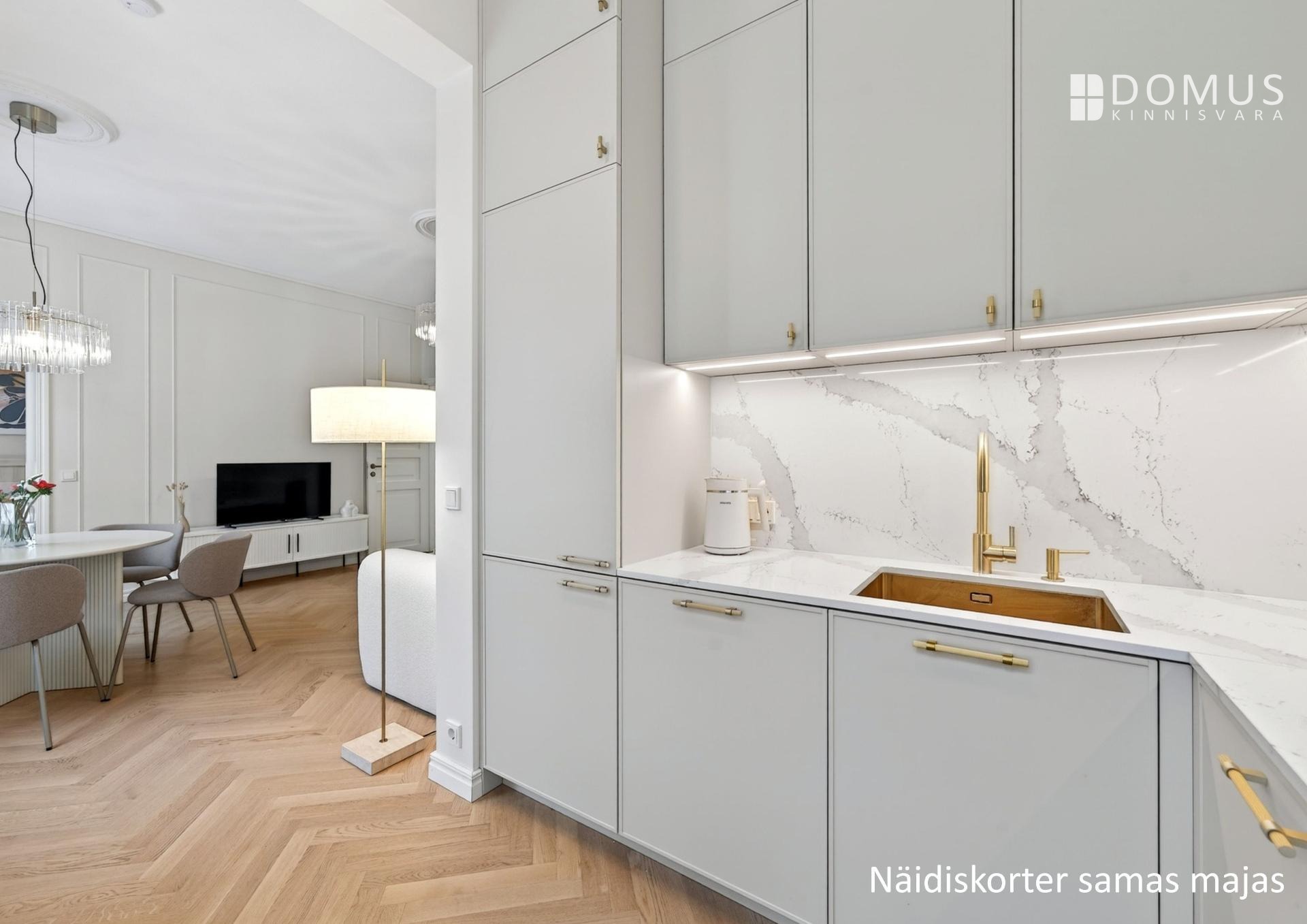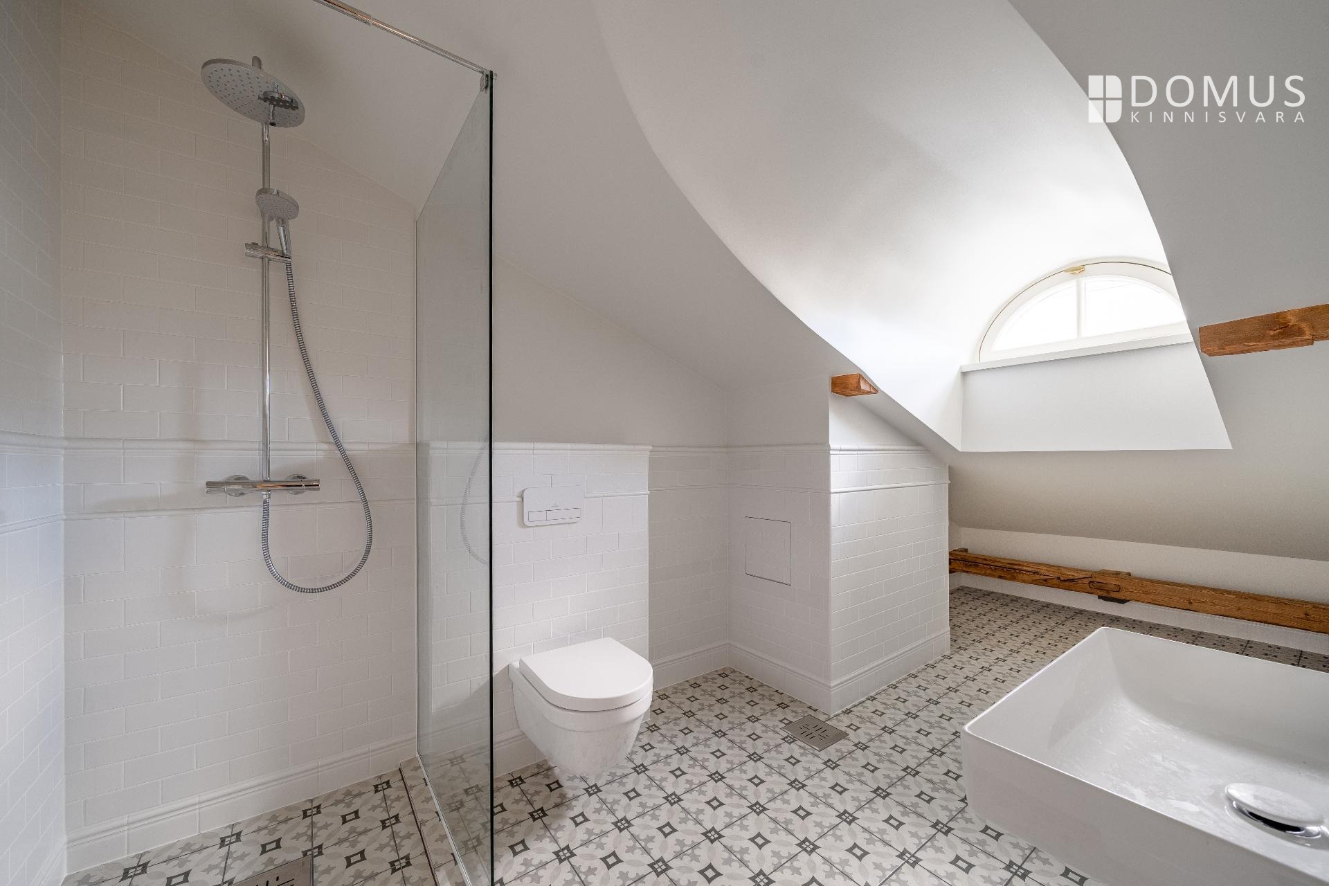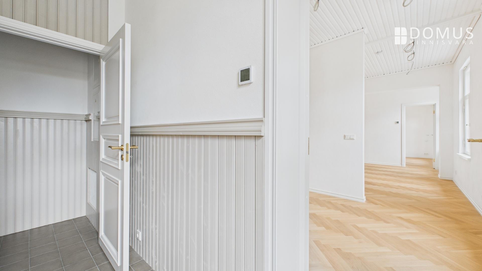 Muinsuskaitsealusele majale väärikalt rõhutasime selle ajastut kvaliteetsete materjalidega tänapäevases võtmes. Puitparkett kalasabamustris, puitlaudis esikuseintel ja elutoa laes, ehisdetailidega keraamilised plaadid vannitoas. Korteri seinu katab samuti looduslik materjal - lubikrohv, mis jätab kergelt struktuurse lõpptulemuse ja on omaette vaatamist väärt.