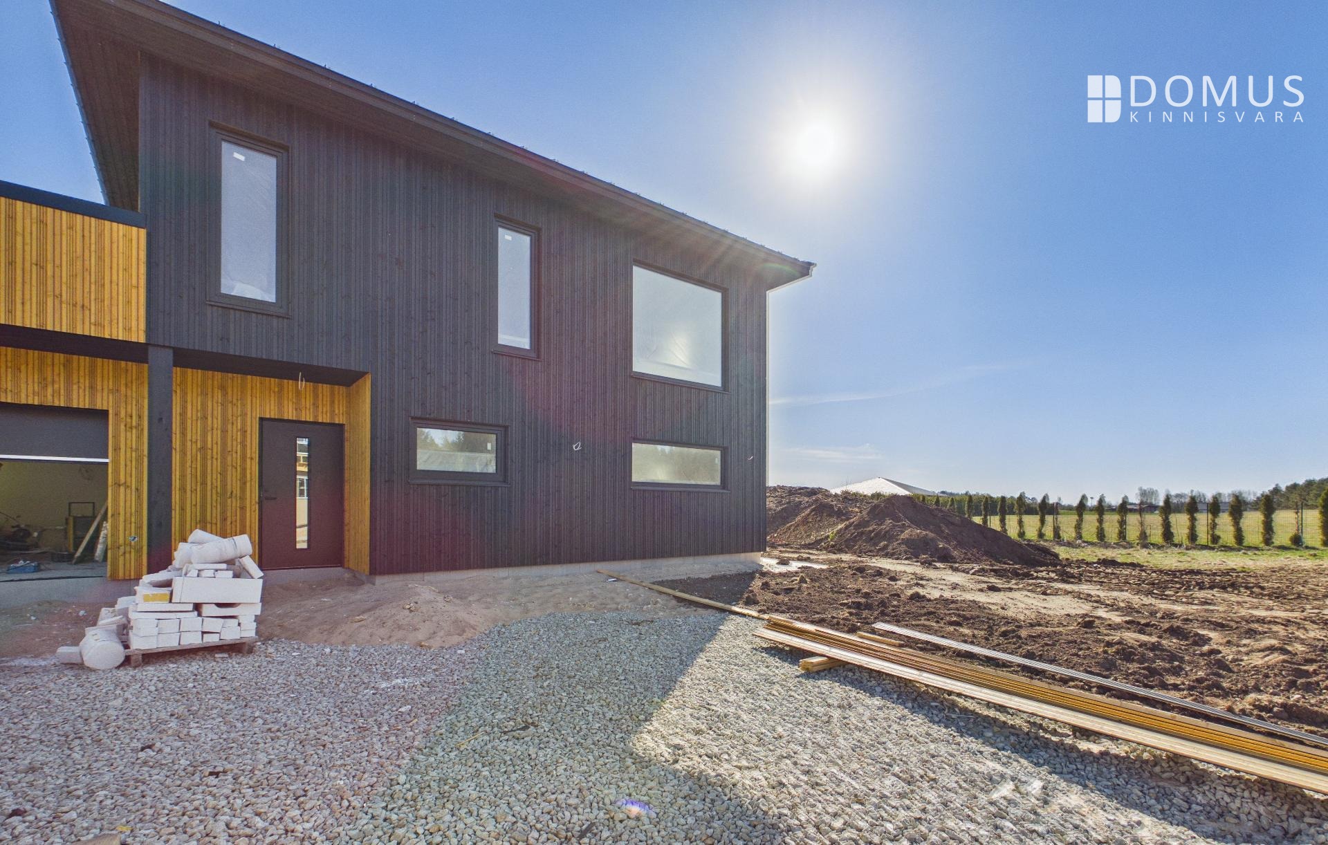 Maja fassaad on kaetud puiduga ning värvilahendus on musta ja oranži tooni kombinatsiooniga, mis loob silmapaistva ja kaasaegse ilme. Aknad on musta viimistlusega nii seest kui väljast, mis rõhutab maja modernset karakterit. Katusekatteks on Ruukki Silent Classic mustas toonis, mis täiendab terviklikku disaini.