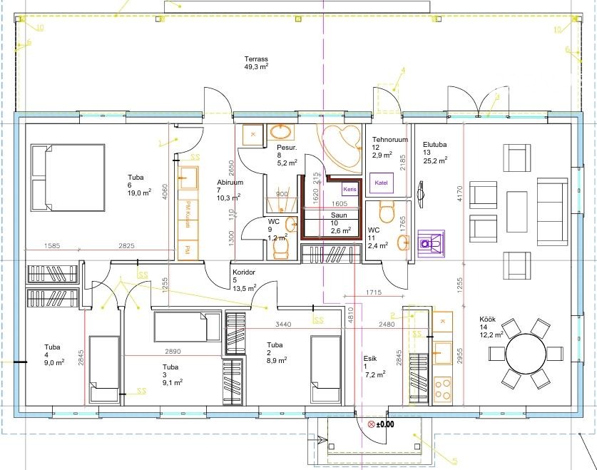 •Ruumilahendus Esik, elutuba-köök, 4 tuba, WC, abiruum, WC, vannituba, saun, terrass.