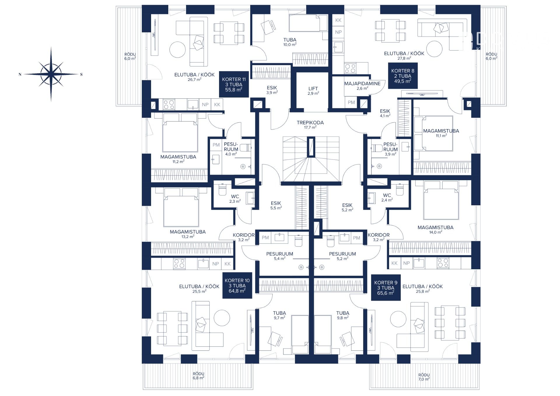 Korter nr 8 – valgusküllane ja praktilise planeeringuga 2-toaline kodu (netopind 49,5 m² + rõdu 6,0 m²)