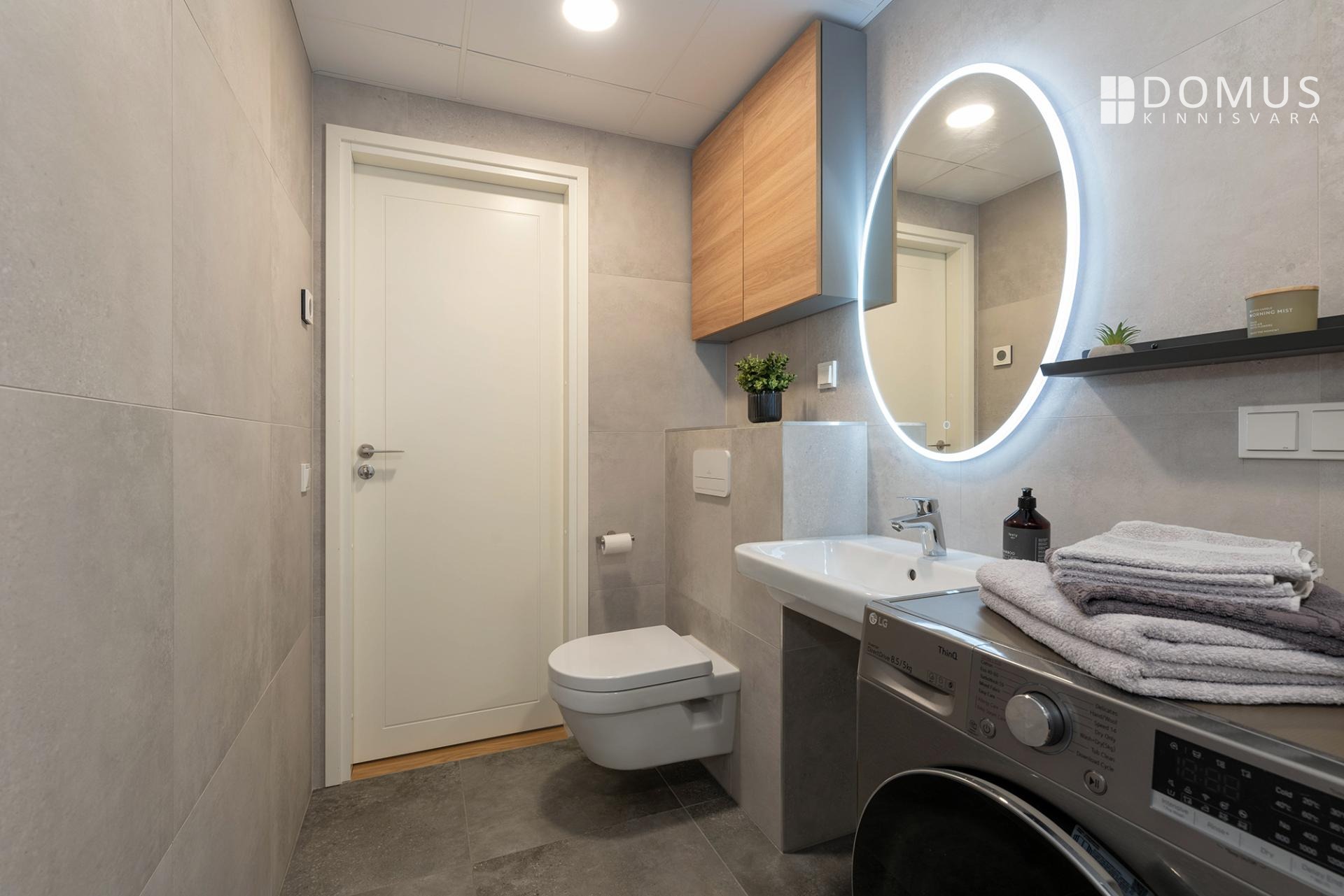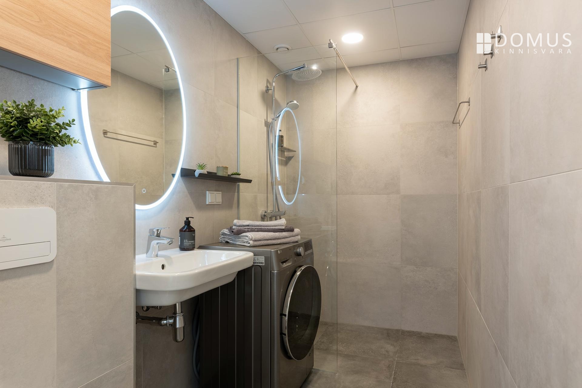Klaasidega eraldatud duššinurk, valgustusega peegel ja pesumasin.
