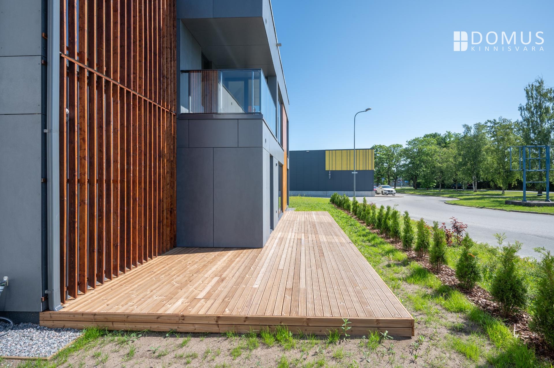 Elutoa ees asuv suur terrass pakub mõnusat võimalust õues aega veeta ja päikest nautida. Kevadel istutatakse terrassi äärde lisaks kõrgemad elupuud, mis täiendavad olemasolevat haljastust ning lisavad rohelust ja eraldatuse tunnet. Majas on vaid neli korterit, mis loob rahuliku ja erilise elukeskkonna – Sakus teist samalaadset kortermaja ei leidu.