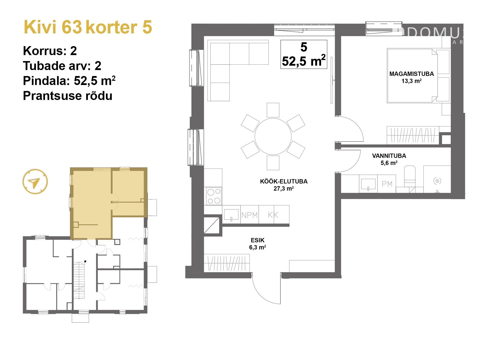 See avar 2-toaline 52,5 m² korter paikneb arendatava maja teisel korrusel ning on ideaalne kodu neile, kes soovivad praktilist planeeringut ja kesklinna lähedust. Korteri südameks on 27,3 m² suurune köök-elutuba, mis pakub avarust ja valgusküllasust nii igapäevaeluks kui ka külaliste vastuvõtuks. Lisaks kuuluvad planeeringusse eraldi magamistuba, ruumikas vannituba ning mugav esik.