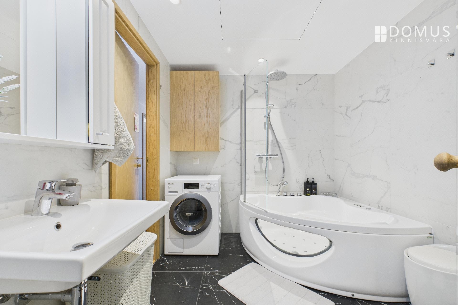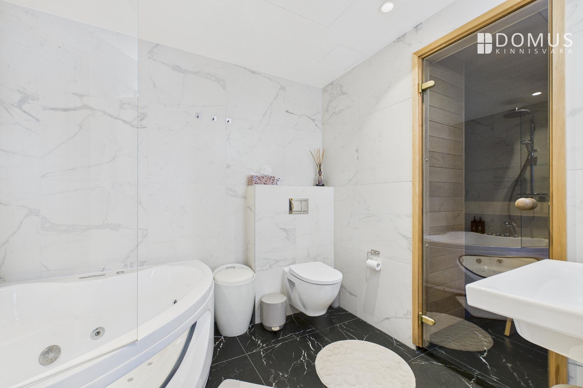 В ванной комнате установлена большая ванна с гидромассажем, создающая ощущение домашнего SPA.