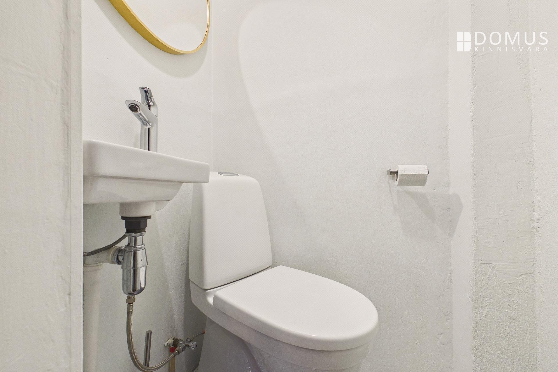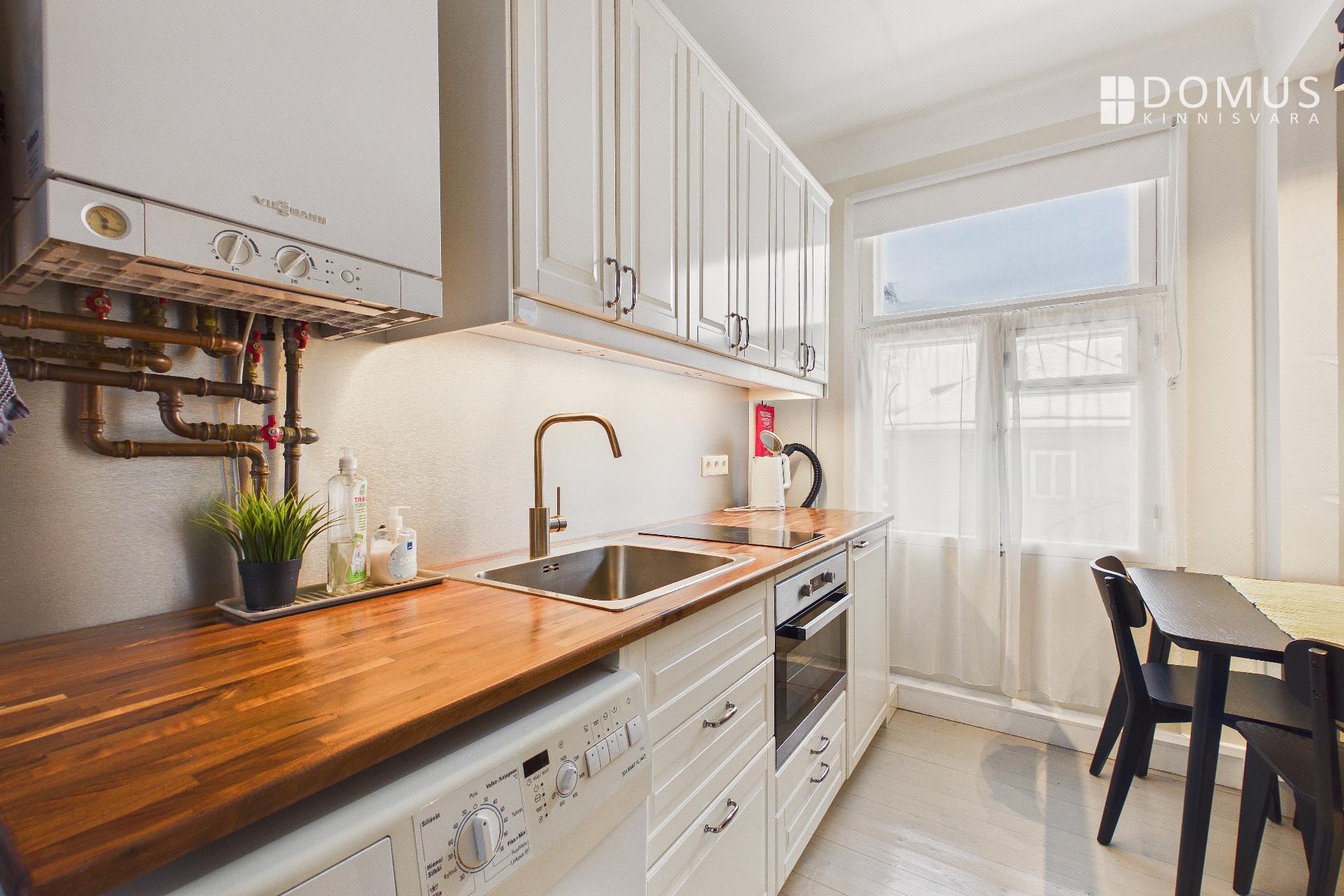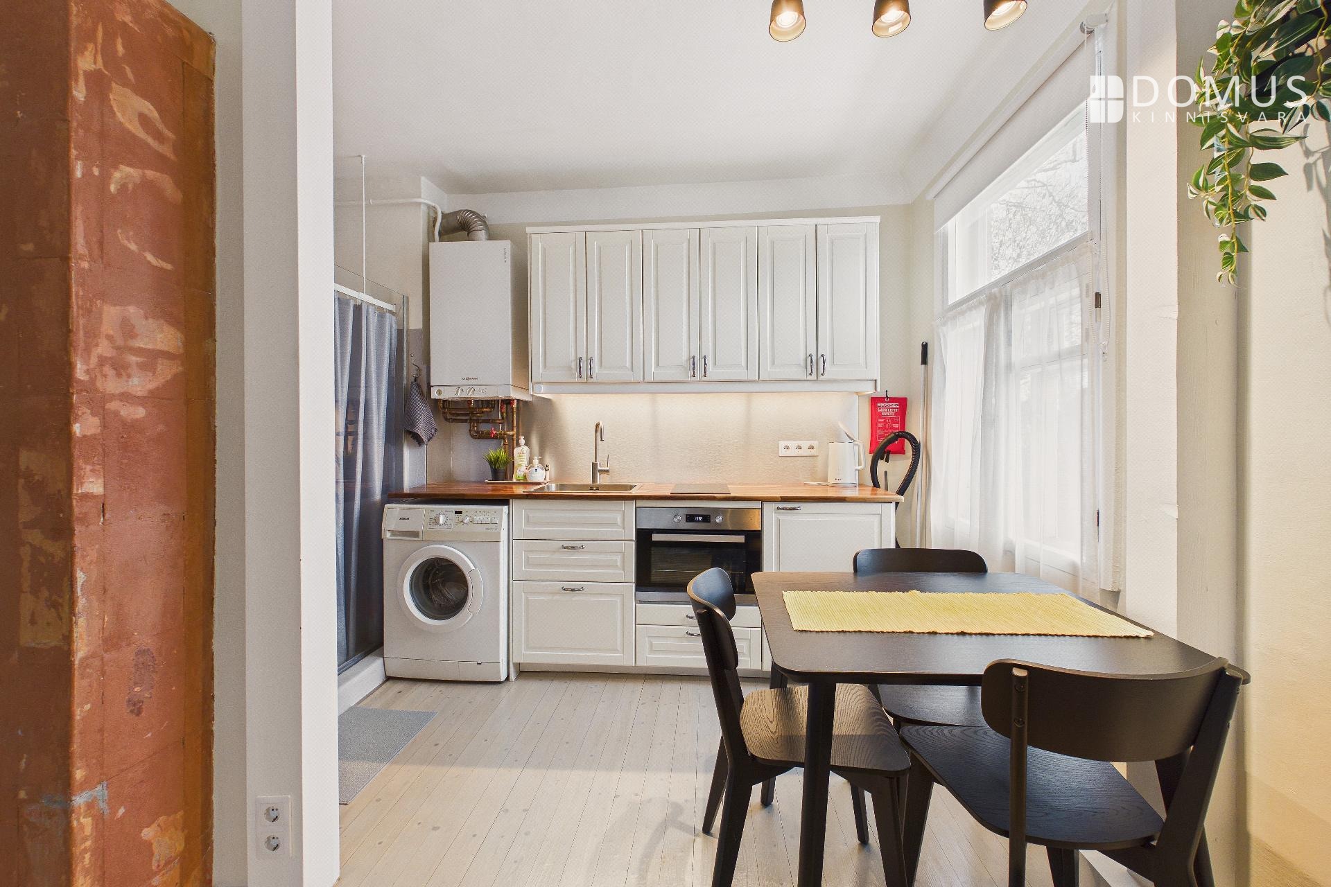 Кухня оснащена всей необходимой техникой: плита, духовка, холодильник и стиральная машина. Ванная комната и туалет компактные и функциональные.